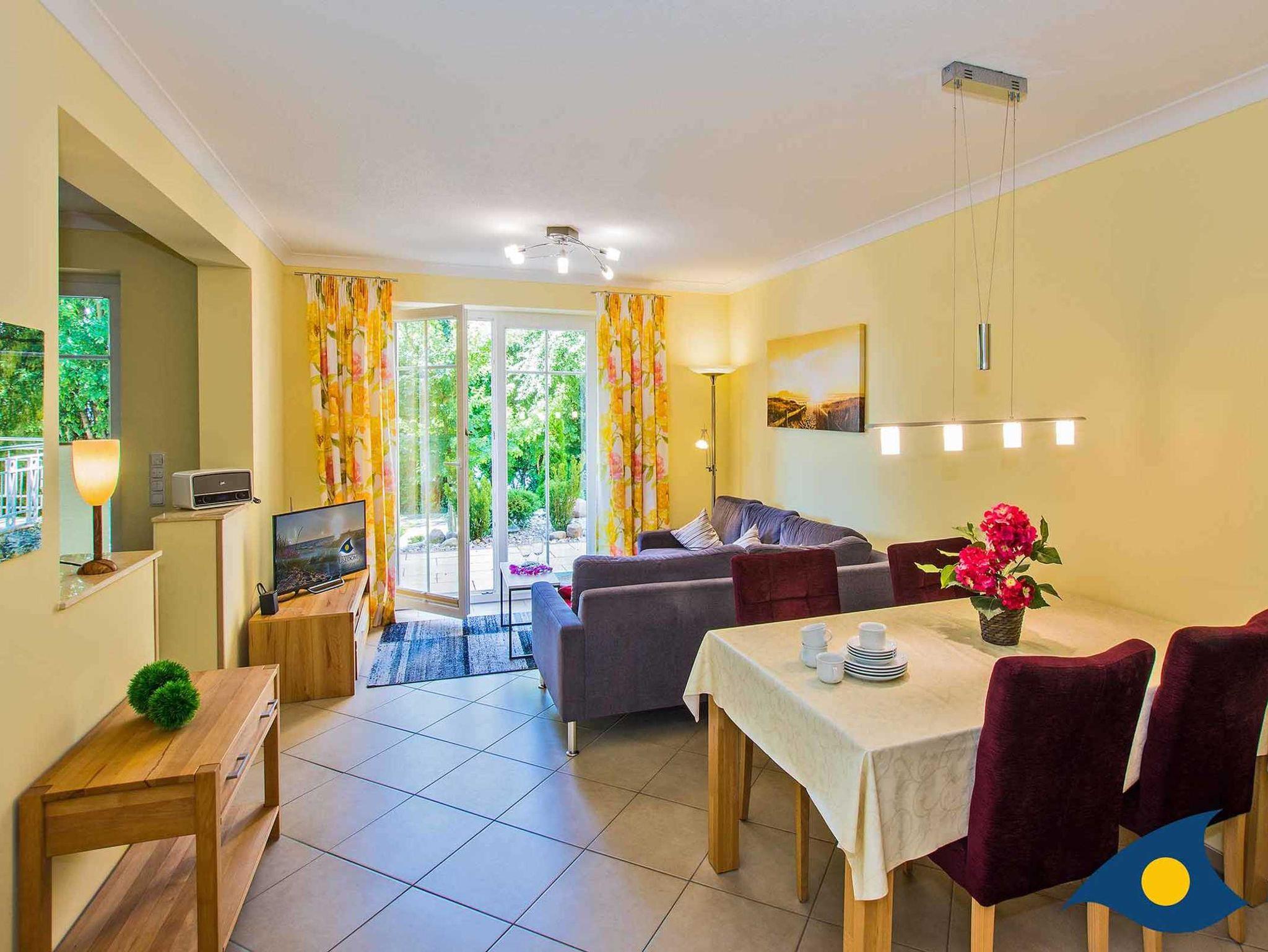 Das helle Wohnzimmer ist mit einem Esstisch für 4 Personen und einer gemütlichen Couchecke eingerichtet. LED-TV und ein Radio mit Bluetooth-Anschluss für ein Smartphone gehören zur Medienausstattung.