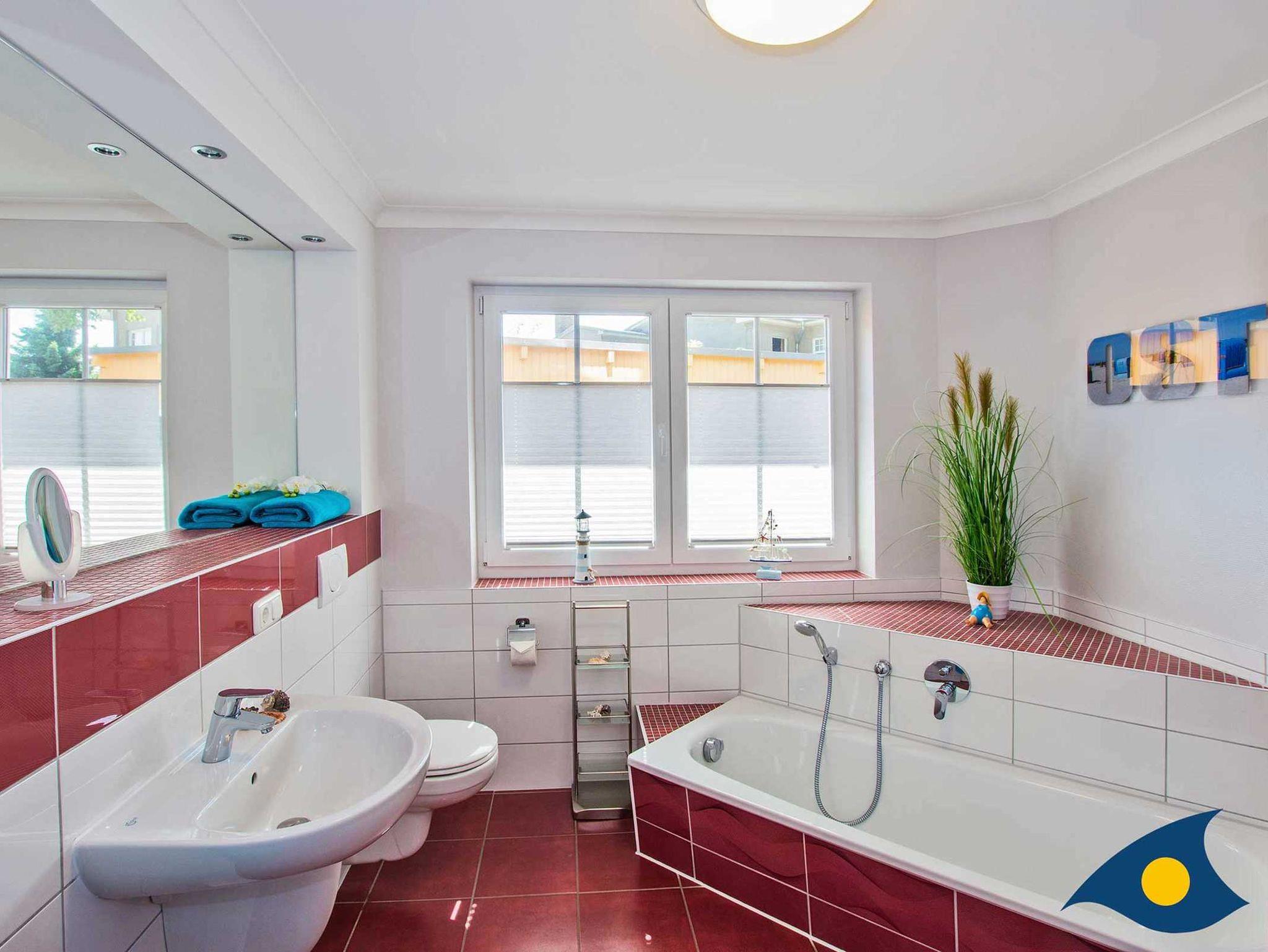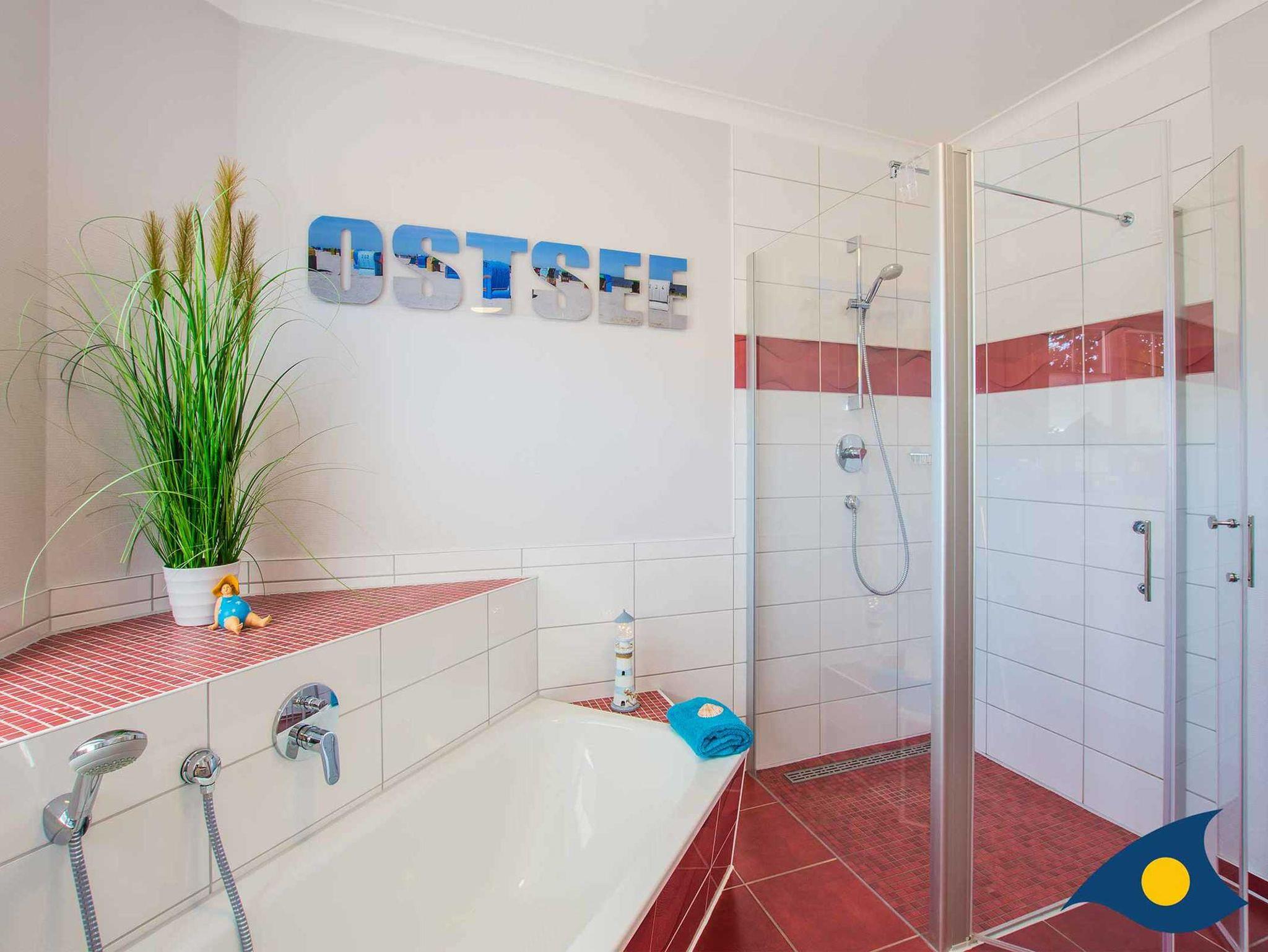 Zum komfortablen Badezimmer gehören Dusche, Badewanne und WC. Eine Waschmaschine steht im Abstellraum zur Verfügung.