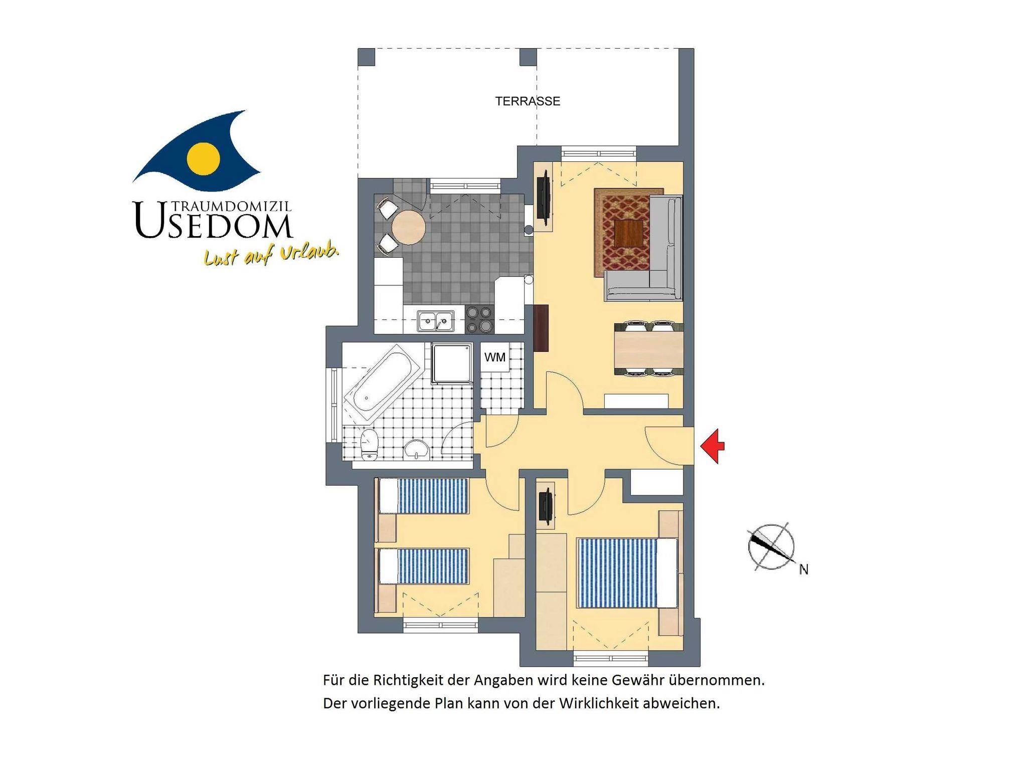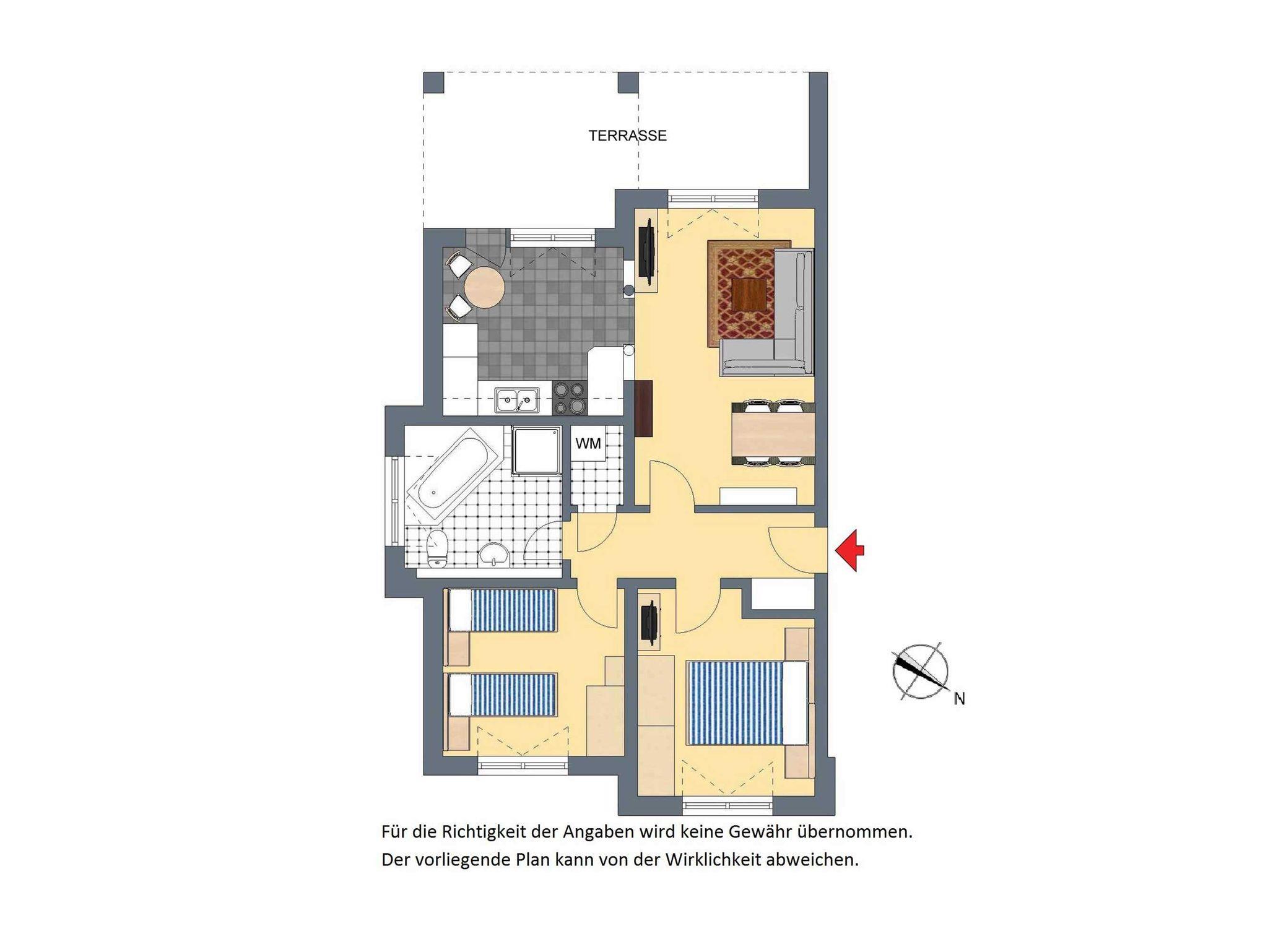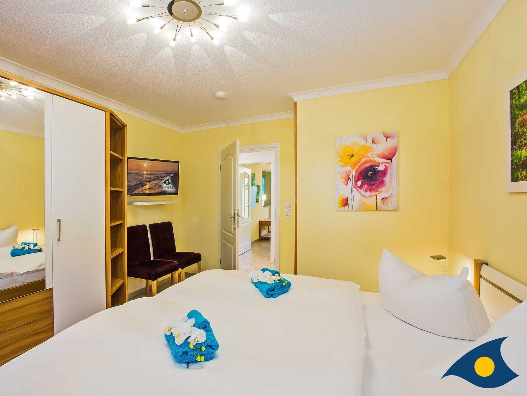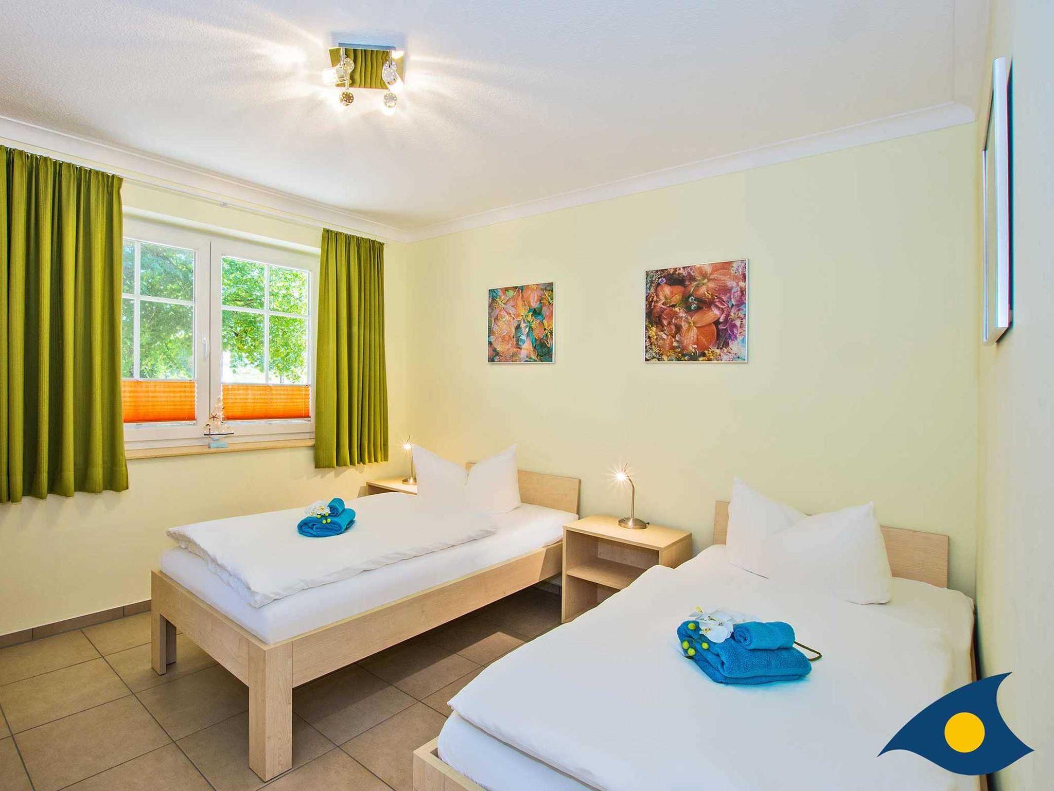 An den Wohnraum schließt sich über einen offenen Durchgang die moderne und komplett ausgestattete Vollküche an. Die beiden Schlafzimmer bieten ausreichend Schrankraum und sind mit Doppelbett bzw. mit zwei Einzelbetten ausgestattet, die bei Bedarf auch leicht zum Doppelbett kombinierbar sind.