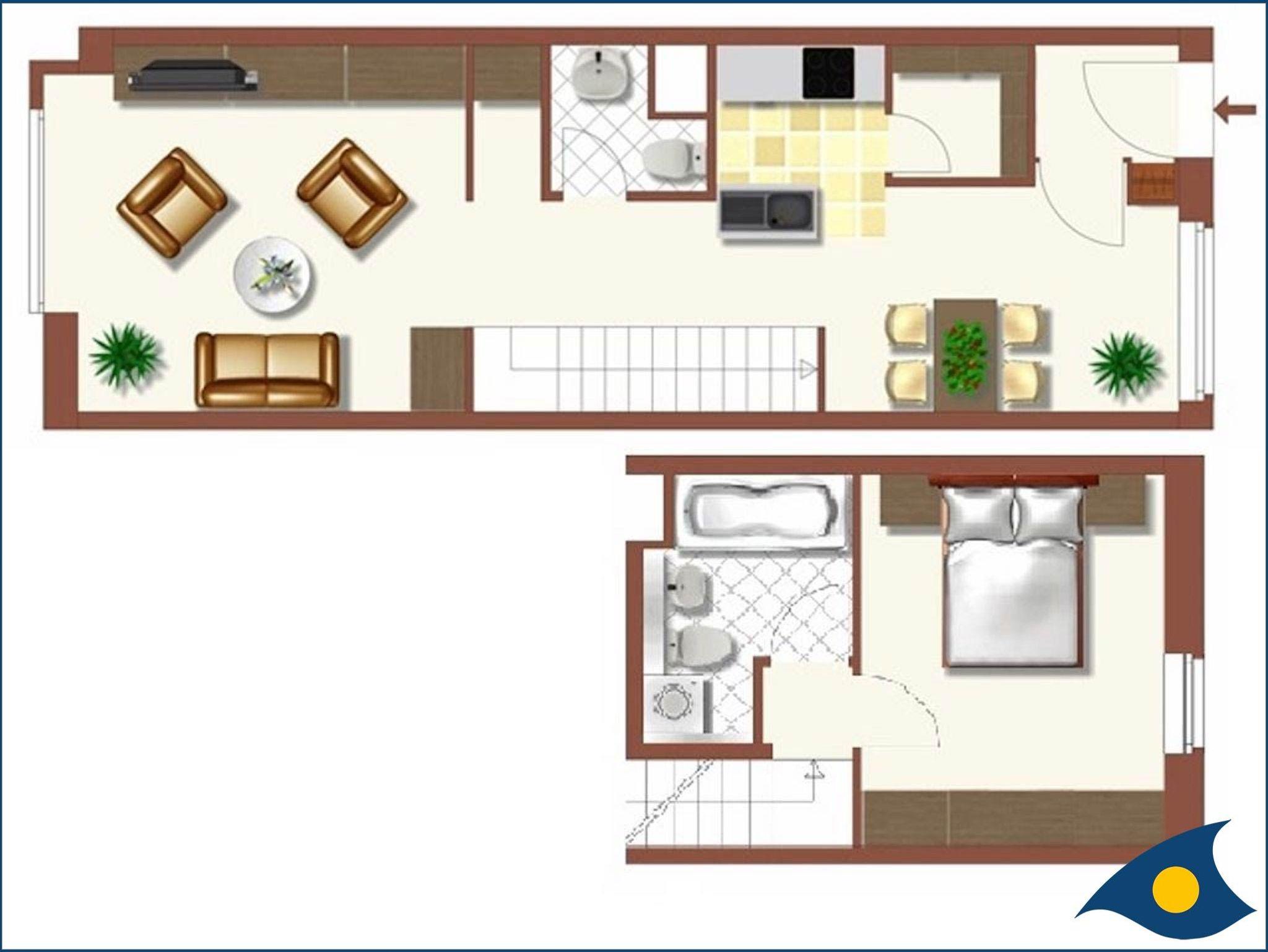 Das komfortabel eingerichtete Schlafzimmer im ersten Obergeschoß mit großem Doppelbett (180x200 cm) und einem geräumigen Kleiderschrank erreicht man über die gerade Treppe innerhalb der Wohnung. Das danebengelegene Badezimmer mit Badewanne, Haartrockner und Miele Waschmaschine lässt keine Wünsche offen.