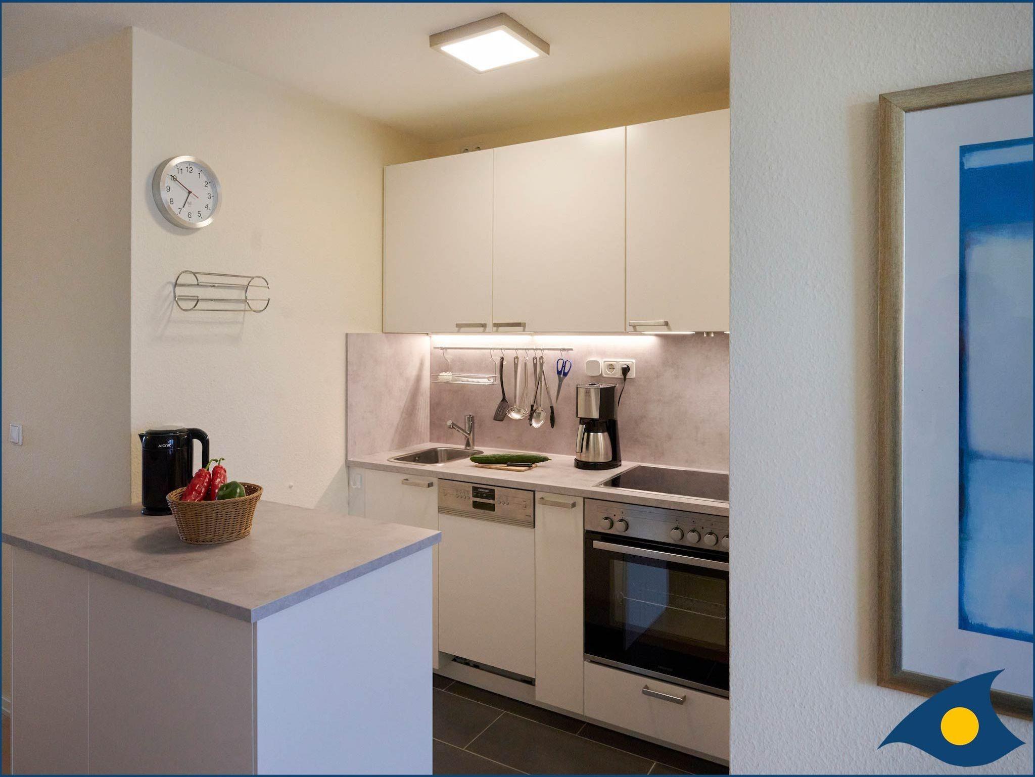 Die moderne Küche ist komplett eingerichtet und verfügt über einen Herd mit Ceranfeld und Backofen, einen Geschirrspüler, eine Kaffeemaschine, einen Wasserkocher sowie weitere elektrische Geräte. Im direkt erreichbaren Abstellraum befindet sich der große Kühlschrank mit Gefrierfach und eine Mikrowelle.