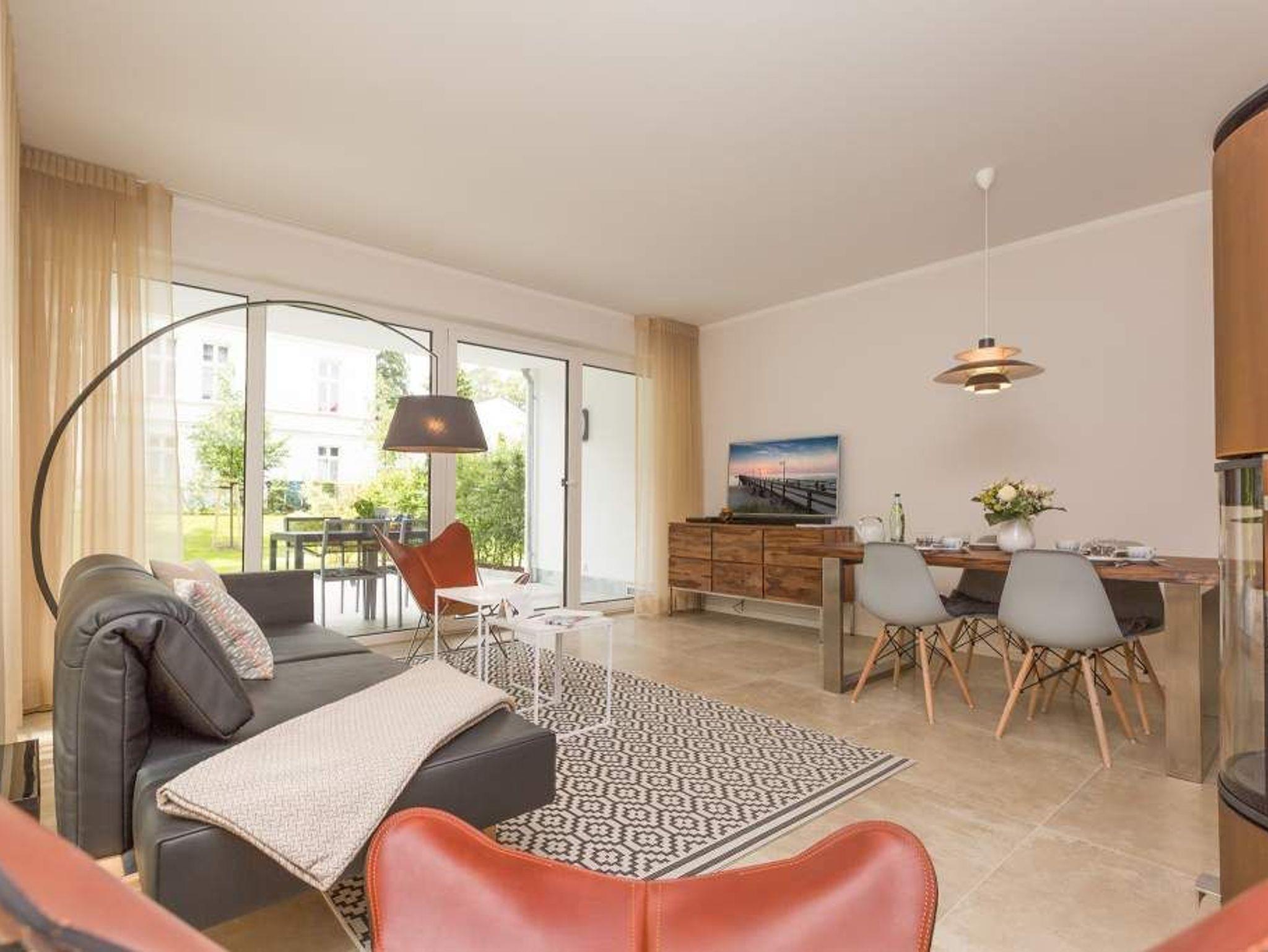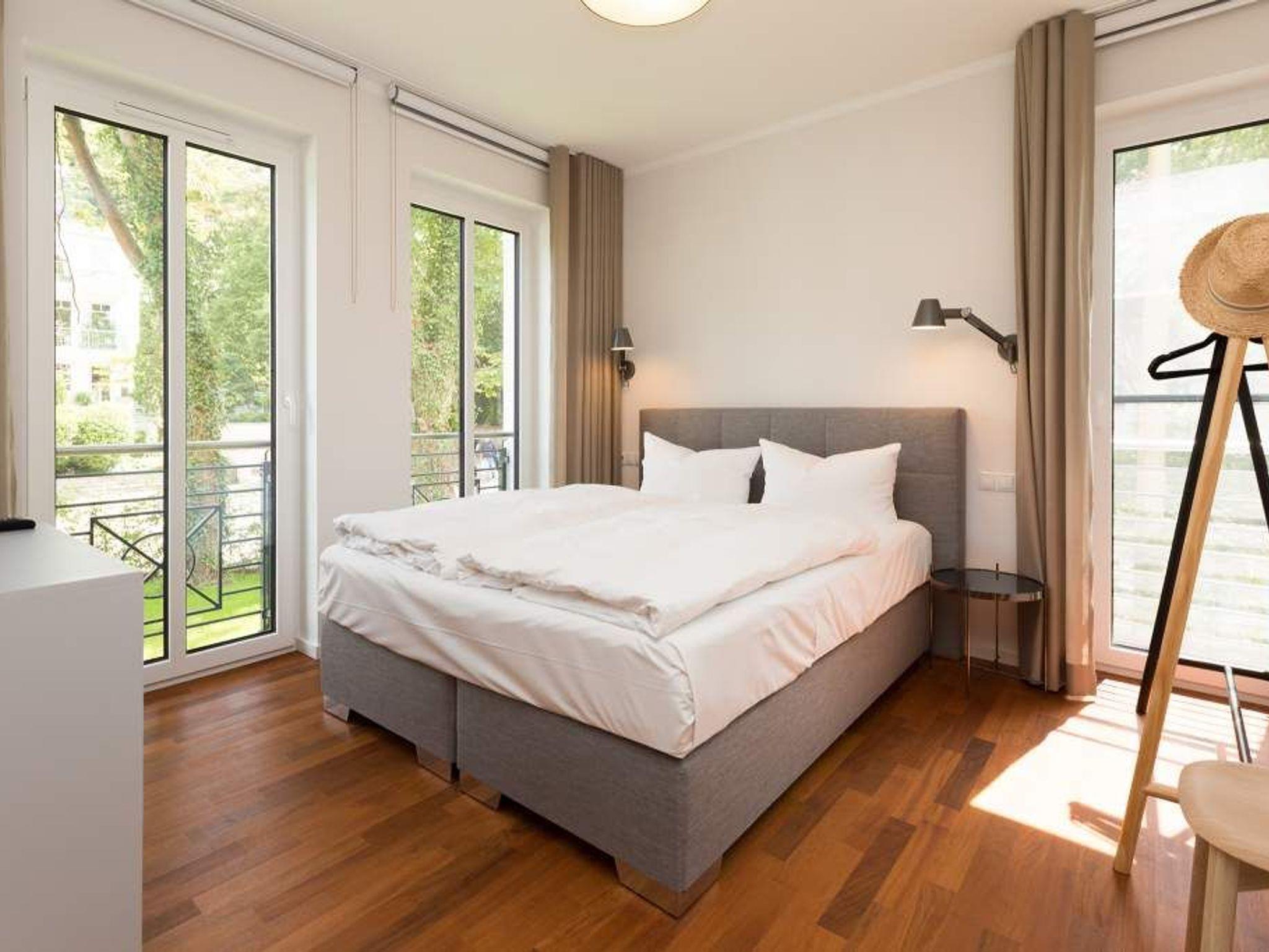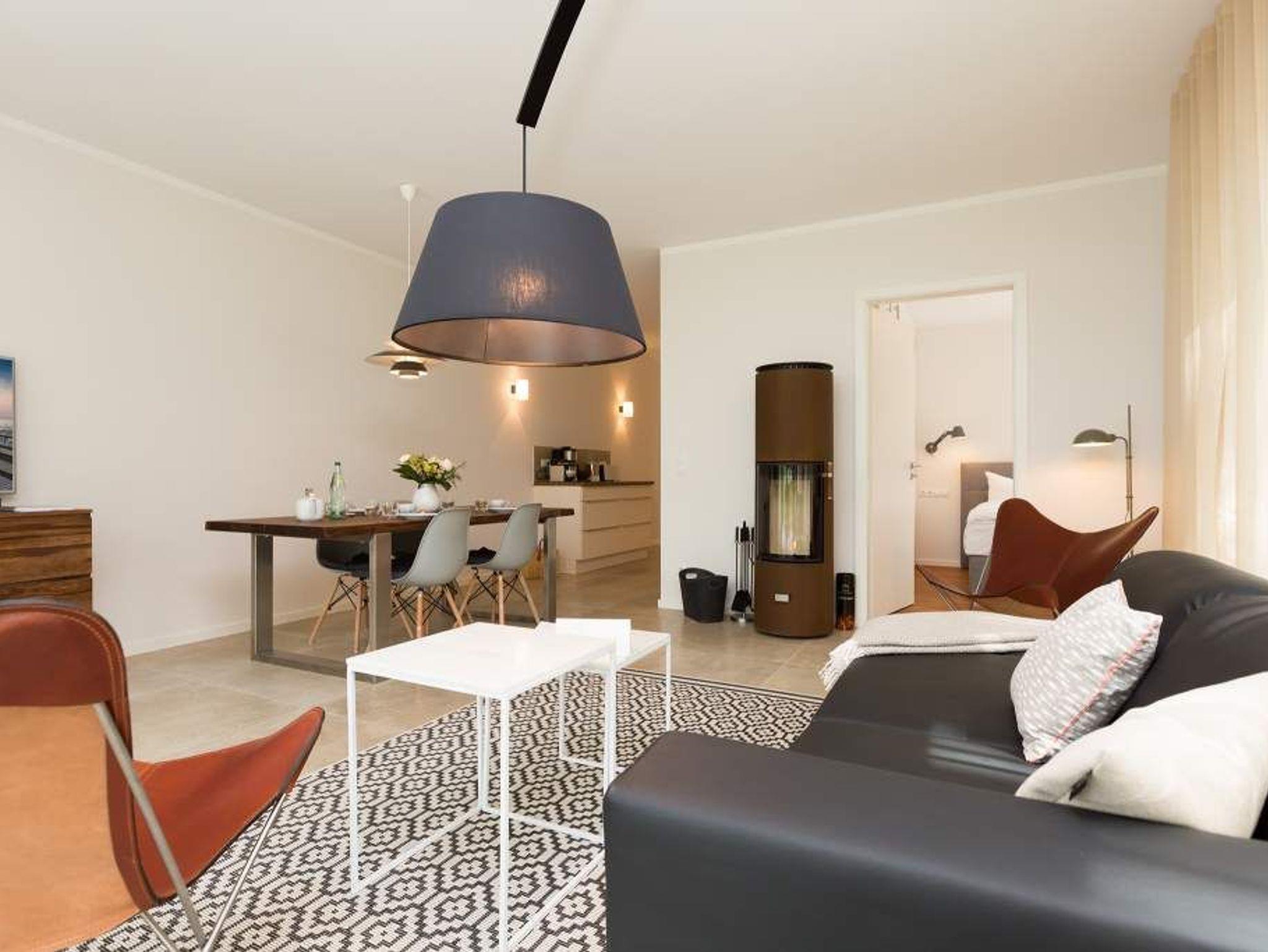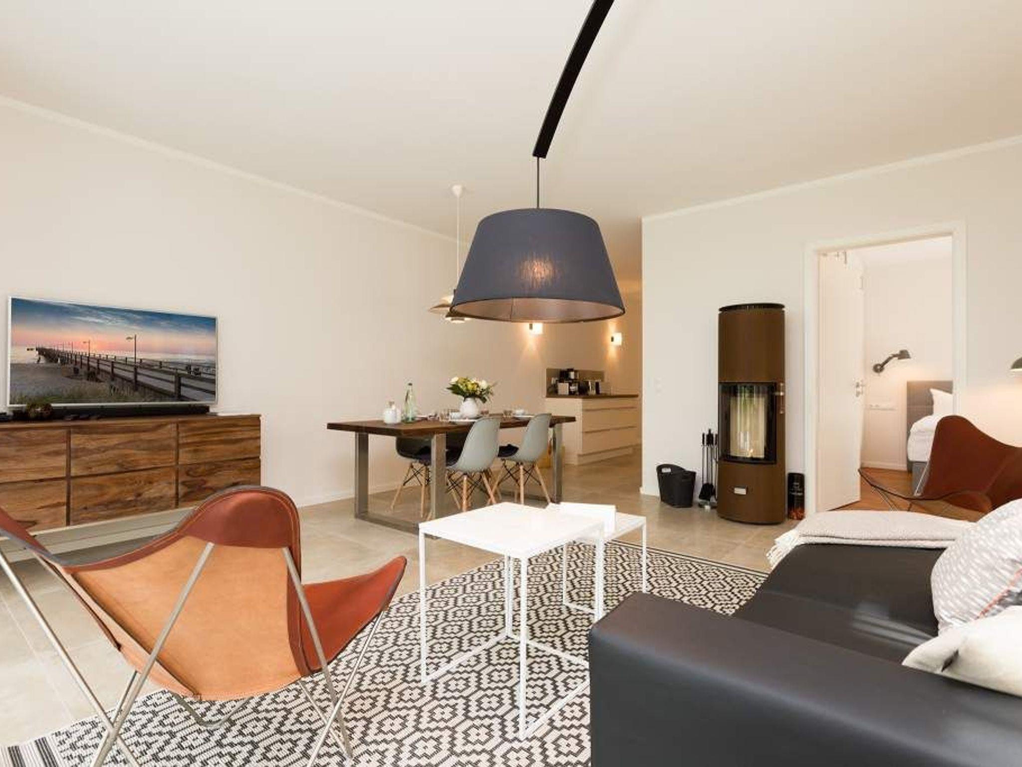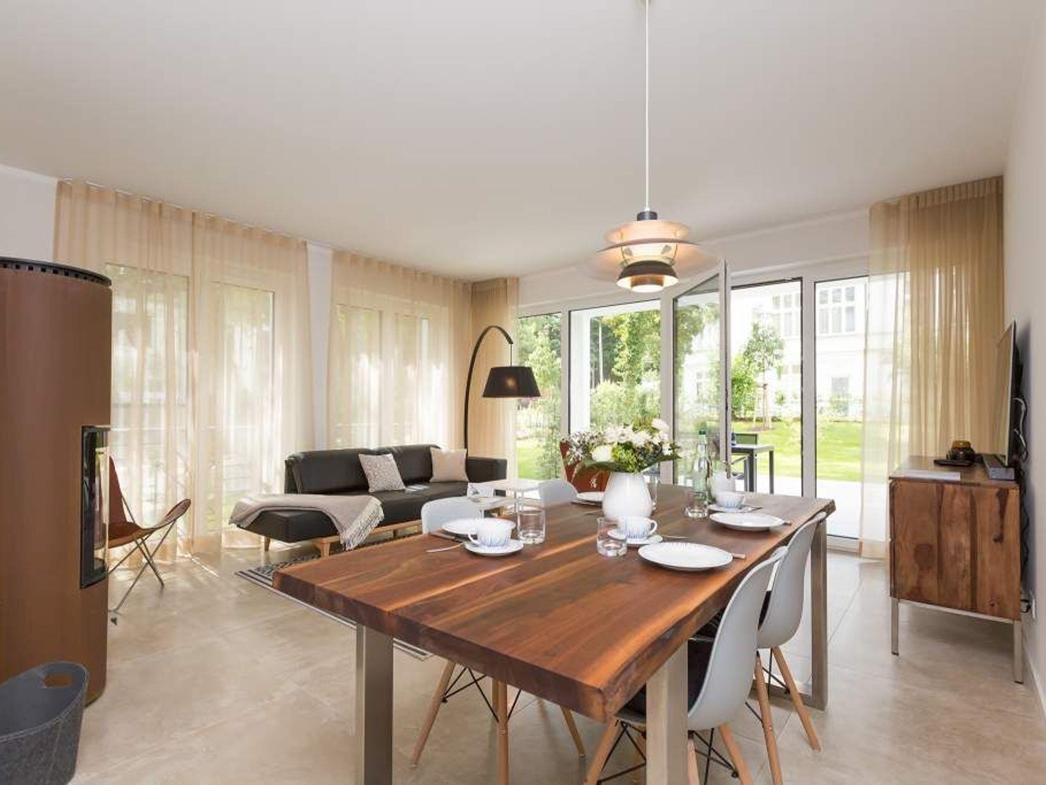 Zurücklehnen, die Beine ausstrecken, ein kühles Getränk vor sich auf dem Tisch, den Blick über das üppige Grün des Gartens schweifen lassen. Urlaub für die Seele. In der Wohnung Nummer 3 in der Villa Strandgrün ist das möglich. Egal ob auf der 30 Quadratmeter großen Gartenterrasse, im lichtdurchfluteten und mit Design-Möbeln eingerichteten Wohnzimmer oder der wohnungseigenen Panorama-Sauna ? in den 80 Quadratmetern dieses Ferienappartements wird das Wohlfühlen und Entspannen leicht gemacht. Vier Personen und ein Kleinkind (im Kinderreisebett) haben hier viel Platz zum Durchatmen. Schlicht, aber nobel ist Ihr Urlaubsdomizil vom Ledersofa, über die beiden Butterfly Sessel, die ausgefallene Bogenlampe bis hin zum behaglichen Musterteppich geprägt vom skandinavischen Design. Der Kaminofen sorgt an kühlen Tagen für wohlige Behaglichkeit. Der 49 Zoll-Flat-TV mit Blue Ray-Player ist ein echter Hingucker. Ein Highlight des Wohnzimmers, an das sich eine offene und hochwertig ausgestattete Küche anschließt, ist der große Echtholztisch mit den Vintage-Schalenstühlen. Für einen erholsamen und traumreichen Schlaf sorgen in den beiden Schlafzimmern die komfortablen Doppelboxspringbetten (1,60m x 2,00 m). In einem Schlafzimmer gibt es in den eigens angefertigten Einbauschränken reichlich Ablagemöglichkeiten. Beide Schlafzimmer verfügen ebenfalls über Flat-TVs. Eine Panoramasauna in einem der beiden geräumigen Bäder sorgt für den absoluten Wellnessgenuss. Beide Bäder haben darüber hinaus jeweils Dusche, Waschtisch und WC. Sogar eine Waschmaschine mit Trockner ist hier zu finden. Damit Sie sich so richtig entspannen können, sind die Betten bezogen und Handtücher liegen für Sie bereit. In der Tiefgarage ist ein Stellplatz reserviert. Für den Tag am Meer steht Ihnen ein Strandkorb am Strand von Mitte Mai bis September (je nach Witterung) zur Verfügung.