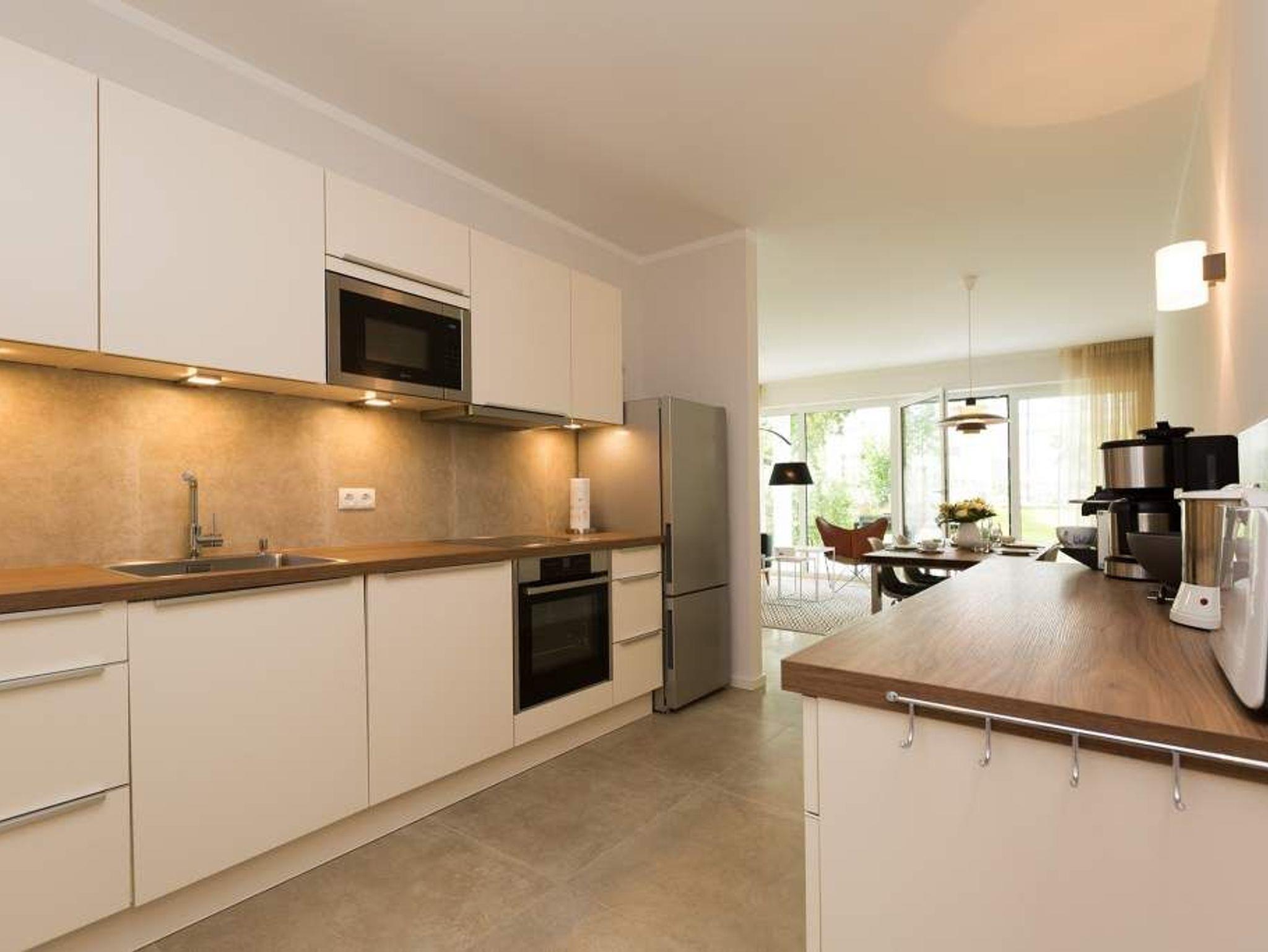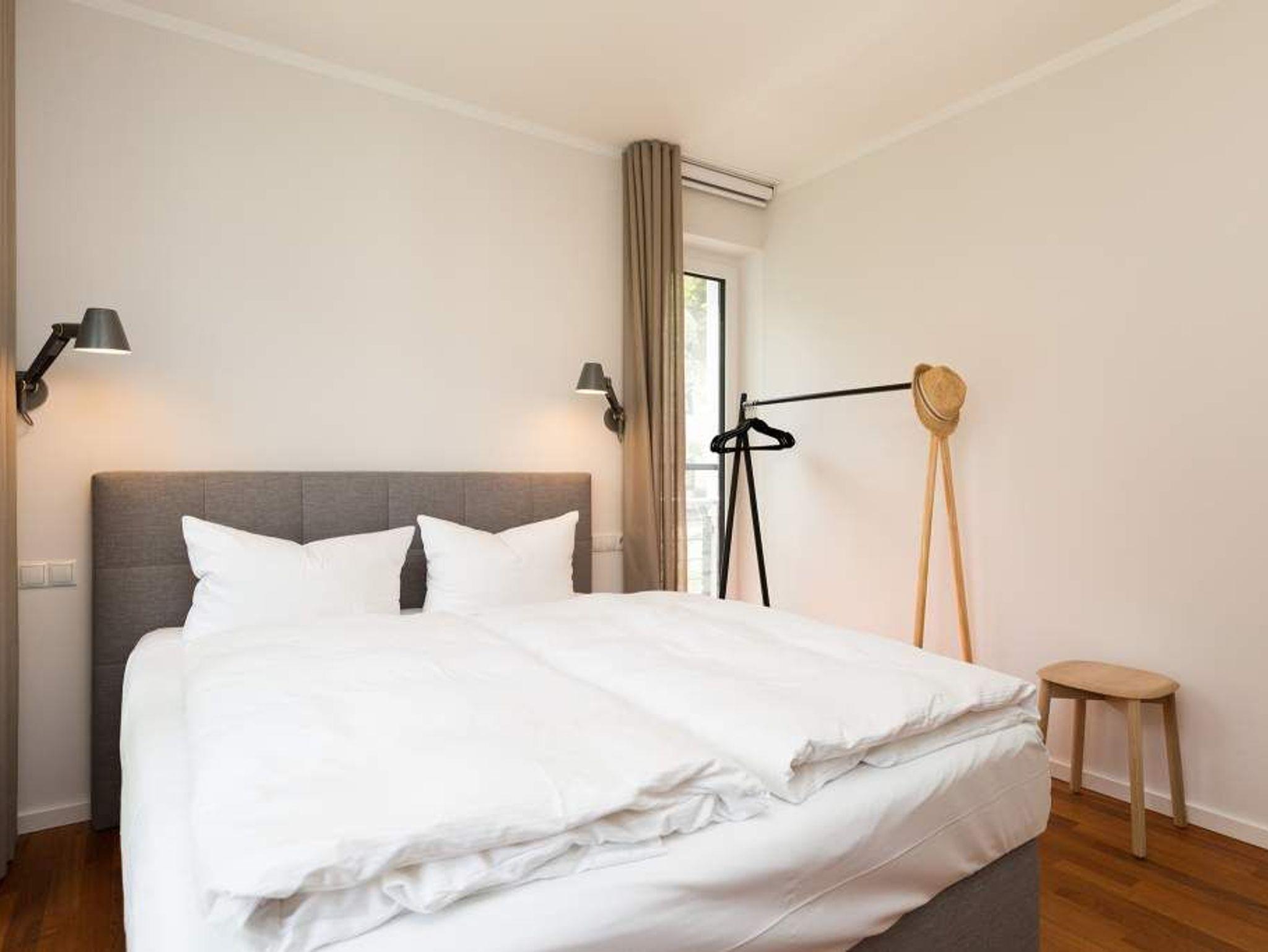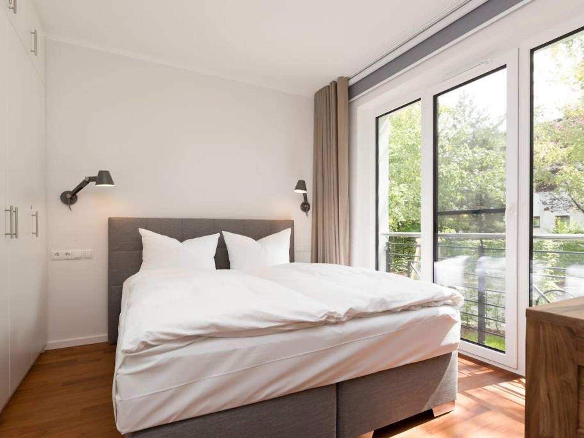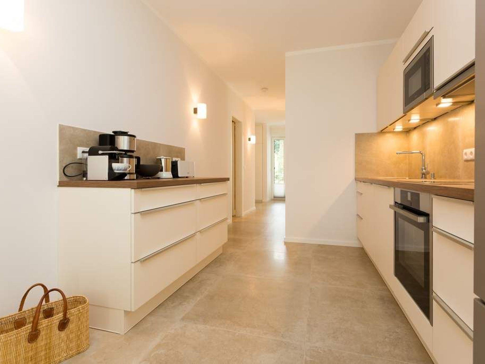 Zurücklehnen, die Beine ausstrecken, ein kühles Getränk vor sich auf dem Tisch, den Blick über das üppige Grün des Gartens schweifen lassen. Urlaub für die Seele. In der Wohnung Nummer 3 in der Villa Strandgrün ist das möglich. Egal ob auf der 30 Quadratmeter großen Gartenterrasse, im lichtdurchfluteten und mit Design-Möbeln eingerichteten Wohnzimmer oder der wohnungseigenen Panorama-Sauna ? in den 80 Quadratmetern dieses Ferienappartements wird das Wohlfühlen und Entspannen leicht gemacht. Vier Personen und ein Kleinkind (im Kinderreisebett) haben hier viel Platz zum Durchatmen. Schlicht, aber nobel ist Ihr Urlaubsdomizil vom Ledersofa, über die beiden Butterfly Sessel, die ausgefallene Bogenlampe bis hin zum behaglichen Musterteppich geprägt vom skandinavischen Design. Der Kaminofen sorgt an kühlen Tagen für wohlige Behaglichkeit. Der 49 Zoll-Flat-TV mit Blue Ray-Player ist ein echter Hingucker. Ein Highlight des Wohnzimmers, an das sich eine offene und hochwertig ausgestattete Küche anschließt, ist der große Echtholztisch mit den Vintage-Schalenstühlen. Für einen erholsamen und traumreichen Schlaf sorgen in den beiden Schlafzimmern die komfortablen Doppelboxspringbetten (1,60m x 2,00 m). In einem Schlafzimmer gibt es in den eigens angefertigten Einbauschränken reichlich Ablagemöglichkeiten. Beide Schlafzimmer verfügen ebenfalls über Flat-TVs. Eine Panoramasauna in einem der beiden geräumigen Bäder sorgt für den absoluten Wellnessgenuss. Beide Bäder haben darüber hinaus jeweils Dusche, Waschtisch und WC. Sogar eine Waschmaschine mit Trockner ist hier zu finden. Damit Sie sich so richtig entspannen können, sind die Betten bezogen und Handtücher liegen für Sie bereit. In der Tiefgarage ist ein Stellplatz reserviert. Für den Tag am Meer steht Ihnen ein Strandkorb am Strand von Mitte Mai bis September (je nach Witterung) zur Verfügung.