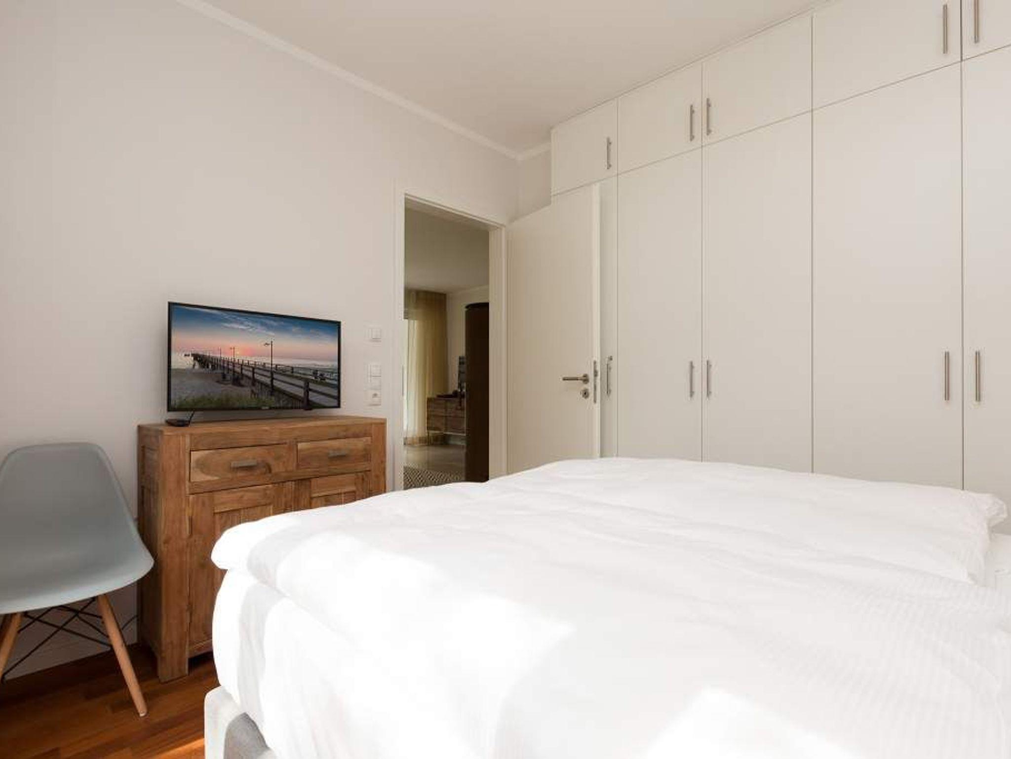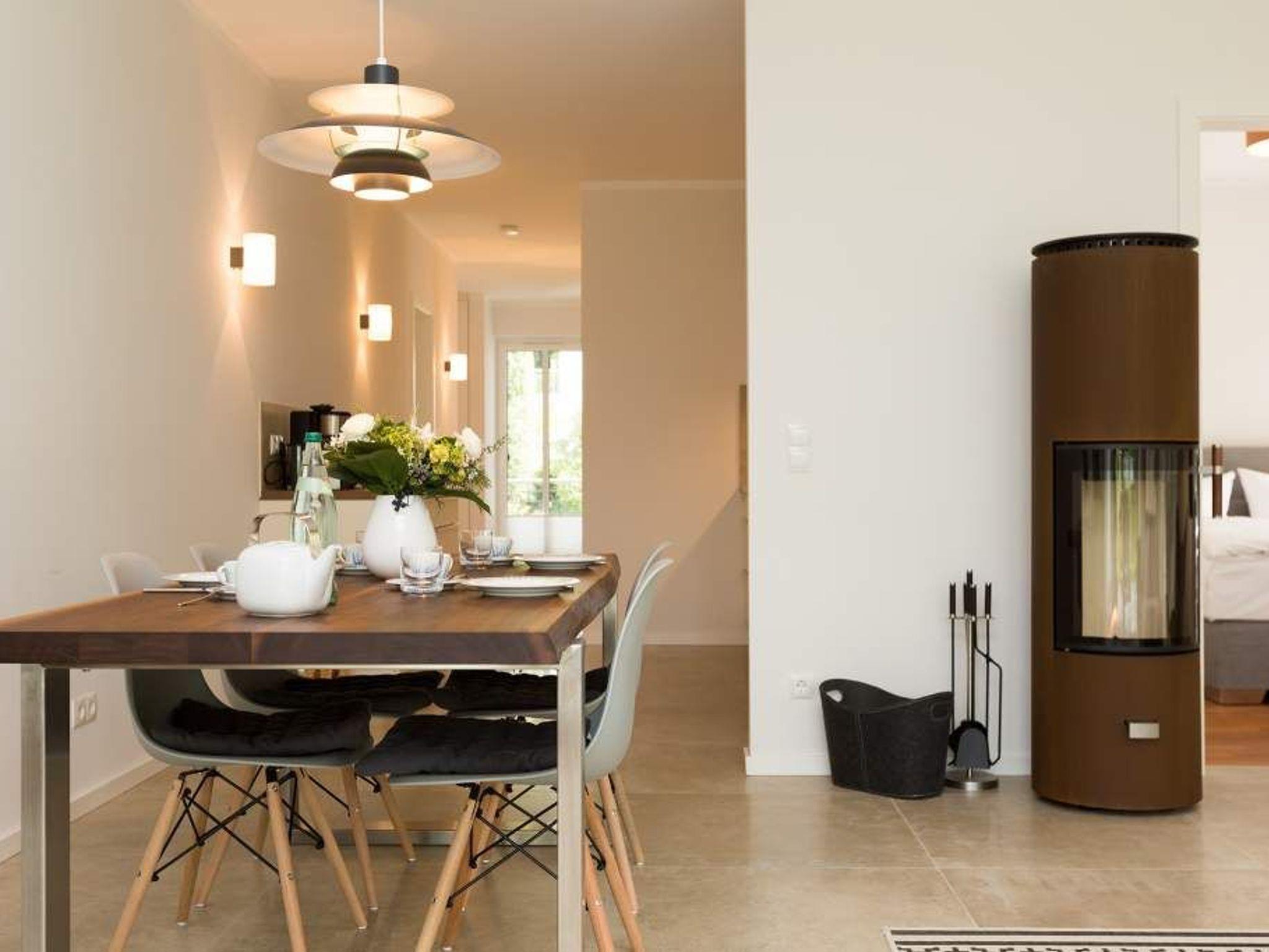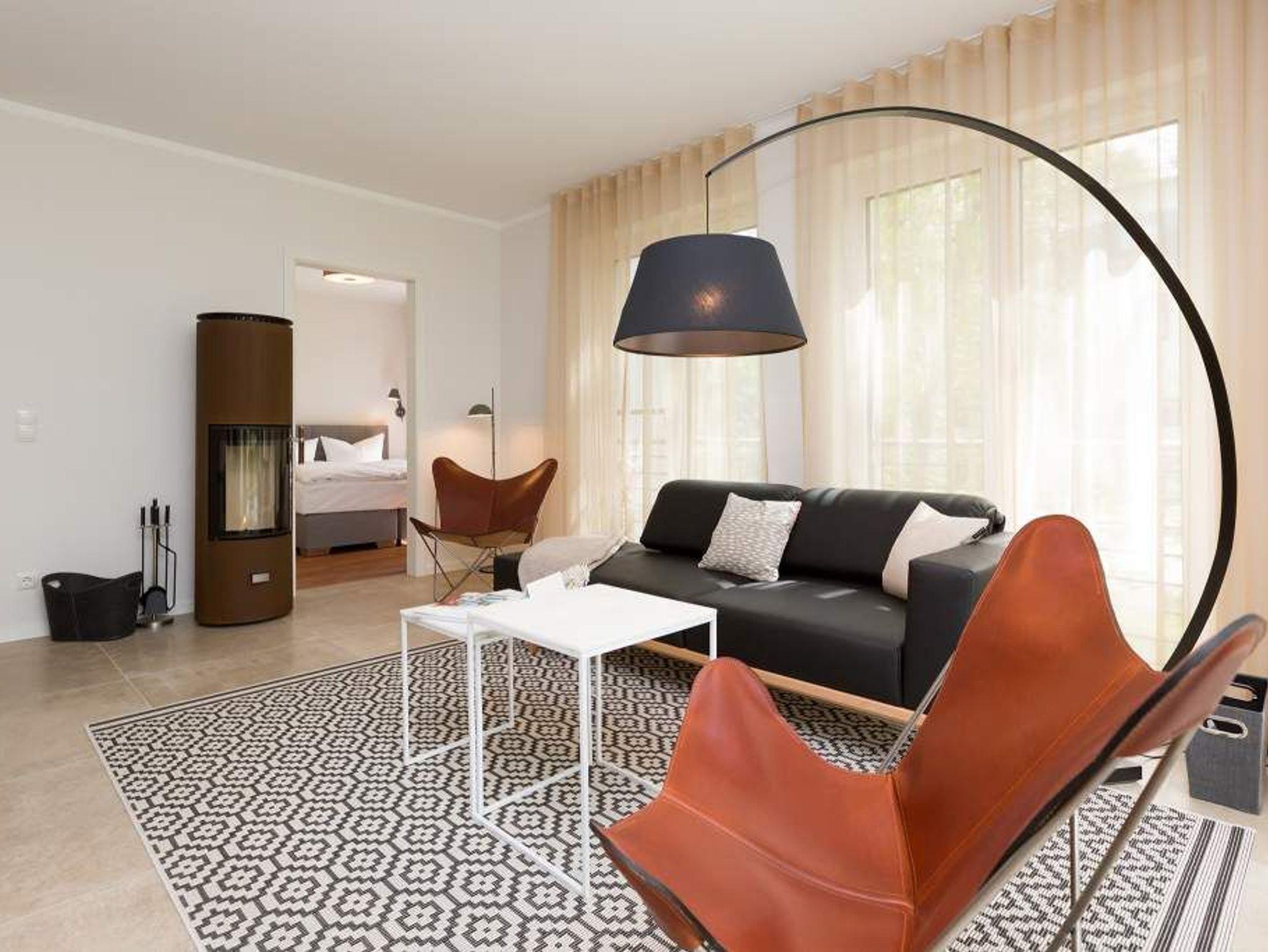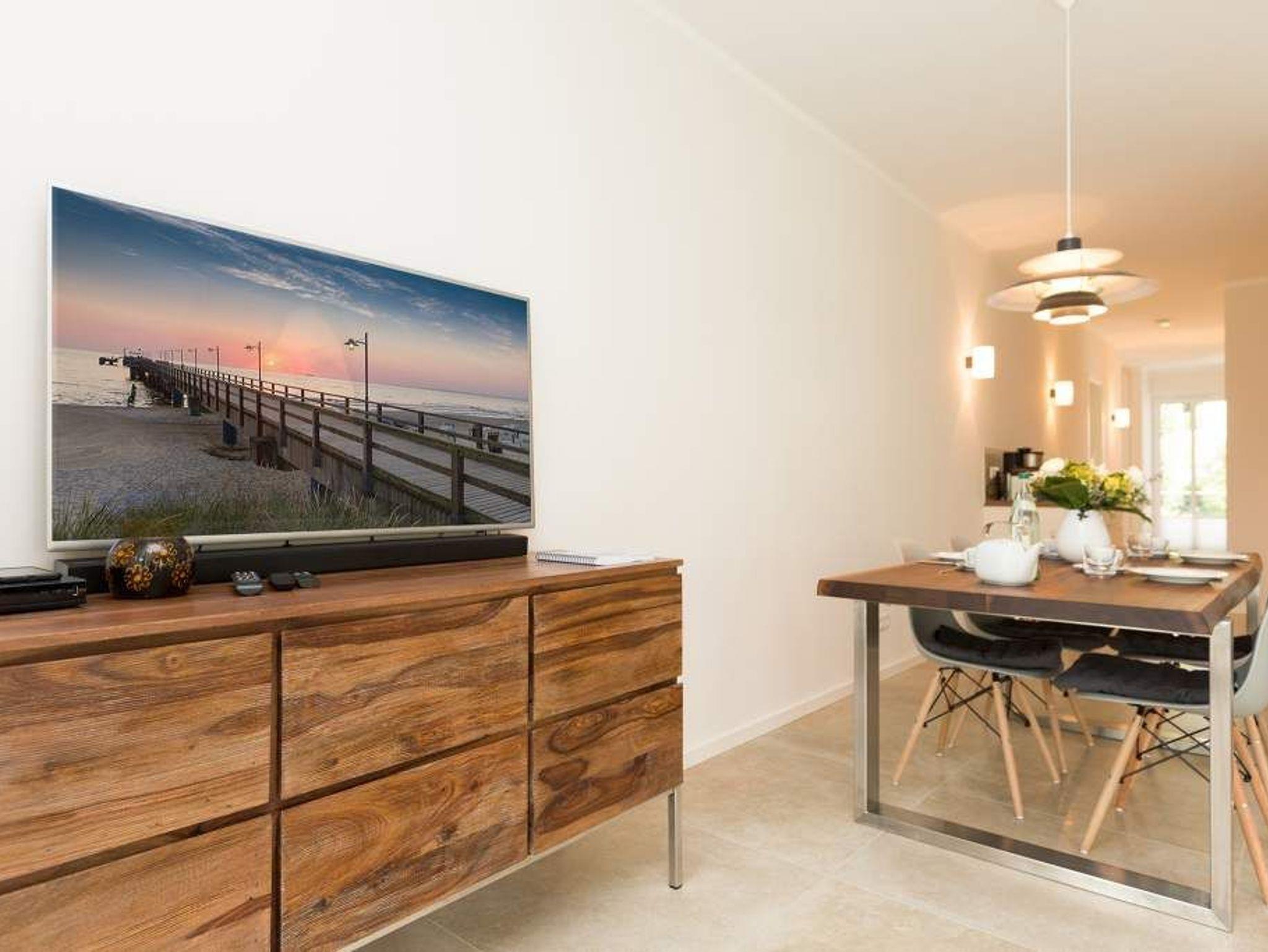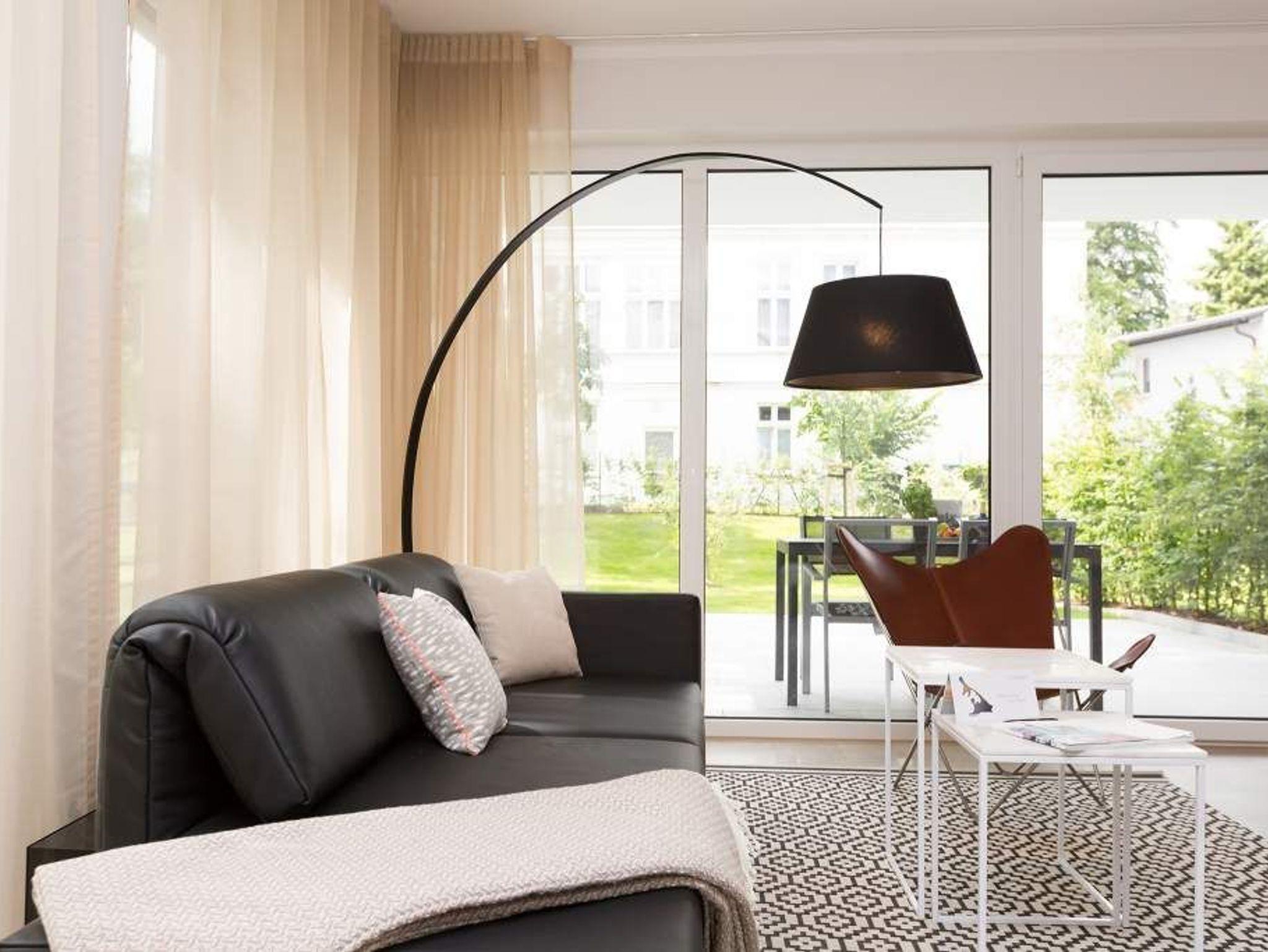 Zurücklehnen, die Beine ausstrecken, ein kühles Getränk vor sich auf dem Tisch, den Blick über das üppige Grün des Gartens schweifen lassen. Urlaub für die Seele. In der Wohnung Nummer 3 in der Villa Strandgrün ist das möglich. Egal ob auf der 30 Quadratmeter großen Gartenterrasse, im lichtdurchfluteten und mit Design-Möbeln eingerichteten Wohnzimmer oder der wohnungseigenen Panorama-Sauna ? in den 80 Quadratmetern dieses Ferienappartements wird das Wohlfühlen und Entspannen leicht gemacht. Vier Personen und ein Kleinkind (im Kinderreisebett) haben hier viel Platz zum Durchatmen. Schlicht, aber nobel ist Ihr Urlaubsdomizil vom Ledersofa, über die beiden Butterfly Sessel, die ausgefallene Bogenlampe bis hin zum behaglichen Musterteppich geprägt vom skandinavischen Design. Der Kaminofen sorgt an kühlen Tagen für wohlige Behaglichkeit. Der 49 Zoll-Flat-TV mit Blue Ray-Player ist ein echter Hingucker. Ein Highlight des Wohnzimmers, an das sich eine offene und hochwertig ausgestattete Küche anschließt, ist der große Echtholztisch mit den Vintage-Schalenstühlen. Für einen erholsamen und traumreichen Schlaf sorgen in den beiden Schlafzimmern die komfortablen Doppelboxspringbetten (1,60m x 2,00 m). In einem Schlafzimmer gibt es in den eigens angefertigten Einbauschränken reichlich Ablagemöglichkeiten. Beide Schlafzimmer verfügen ebenfalls über Flat-TVs. Eine Panoramasauna in einem der beiden geräumigen Bäder sorgt für den absoluten Wellnessgenuss. Beide Bäder haben darüber hinaus jeweils Dusche, Waschtisch und WC. Sogar eine Waschmaschine mit Trockner ist hier zu finden. Damit Sie sich so richtig entspannen können, sind die Betten bezogen und Handtücher liegen für Sie bereit. In der Tiefgarage ist ein Stellplatz reserviert. Für den Tag am Meer steht Ihnen ein Strandkorb am Strand von Mitte Mai bis September (je nach Witterung) zur Verfügung.