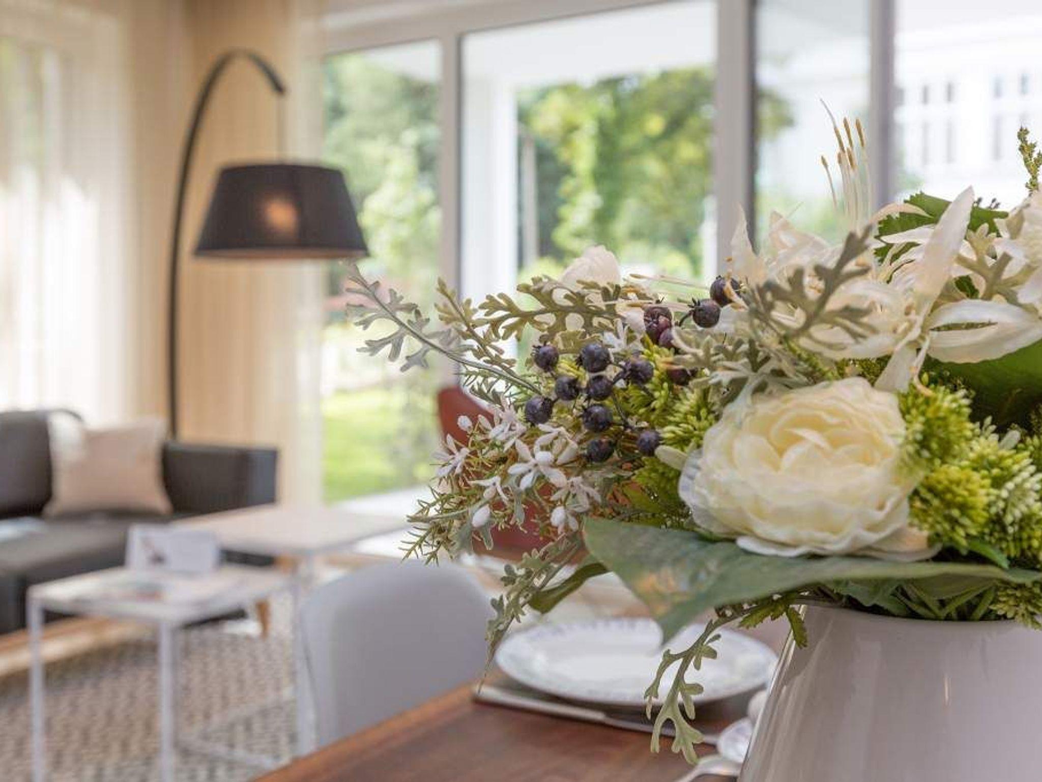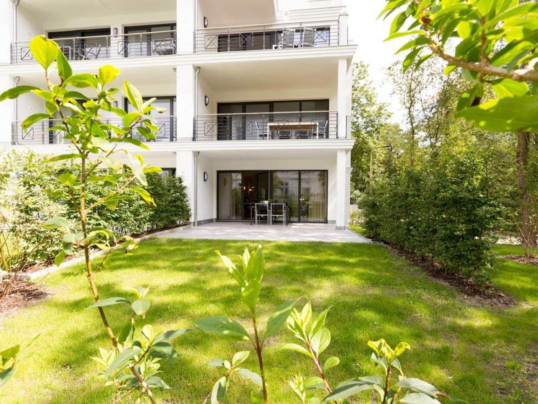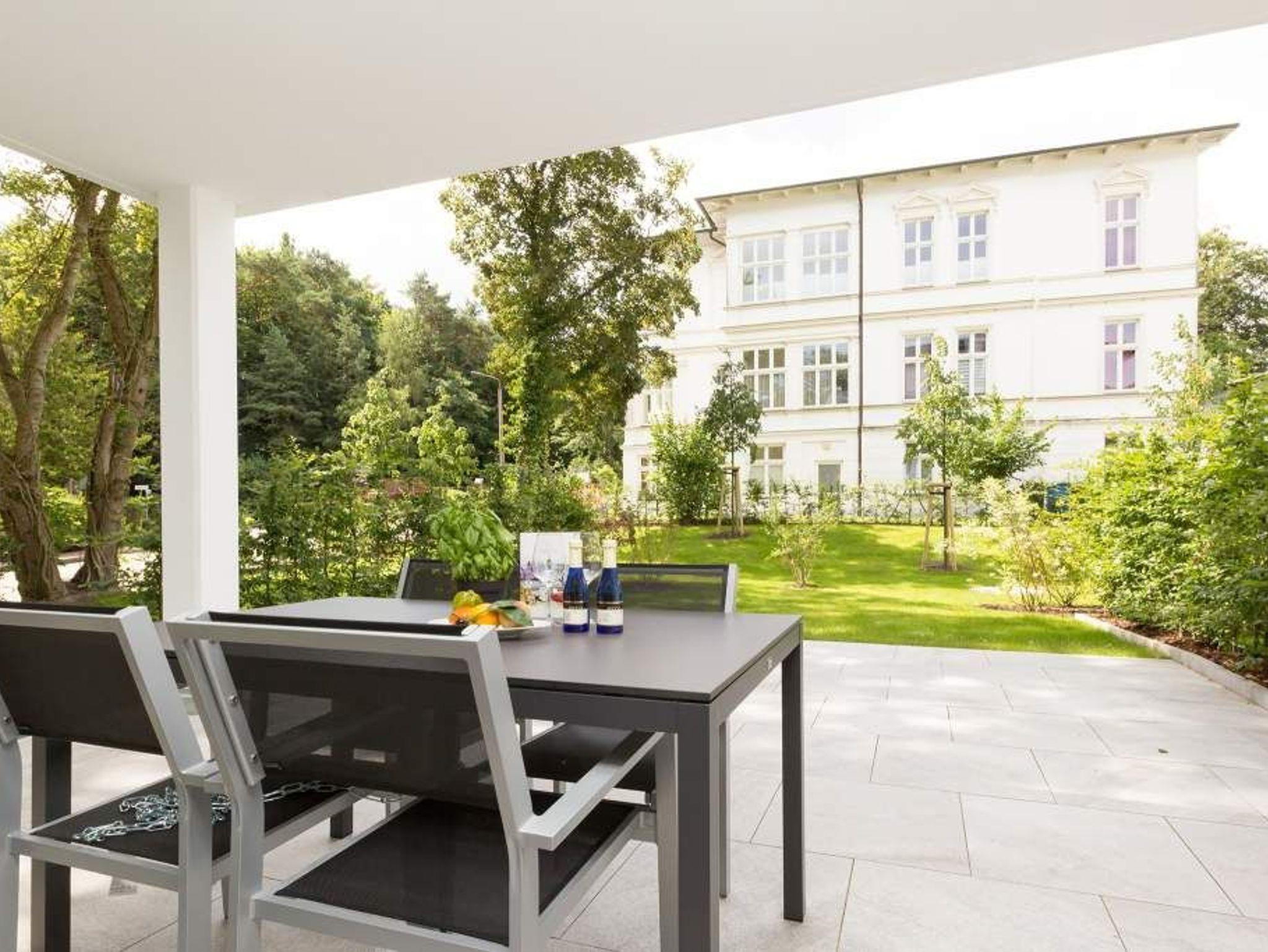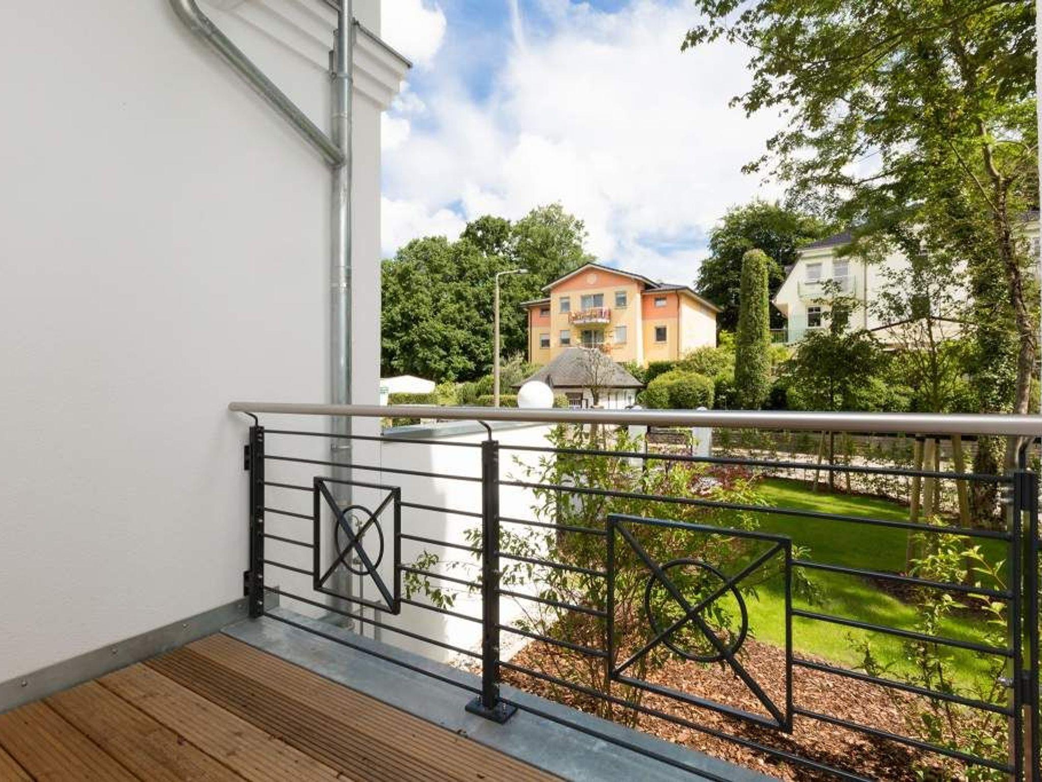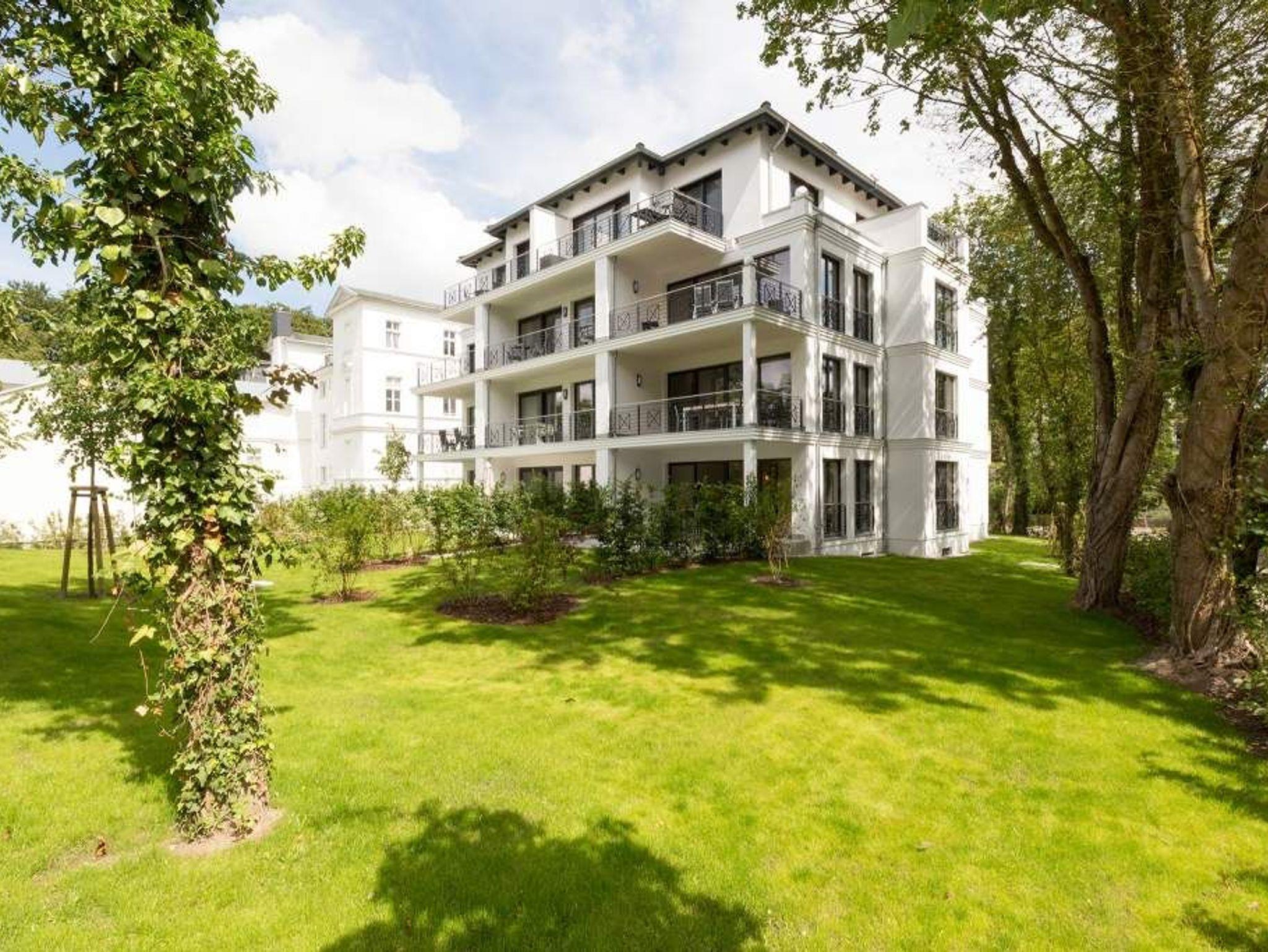 Vogelzwitschern und das sanfte Rauschen der Ostsee: Umgeben von wunderschönen, alten Bäumen atmet die 2017 fertig gestellte Villa Strandgrün das Flair der sie umgebenden Bädervillen. Mit seinen Balkonen und Erkern, die die Fassade untergliedern und auflockern, passt sich das strandnahe (100 Meter) Urlaubsdomizil angenehm in das Bild der aufwendig sanierten Villen um sie herum ein und wirkt selbst wie eine Weiterführung der einst mondänen Architektur des 19. Jahrhunderts. Das stilvolle Äußere setzt sich im exklusiven und eleganten Wohndesign im Inneren fort. Jede Ferienwohnung verfügt über eine Sonnenterrasse oder mehrere Balkone. Besondere Highlights eines jeden Appartements sind der Kamin, eine Sauna und je zwei Bäder bzw. ein zusätzliches Gäste WC. Die großzügigen 3- und 4-Raum-Suiten wurden mit allem Komfort konzipiert und ausgestattet. Vom ASA-Geschirr bis zu den hochwertigen Designmöbeln steht das Wohlfühlen an erster Stelle. In der Tiefgarage gibt es für jedes Appartement einen Stellplatz. Außerdem steht für jede Wohnung ein Briefkasten am Haus zur Verfügung.