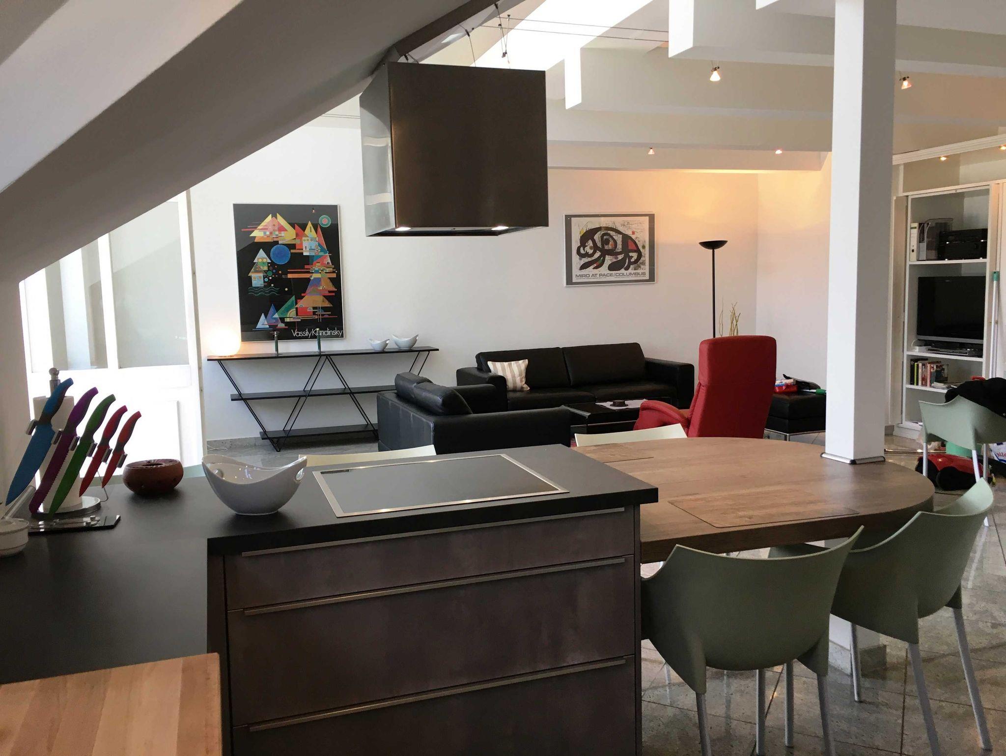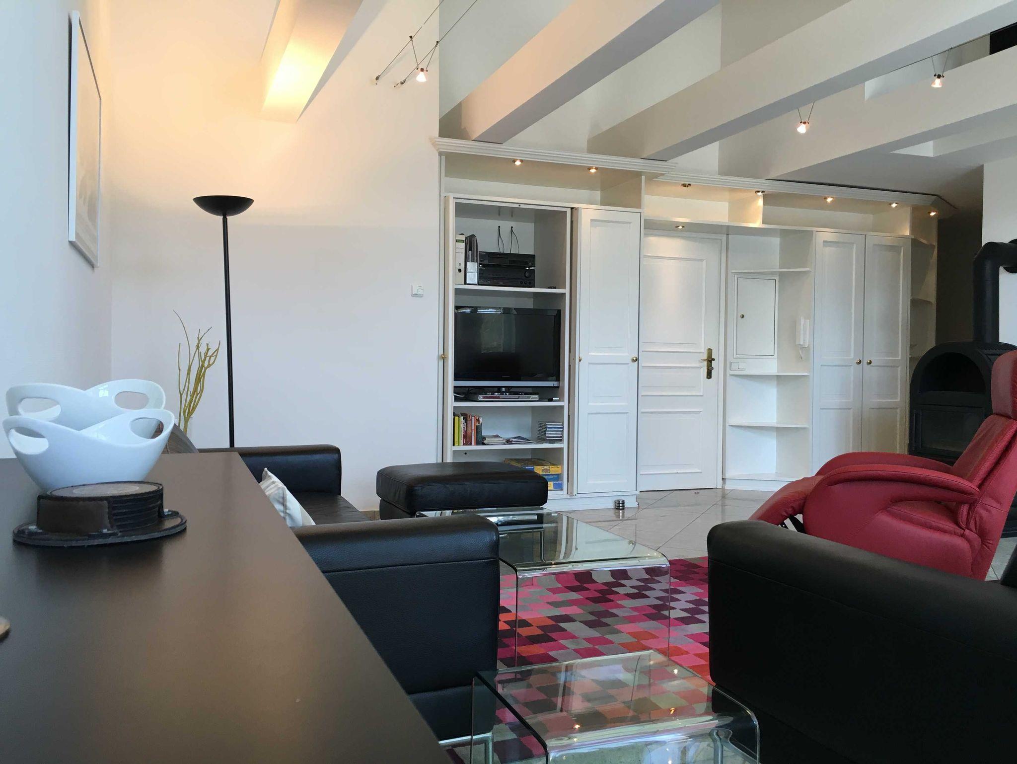 Dreiraumwohnung mit Fußbodenheizung im 3. Obergeschoss mit großem, modern und komfortabel möblierten Wohnbereich. Zwei Ledercouchen und ein gemütlicher Relaxsessel bieten Platz für die ganze Familie. Ein Kaminofen schaftt Gemütlichkeit zu jeder Jahreszeit. Das Mediencenter verschwindet im Einbauschrank. Ausgebaute Dachschrägen vermittel ein Gefühl von Freiheit . Am Küchen- Thresen könne Groß und Klein gemeinsam sitzen. Die neue Küche lässt keine Wünsche offen ( Geschirrspüler, Mikrowelle, Backofen, Induktionsfeld ) und genügend Platz als Arbeitsfläche.