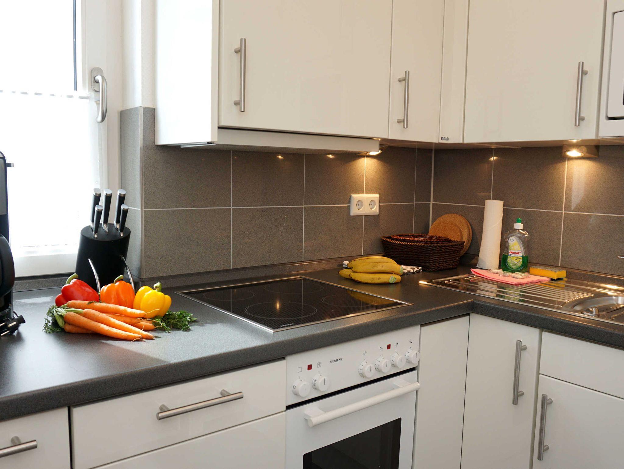 In der Küche, die durch eine Schiebetür vom Wohn-/Schlafraum getrennt ist, finden Sie die vollständige hochwertige Markenausstattung für ihren Aufenthalt. Daran schließt sich im Wohn-/Schlafraum ein großer Esstisch an.