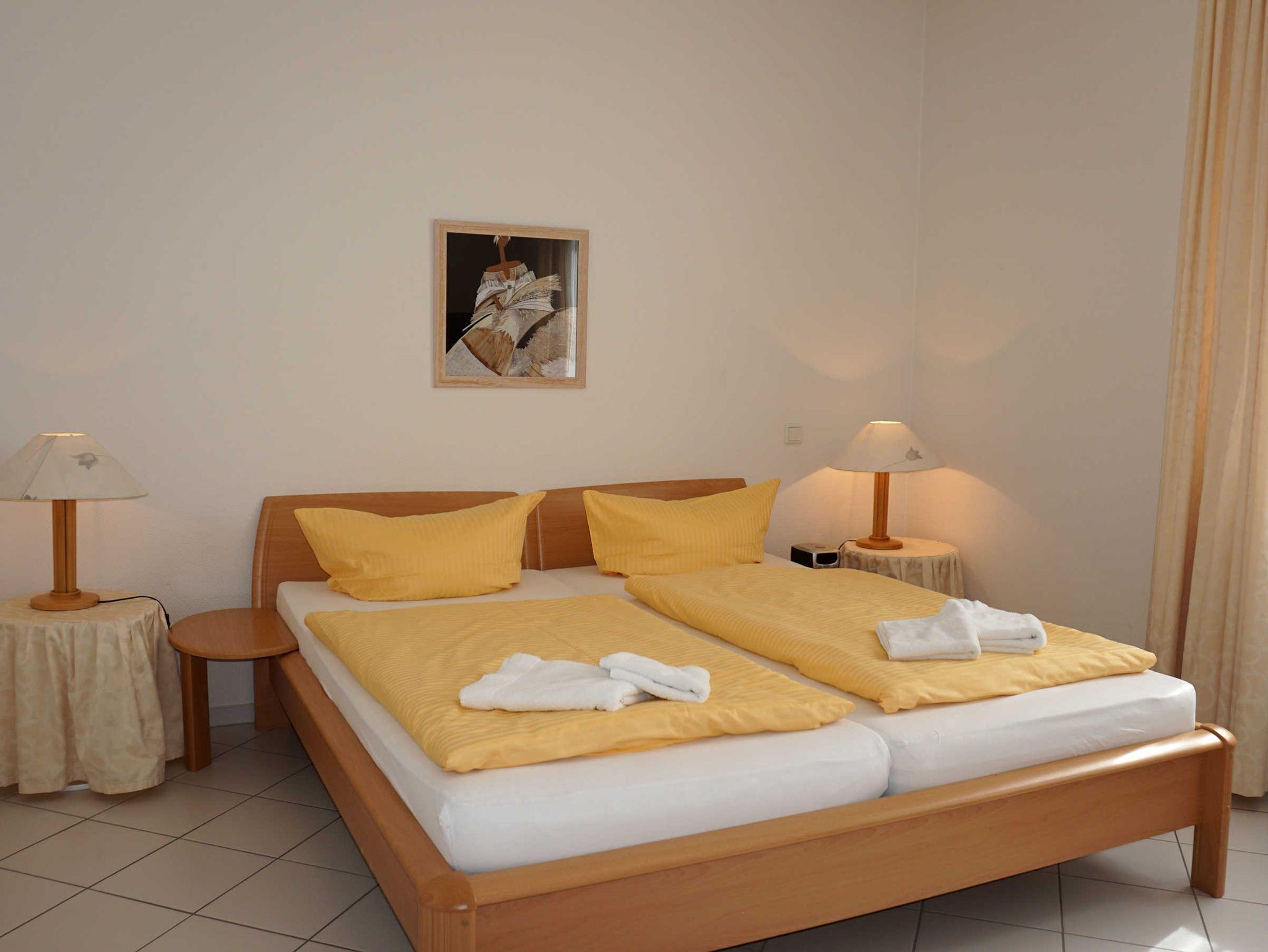 Die 74m²- Ferienwohnung erreichen Sie zu Fuß oder mit dem Lift. Sie verfügt über einen großen Wohn-/ Schlafraum, eine separate Küche, ein Schlafzimmer, ein eigenes separates Duschbad und ein Badezimmer mit Badewanne. Das Bad erreichen Sie direkt vom Schlafzimmer. Dieses ist mit Doppelbett, Kleiderschrank, 2 Polsterstühlen, Radio und Fernseher ausgestattet.