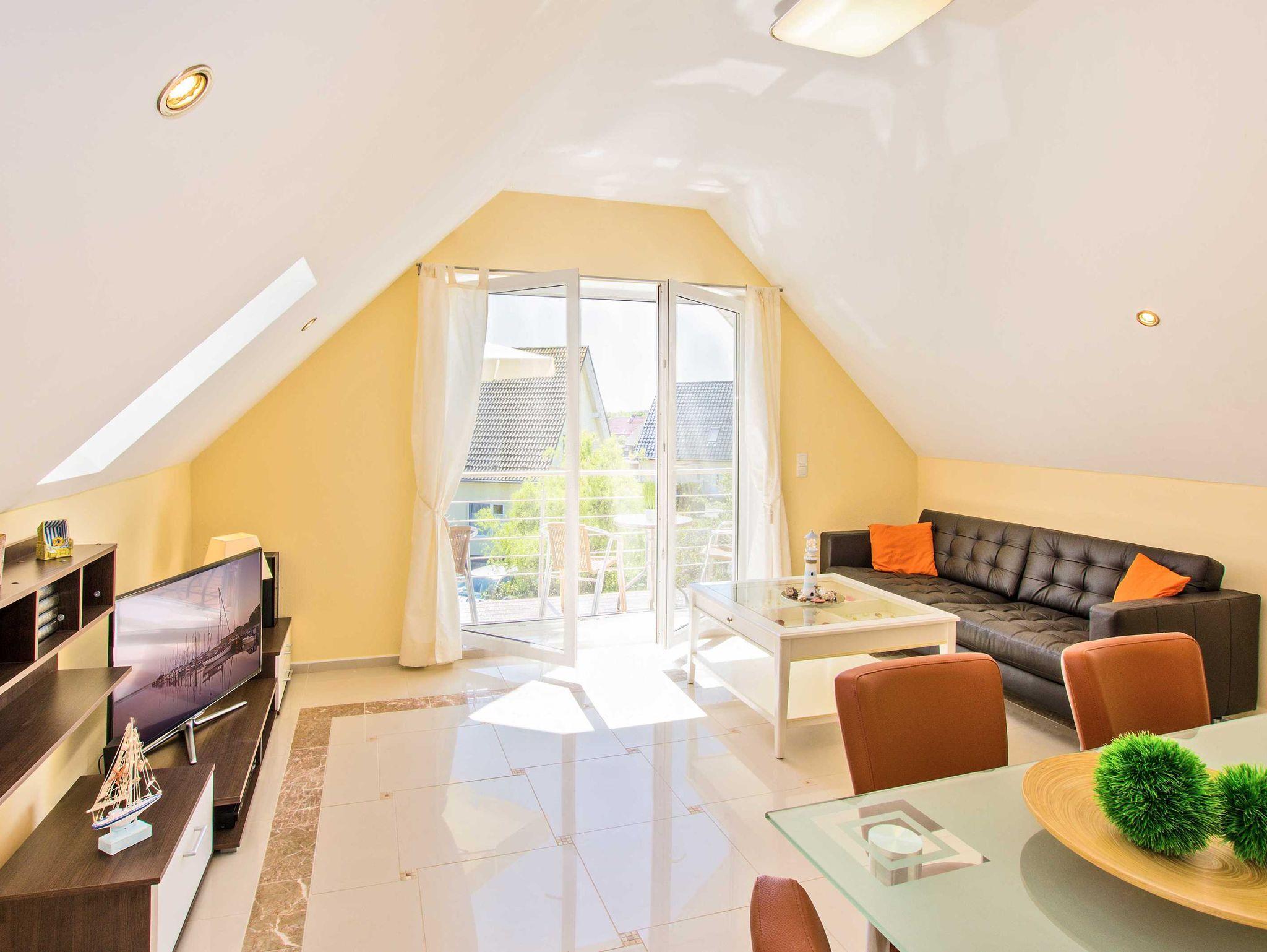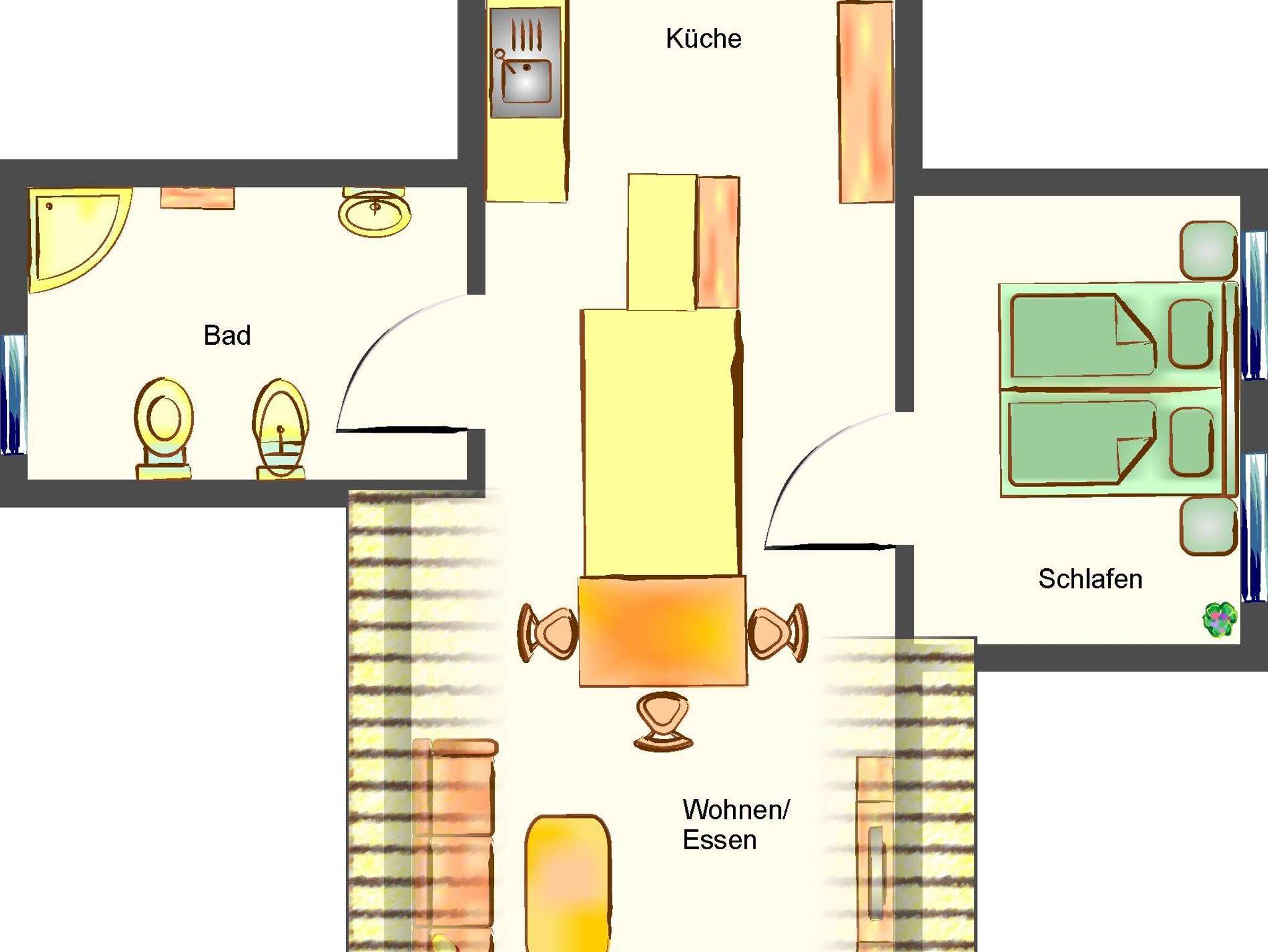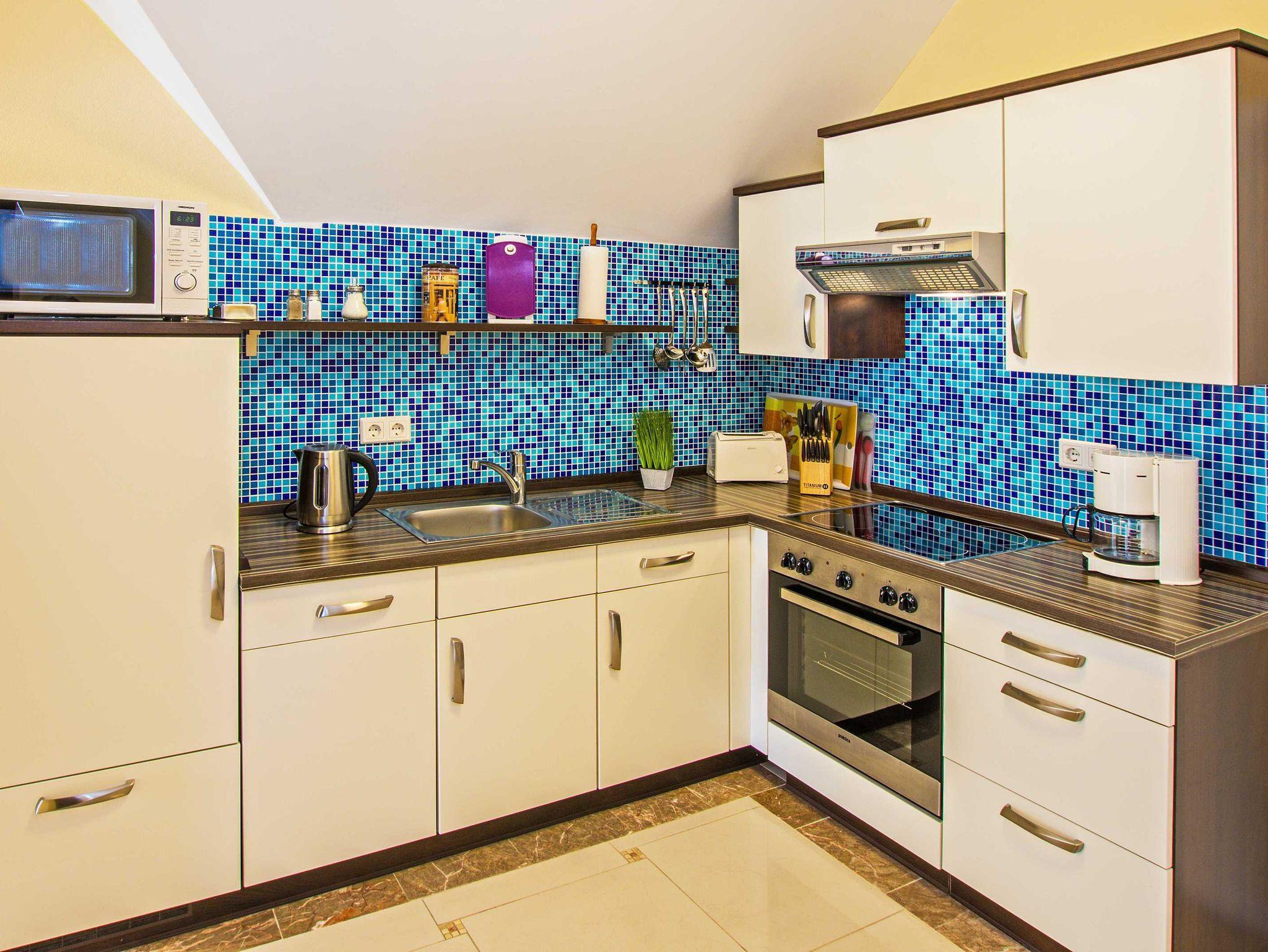 Nehmen Sie Platz auf dem gemütlichen Sofa im offenen Wohnbereich, die Ihnen die Sicht auf den Fernseher und hinaus durch die bodentiefen Fenster auf den Balkon. Die Küchenzeile, bestehend aus Backofen, Herd mit Ceranfeld, Kühlschrank mit Gefrierfach, Geschirrspülmaschine, sowie Kleinelektrogeräten wie einer Mikrowelle, Kaffeemaschine, Toaster und Wasserkocher steht vor dem großen Esstisch mit vier Stühlen. Zu Ihrer Unterhaltung stehen Ihnen ein 3D 40“Flat TV mit Blue-Ray HiFi-Anlage zur Verfügung. Das Badezimmer stellt Ihnen eine gläserne Duschkabine, ein unterbautes Waschbecken mit Spiegel und Kosmetikspiegel, Haartrockner, Bidet und WC bereit.