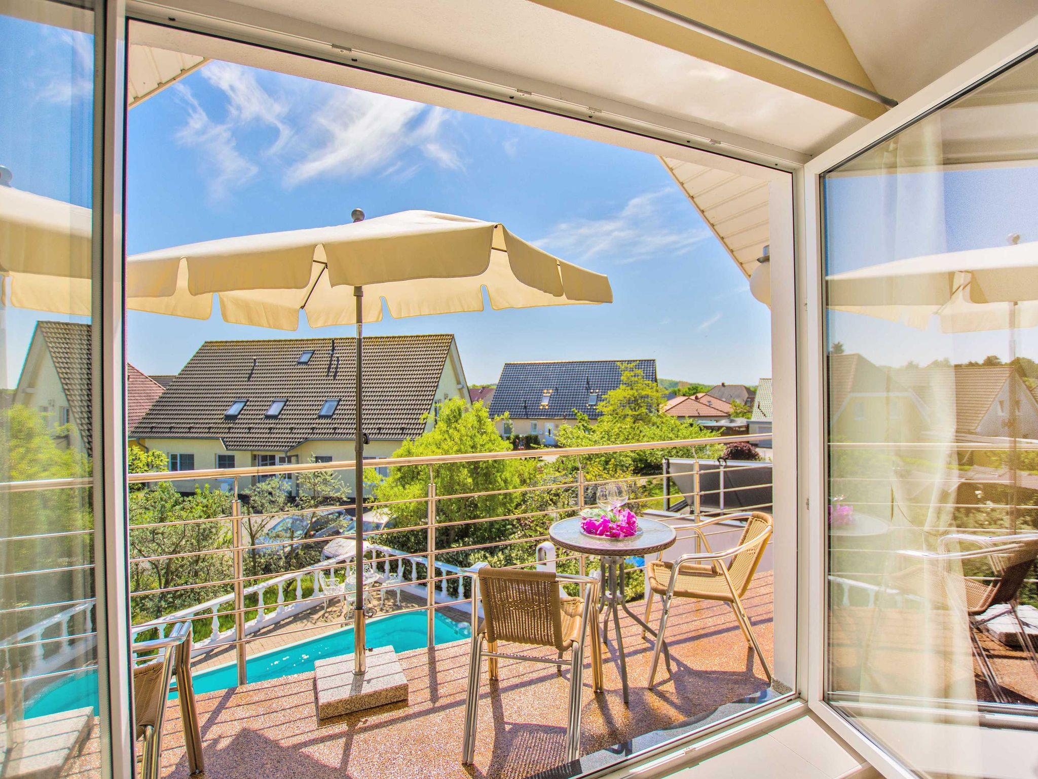 An der Seite der Villa Europa vorbei über die Terrasse gelangen Sie direkt zum sonnenbeheizten gemeinschaftlichen Außenpool, zum Grillplatz, zu den Sonnenliegen sowie zu dem XXL-Strandkorb.