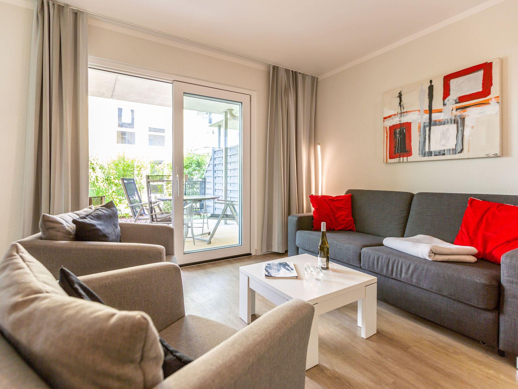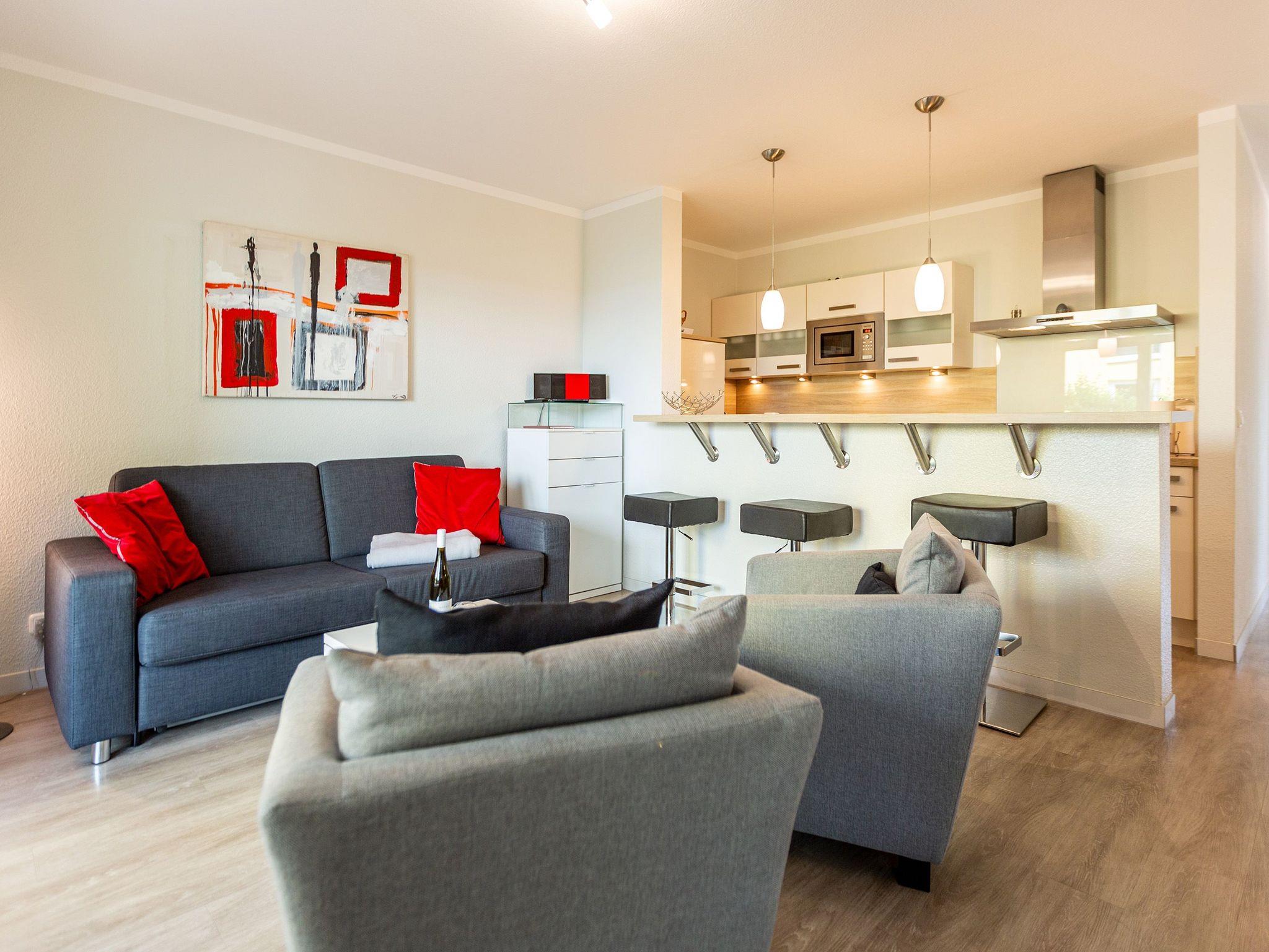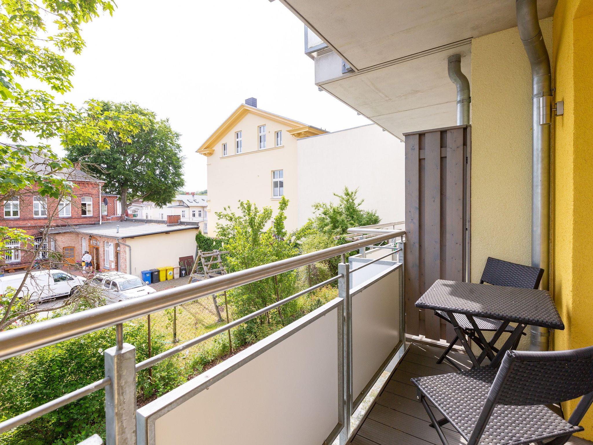 Etwas versteckt, aber dennoch zentral gelegen, empfängt Sie das Domizil am Hang, bestehend aus Haus A [&] Haus B. Es erwarten Sie individuell gestaltete 2- und 3-Raum-Appartements mit Balkonen, Terrassen und hochwertiger Ausstattung. Fu?r beide Ha?user steht eine Tiefgarage zur Verfu?gung, in der fu?r jede Wohnung ein PKW- Stellplatz vorhanden ist. Aus dieser Tiefgarage ist ein Zugang zum Aufzug und zu den Wohnungen des Hauses B möglich (unabha?ngig davon ob man mit oder ohne PKW anreist). Von dort haben Sie Zugang zum Haus A, welches über keinen Aufzug verfügt. Die oberen Appartements sind ausschließlich über Treppen zu erreichen. Bis zum Strand und zur Promenade sind es ca. 400m Fußweg. Im Haus sind die Waschmaschine und Trockner gegen Gebühr nutzbar. Außerdem steht für jede Wohnung ein Briefkasten am Haus zur Verfügung.