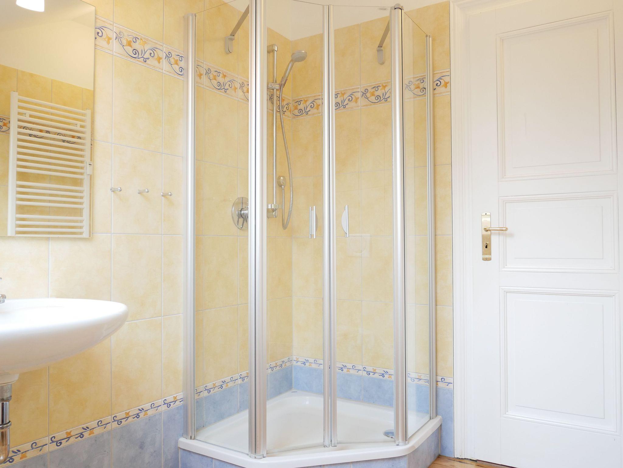 Im Bad befinden sich eine Dusche und WC in den Farben Gelb/Blau.