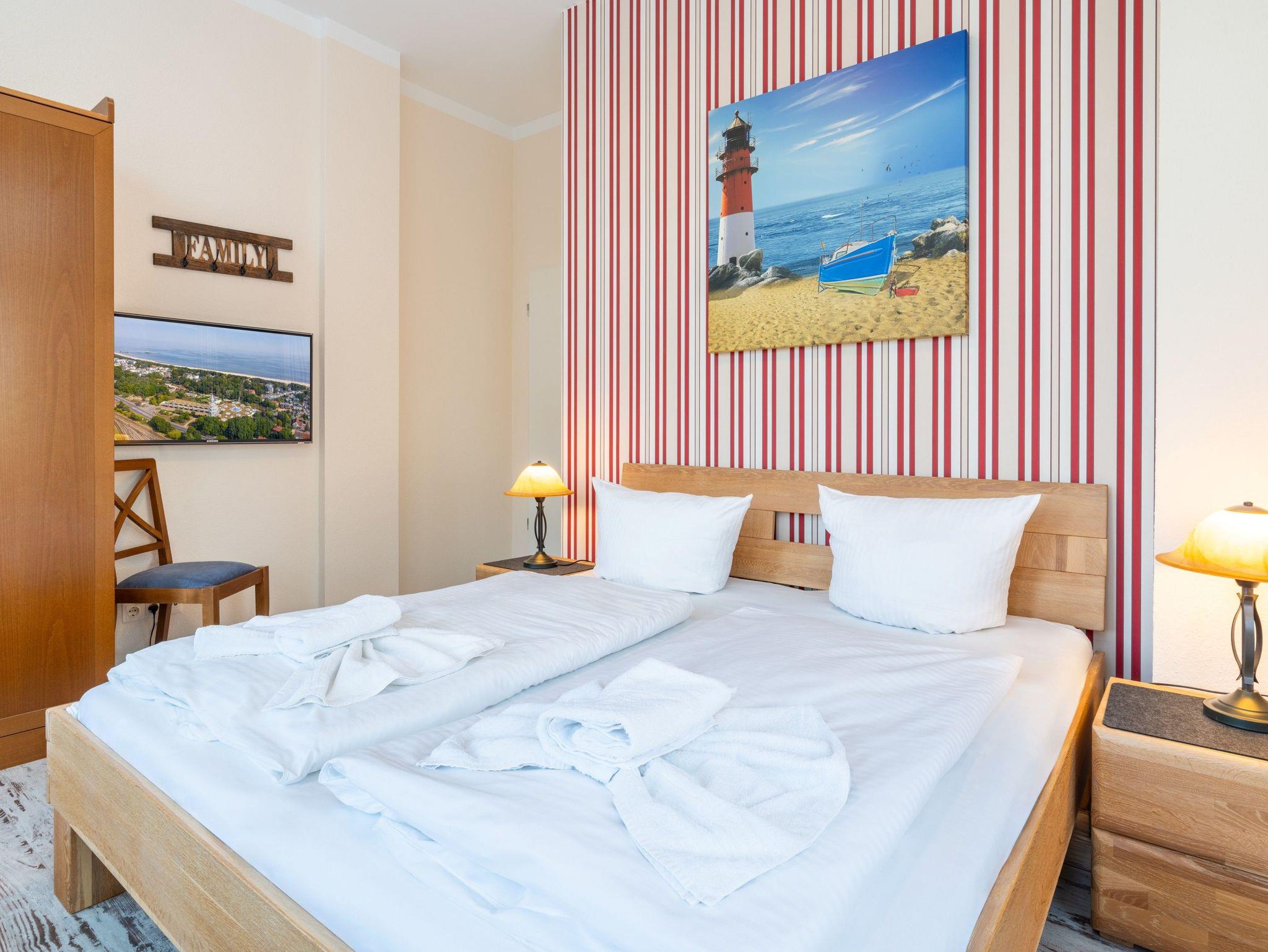 Die OstseeTherme ist nur fünf Gehminuten entfernt und zum Strand sind es rund 250 m. Ein PKW-Stellplatz gehört ebenfalls zur Wohnung.