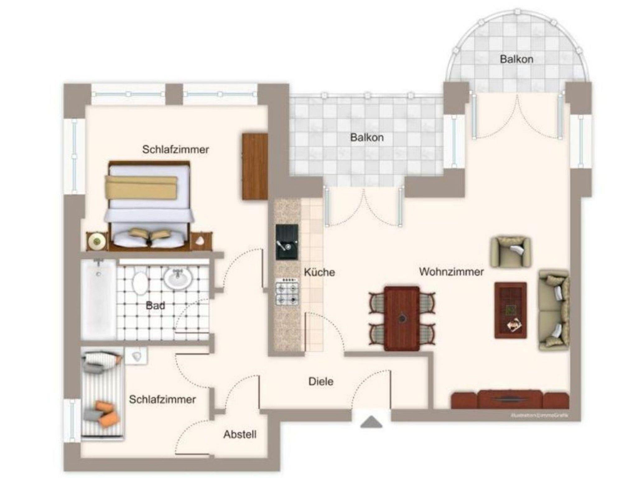 Die 69 qm große und moderne Drei-Raum-Ferienwohnung befindet sich im ersten Obergeschoss der Villa Aegir. und bietet Platz für bis zu vier Personen. Sie verfügt über ein helles Wohnzimmer mit Couchecke (Schlafsofa), Flachbild-TV, einen Essplatz sowie eine offene Küchenzeile, ausgestattet mit Geschirrspüler, Kühlschrank, Kaffeemaschine, Toaster, Wasserkocher, Backofen und Mikrowelle. Die Wohnung verfügt weiterhin über ein Schlafzimmer mit Doppelbett und ein Schlafzimmer mit einem Einzelbett. Bad mit Badewanne und WC. Zwei Balkone runden das Angebot ab.