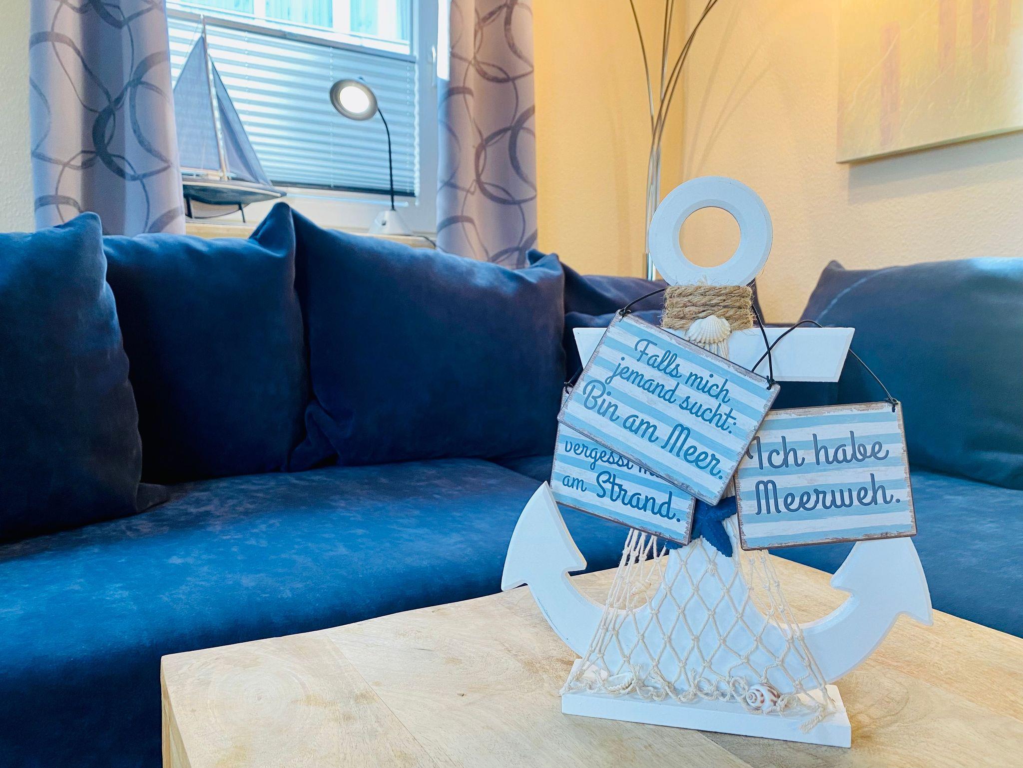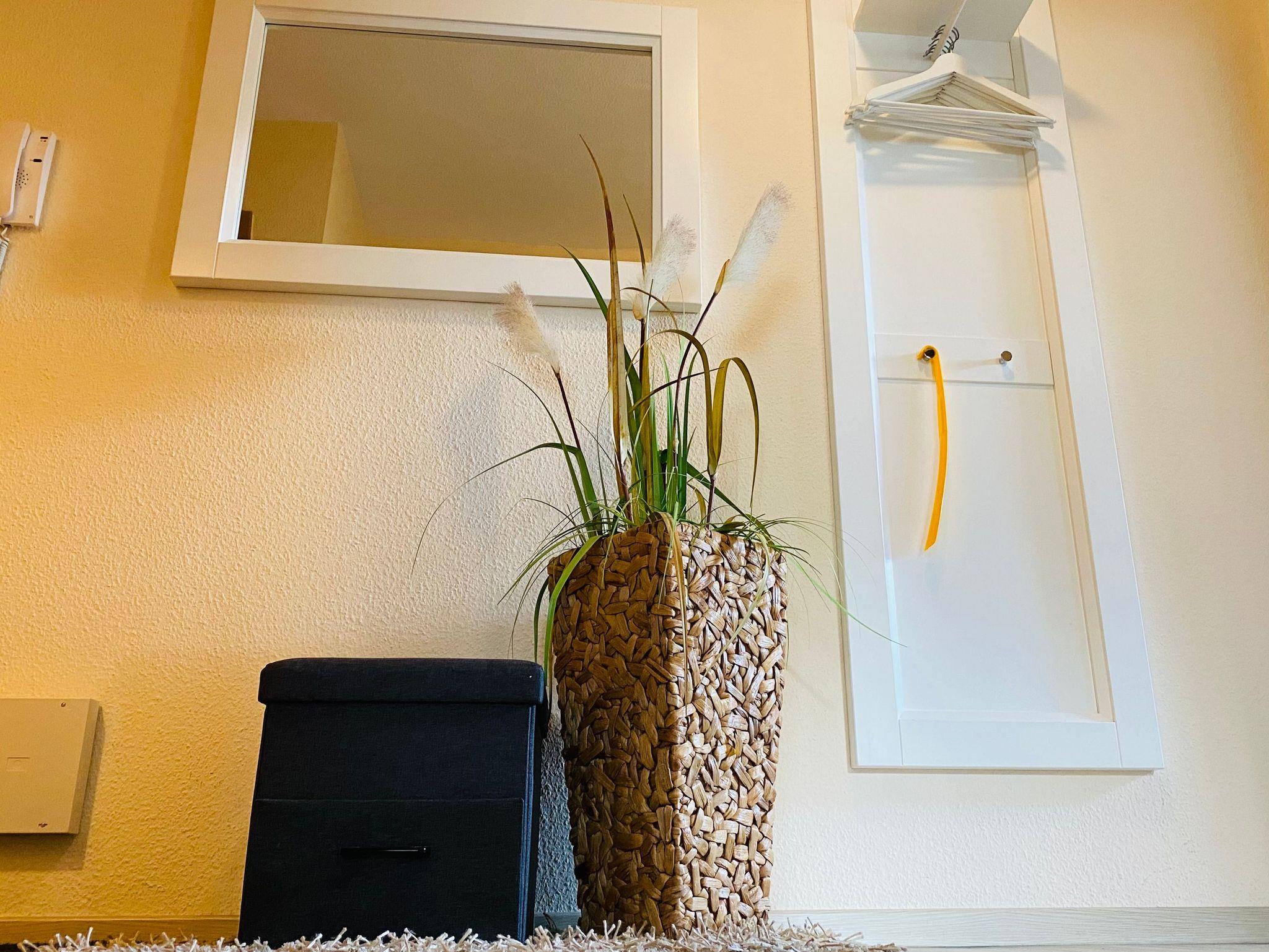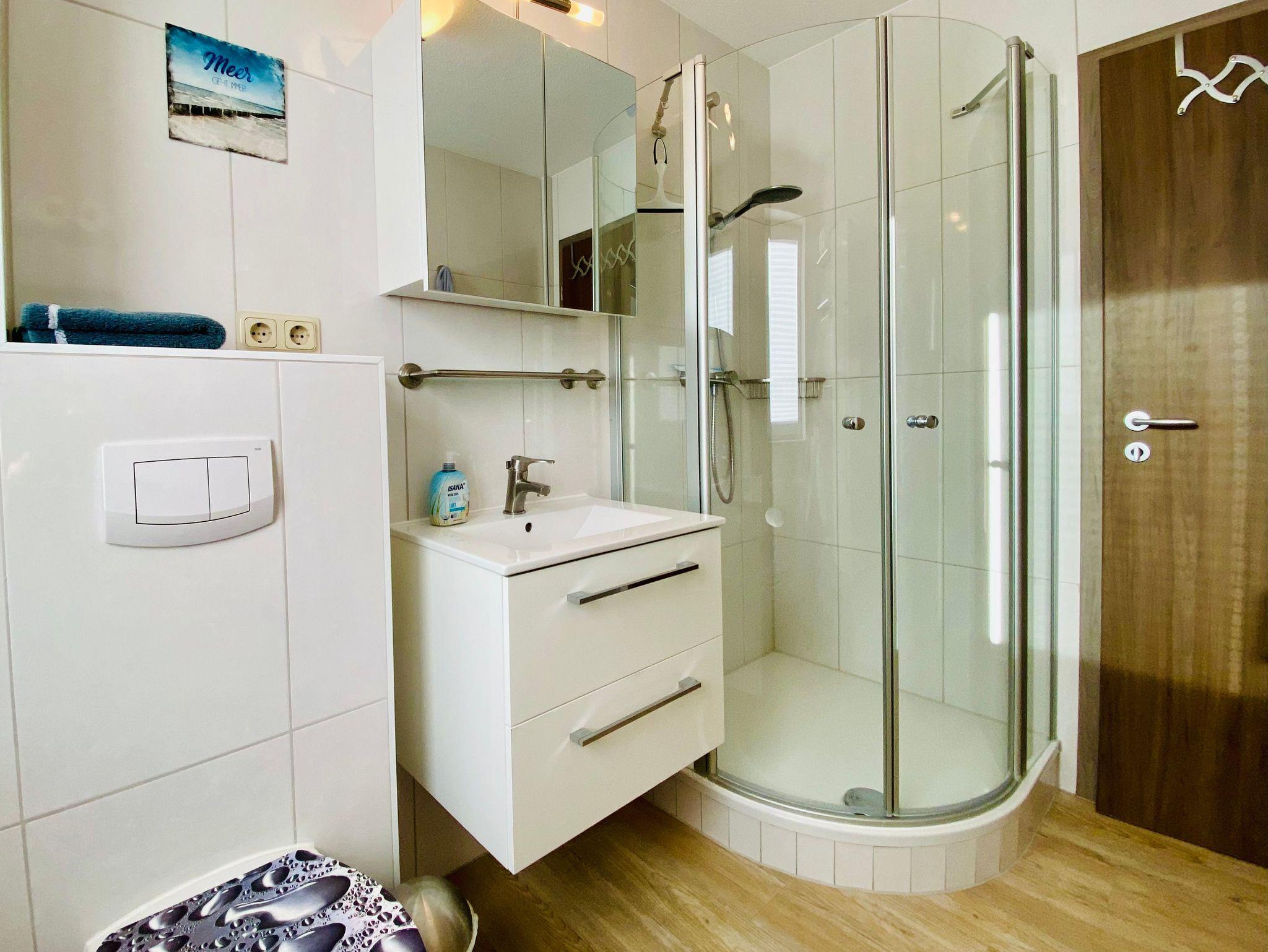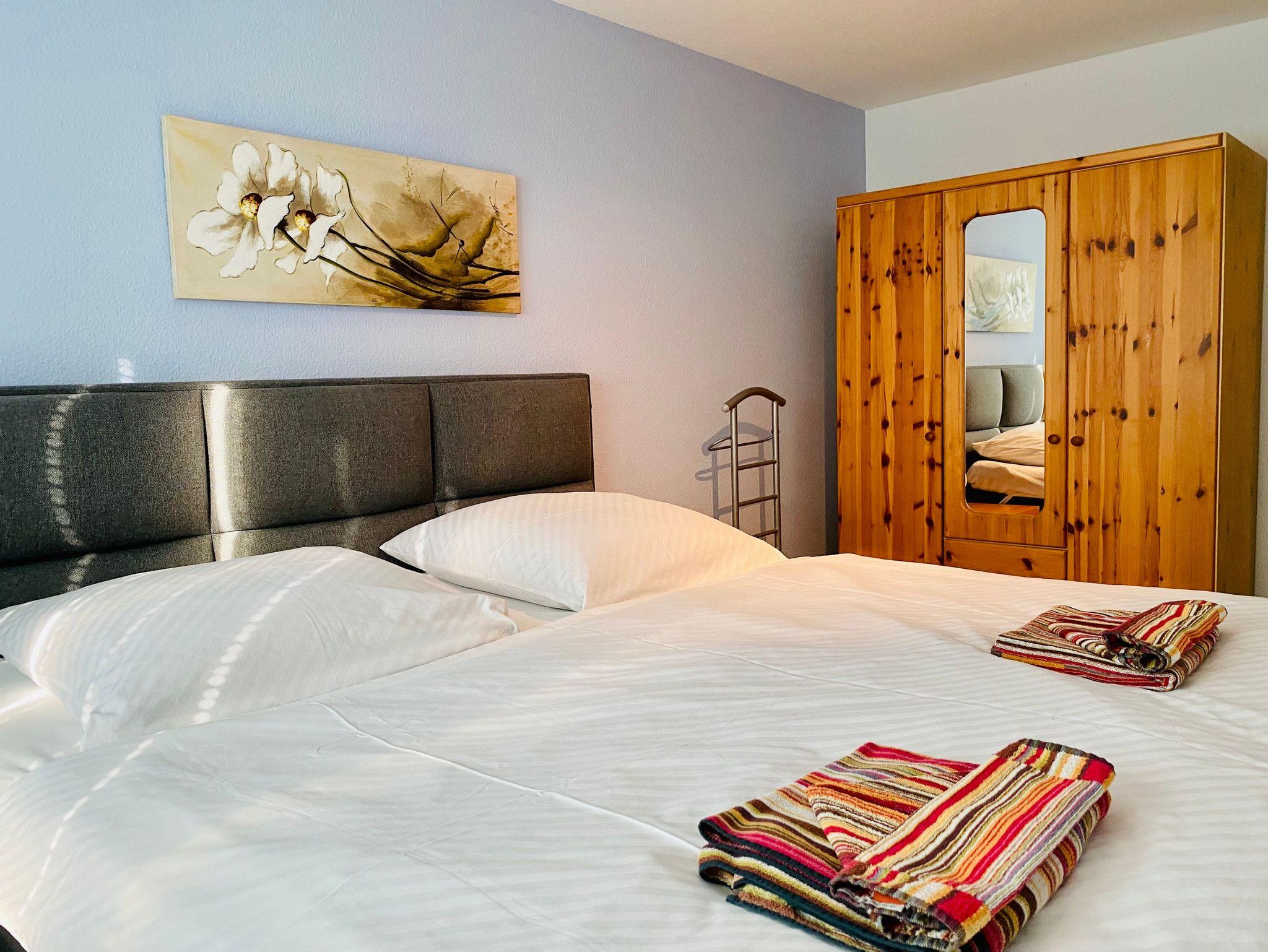 Das Schlafzimmer verfügt über ein Boxspringbett und einen Flachbildfernseher. Das Badezimmer mit Dusche hat ein Fenster. Zur Wohnung gehört ein kostenfreier Stellplatz und W-LAN