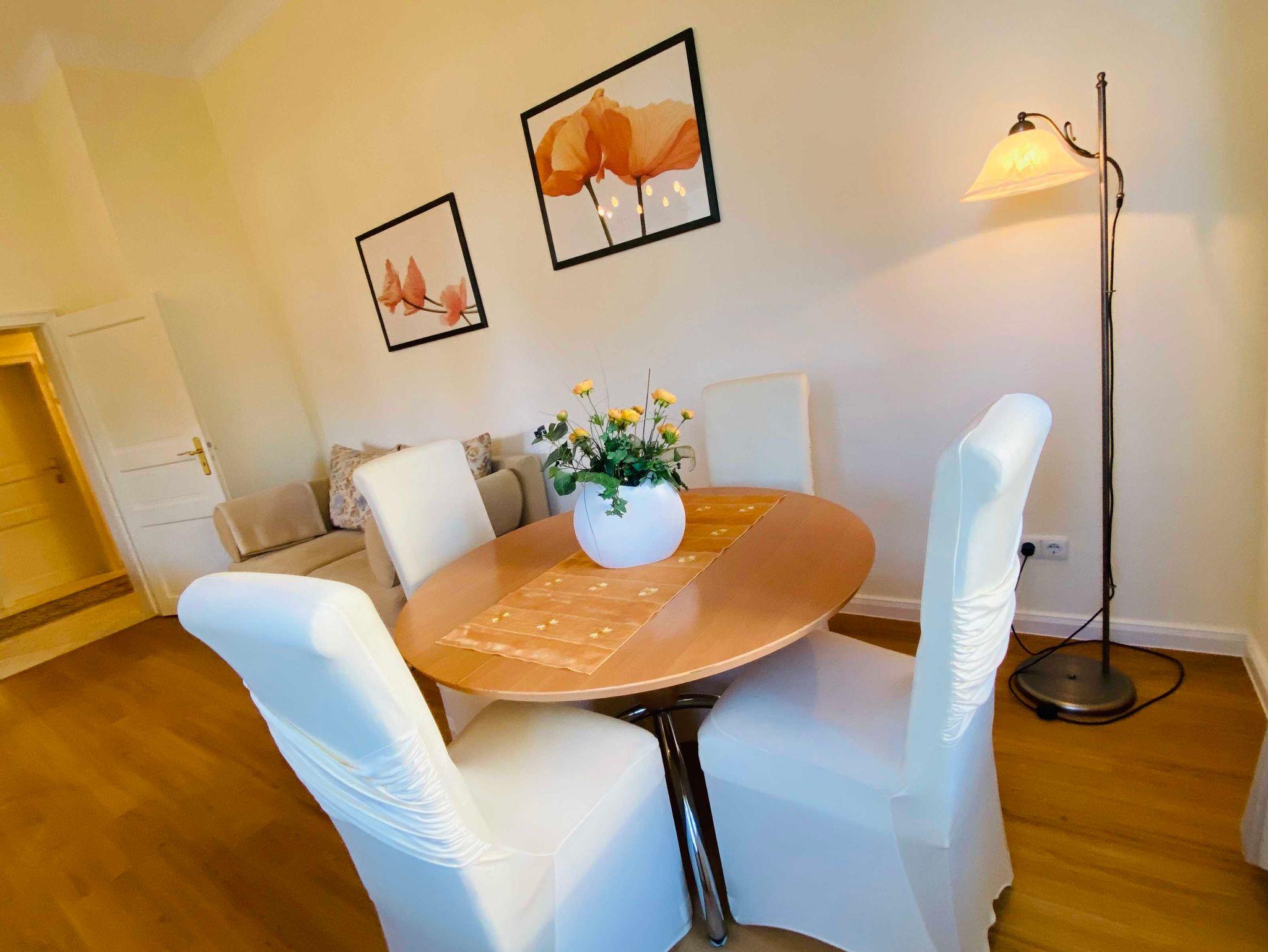 Die Ferienwohnung 3 ist eine schöne großzügige 2-Raumwohnung mit einem gemütlichen Wohnzimmer mit Sitzecke, TV und Essbereich. Über das Wohnzimmer gelangen Sie zu große überdachte Terrasse in Richtung Promenade/See Das Schlafzimmer hat ein Doppelbett und einen Kleiderschrank. Das Badezimmer hat eine Wanne mit Duschabtrennung. Vom Flur aus gelangen Sie in die separate Komplettküche