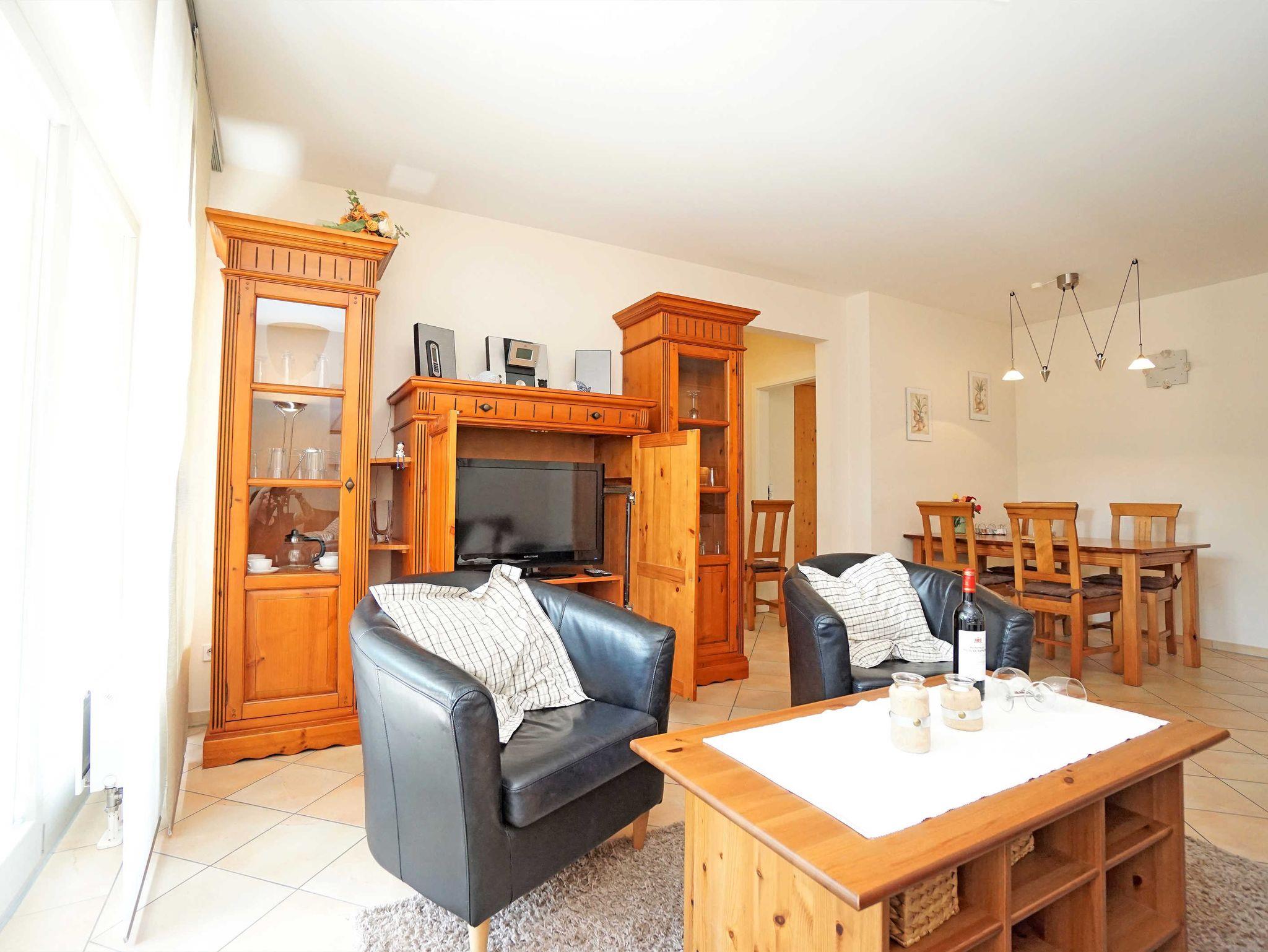 Die hochwertig eingerichtete 3-Zimmer Ferienwohnung (65m²) befindet sich im Hochparterre des Hauses Villa Marlen. Das geräumige Wohnzimmer mit offener, vollausgestatteter Küchenzeile, großem Esstisch und gemütlicher Couch lässt keine Wünsche offen. Vom Wohnzimmer aus erreicht man den großen Balkon mit einer Treppe zum Grundstück. Zwei Schlafzimmer mit jeweils einem großen Doppelbett (180x200) und einem großen Kleiderschrank bieten genug Platz für bis zu 4 Personen. Eines der beiden Schlafzimmer ist mit einem Flachbildfernseher (im Schrank) ausgestattet und das zweite Schlafzimmer hat einen eigenen Balkon. Unter anderem verfügt diese Ferienwohnung über ein Duschbad und einem weiteren Badezimmer mit Badewanne.