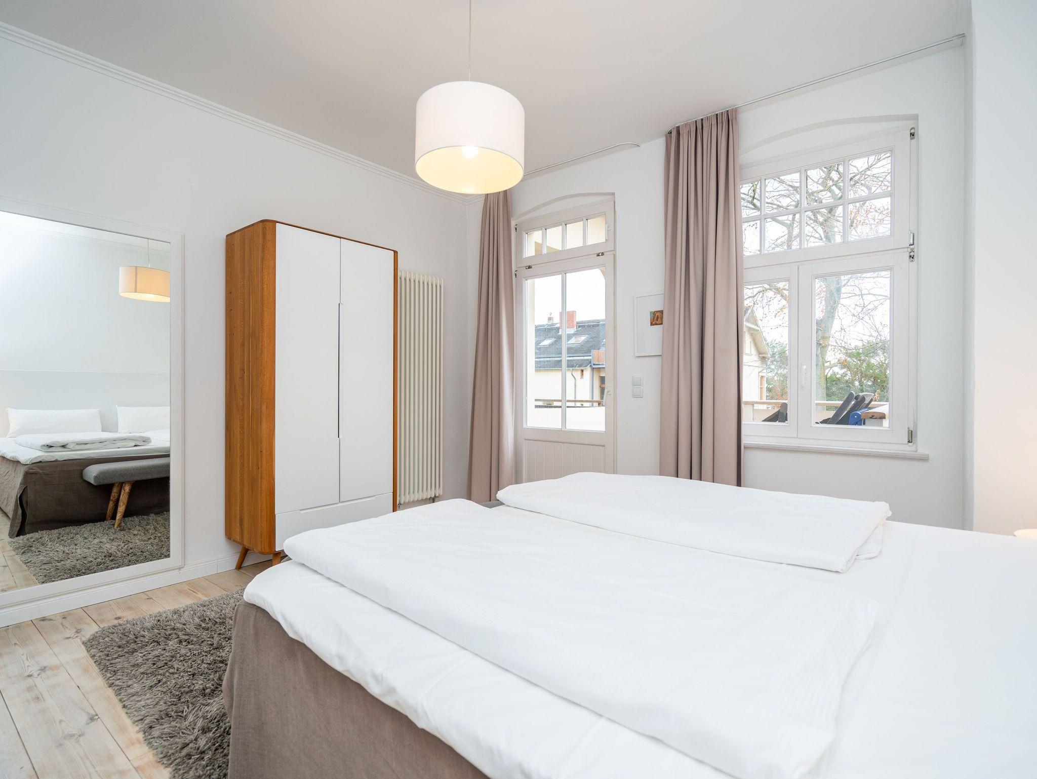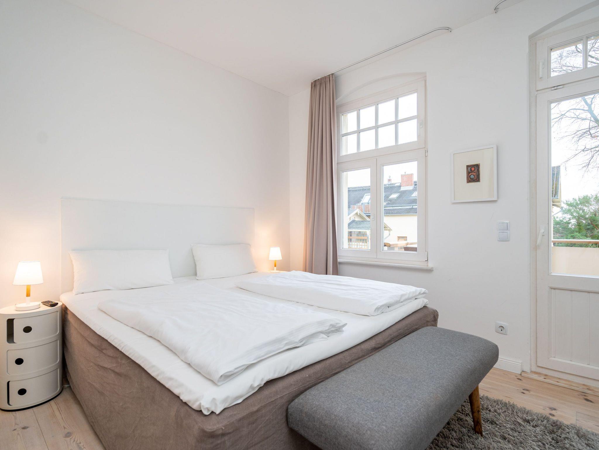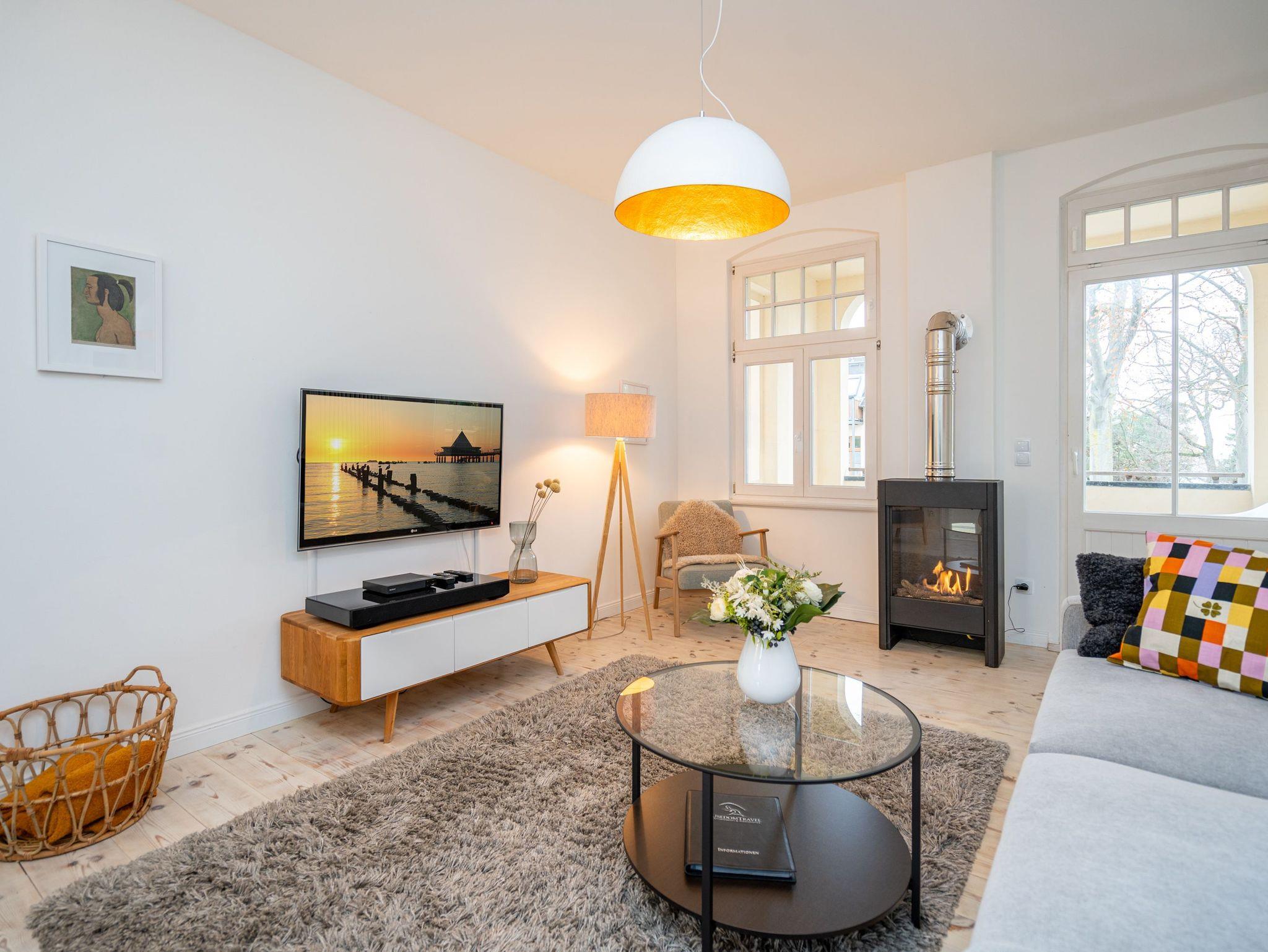 Moderner Lifestyle vom Feinsten: Erfrischend, pur, clean und entspannt macht das Interieur-Design dieses Ferienparadieses Freude und gibt ihm das gewisse Etwas. Hell und licht und mit viel Weiß lädt das Appartement 2 im Obergeschoss der Villa Diehl zum Ausspannen und Wohlfühlen ein. Bis zu 4 Personen haben in den großzügig geschnittenen 102 Quadratmetern dieser Wohnung jede Menge Platz. Ein wunderschöner Wohnbereich mit weiß gekälktem Echtholzdielenboden, flauschigem Hochflorteppich, einer stylischen Design-Sitzgruppe aus Sofa und Sesseln, dem gemütlichen Gas-Kamin und großem Flat-TV mit Blue-Ray-Player machen die Auszeit zu etwas Besonderem. Von hier aus geht es auf die sonnenüberflutete, offene Loggia mit Blick auf die begrünte Anlage hinaus. Lässt es sich schöner frühstücken als hier, wo die Ostsee sanft ins Ohr rauscht? Auch die beiden Schlafzimmer mit bequemen Doppelboxspringbetten und großen Schränken haben jeweils eigene Balkone. Die Küche ist mit hochwertigen Geräten voll ausgestattet. Nehmen Sie Platz am großen Esstisch und lassen Sie es sich schmecken. Highlight des geräumigen Badezimmers ist neben Waschtisch, WC und Echtglas-Dusche die kleine Infrarot-Sauna für zwei Personen. Hier wird es an kühlen Tagen und Abenden so richtig muschelig warm. Zur Wohnung gehört ein separates Gäste-WC. Damit Sie sich in Ihrem Urlaub wirklich um nichts kümmern müssen, liegen Handtücher für Sie bereit und die Betten sind bezogen. Sie haben im Appartement einen kostenfreien WLAN-Zugang. Auf dem Hof ist ein Pkw-Stellplatz für Sie reserviert.