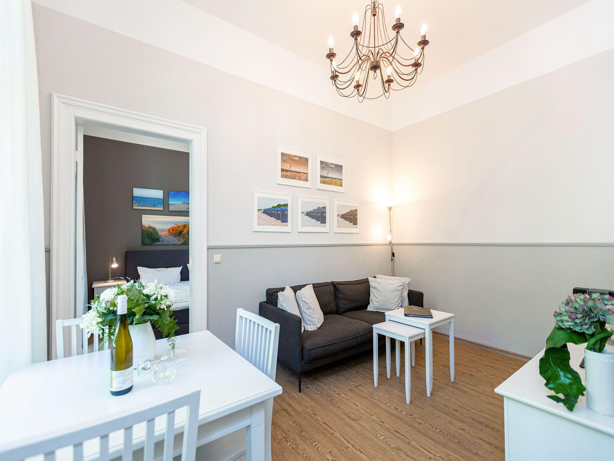 In dieser schönen und hellen, 40 Quadratmeter großen Zwei-Zimmer-Wohnung im Hochparterre der Villa Amelia umgibt Sie noch das mondäne Flair der kaiserzeitlichen Bädervillen. Wunderschön saniert, strahlt sie durch die hohen Räume und die Stuckzierleisten an den Wänden noch dieses luxuriöse Lebensgefühl der Zeit um 1900 aus. Die stilvolle Einrichtung des Wohnzimmers und des Schlafzimmers entführt Sie, ihren Partner und gerne auch ihr Haustier im Handumdrehen in eine entspannte Urlaubswelt. Home sweet home im Landhausstil. Ein bequemes Sofa lädt vor dem Flat-TV zum Entspannen ein. Am schönen, weißen Esstisch haben Sie einen wunderbaren Blick ins Grüne. Vor dem Wohnzimmer wartet ein kleiner Balkon nur darauf, dass Sie es sich dort am Gartentisch bequem machen. Wohnzimmer und Küche sind durch einen offenen Rundbogen miteinander verbunden. Hier finden Sie alles, was das Herz des Hobbykochs höher schlagen lässt: Cerankochfeld, Kühlschrank, Spülmaschine, Kaffeemaschine und Geschirr. Im separaten Schlafzimmer macht das große und komfortable Boxspringdoppelbett nicht nur zum Schlafen Spaß. Das Bad ist mit einer Dusche und einem Waschbecken ausgestattet. Das WC befindet sich in einem separaten, ein paar Stufen tiefer gelegenen Raum. Entspannen Sie in diesem kleinen, aber feinen Urlaubsdomizil von der ersten Minute an. Das Bett ist bei Anreise bezogen und Handtücher liegen bereit. Zu der Wohnung gehört ein Pkw-Stellplatz am Haus. Das WLAN kann kostenfrei genutzt werden.