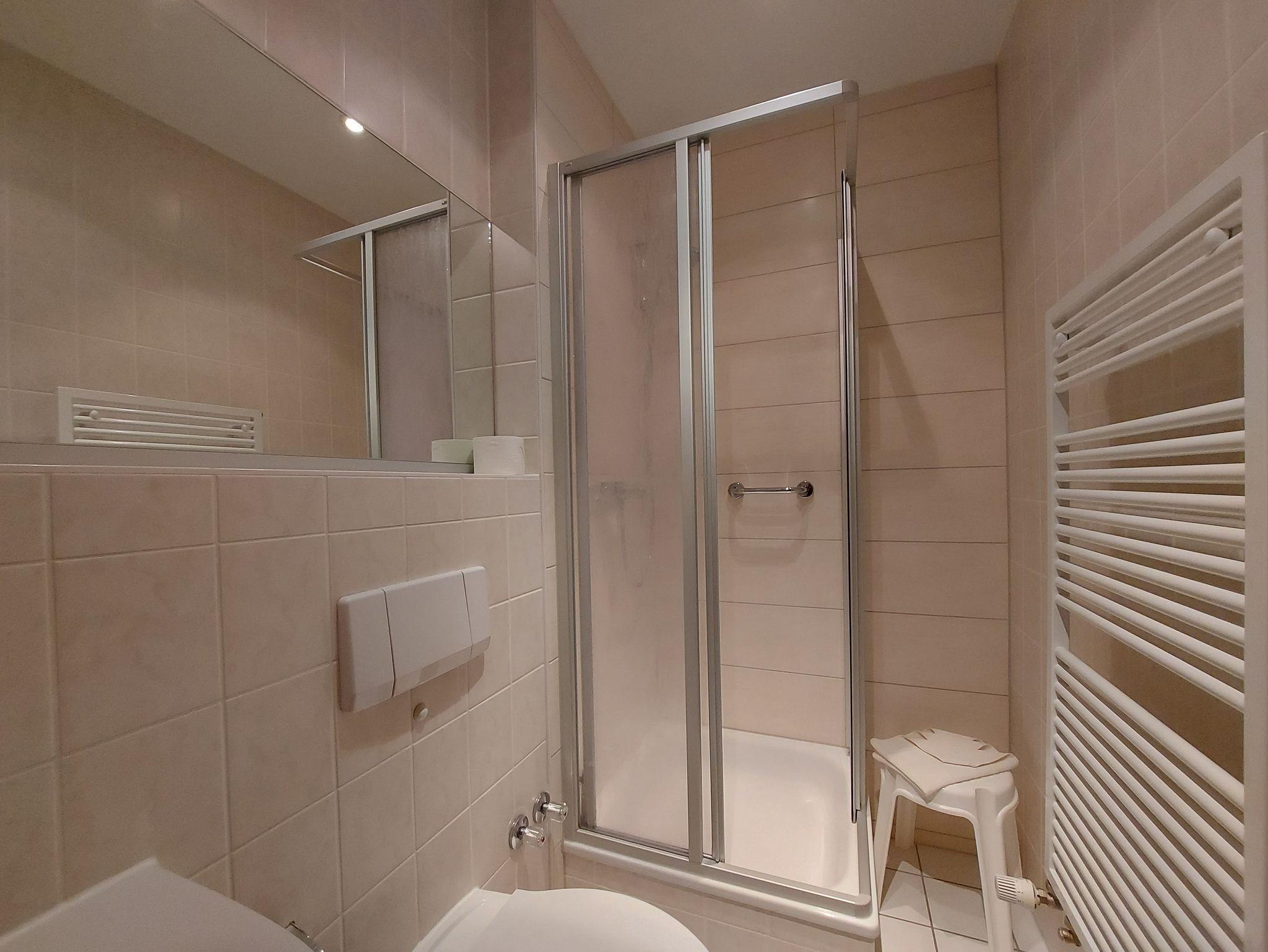 Durch das Wohnzimmer erreichen Sie das separate Schlafzimmer, dass mit einem gemütlichen Doppelbett und Kleiderschrank ausgestattet. Zusätzlich gehört zur Wohnung eine Veranda mit einem Sitzbereich und Meerblick. Das Badezimmer verfügt über eine Dusche.