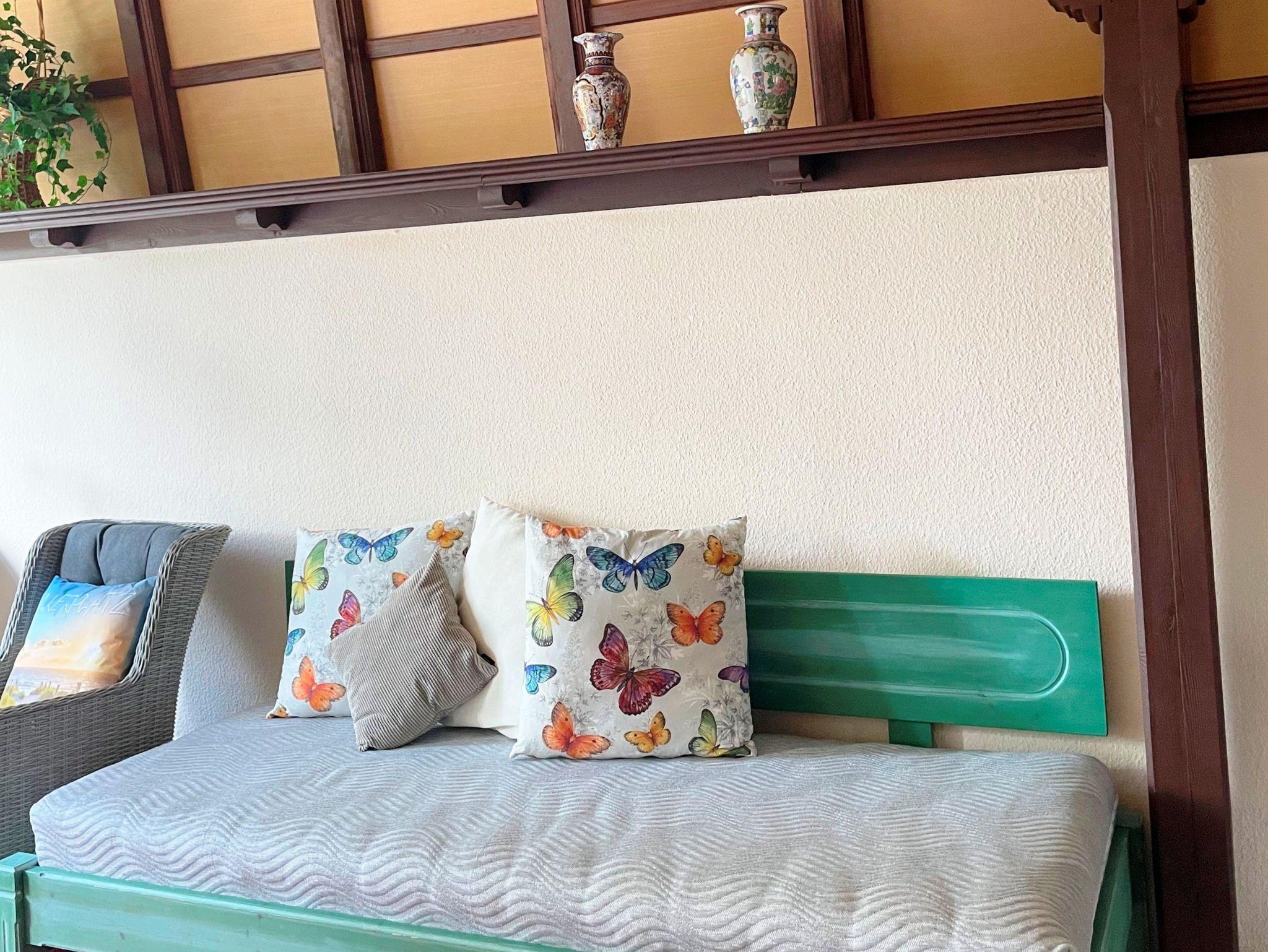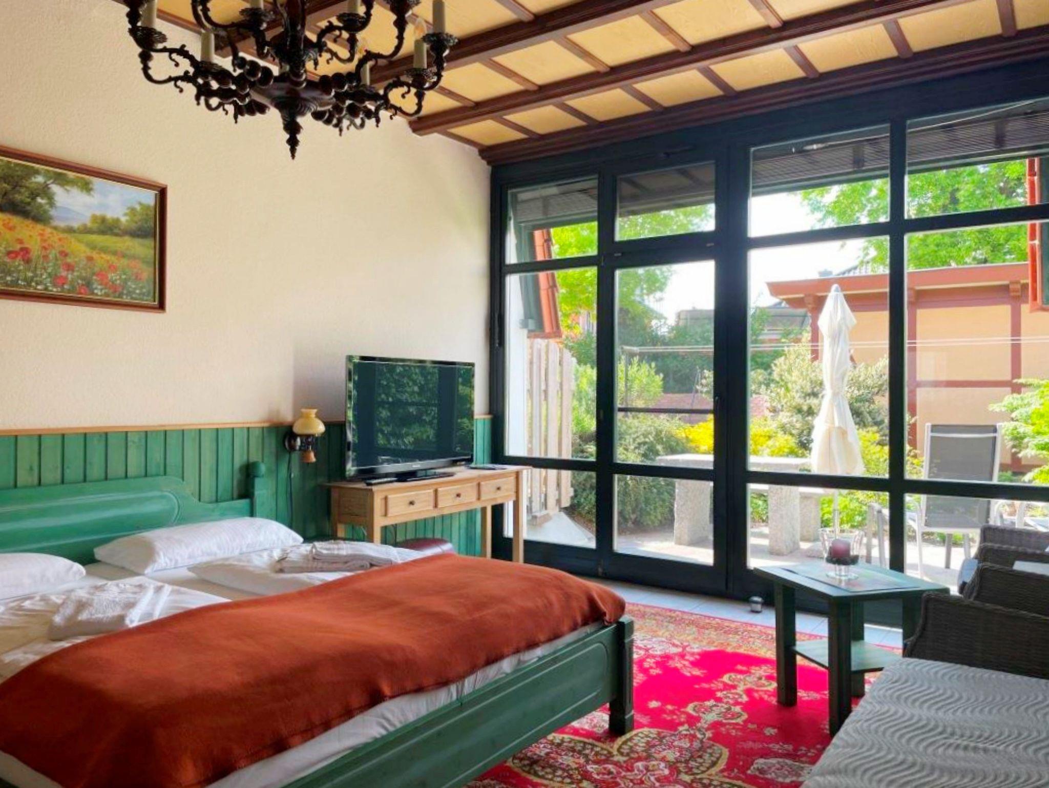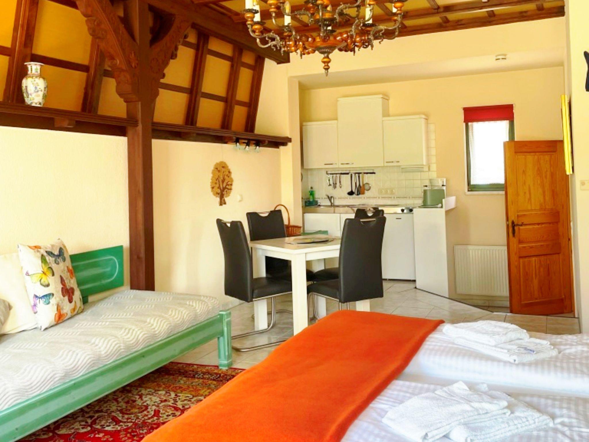Mit 42 Quadratmetern bietet die moderne 42 qm große 1-Raum-Ferienwohnung genügend Platz für bis zu 3 Personen. Die Wohnung befindet sich im Eigenheim der Gastgeber, mit eigenem separatem Eingang - so können Sie ganz ungestört Ihren Urlaub genießen. Der helle, kombinierte Wohn- und Schlafraum ist mit einem bequemen Doppelbett, einem Einzelbett, einem Flachbild-TV und Radio ausgestattet - perfekt, um nach einem erlebnisreichen Tag zu entspannen. Die kleine Küchenzeile mit Zwei-Platten-Herd, Spüle, Kühlschrank, Kaffeemaschine und allem, was Sie für die Selbstversorgung brauchen, macht Ihren Aufenthalt noch angenehmer. Das Badezimmer mit Dusche und WC rundet das Angebot ab. Für Ihren Komfort können Sie die Erstausstattung Bettwäsche und Handtücher für 15,- € pro Person dazu buchen. Genießen Sie morgens Ihren Kaffee oder lassen Sie den Tag bei einem Glas Wein auf der Terrasse mit Blick ins Grüne ausklingen - hier können Sie die Seele baumeln lassen.