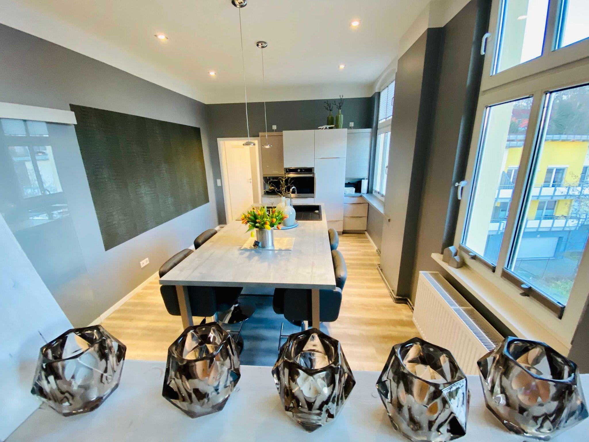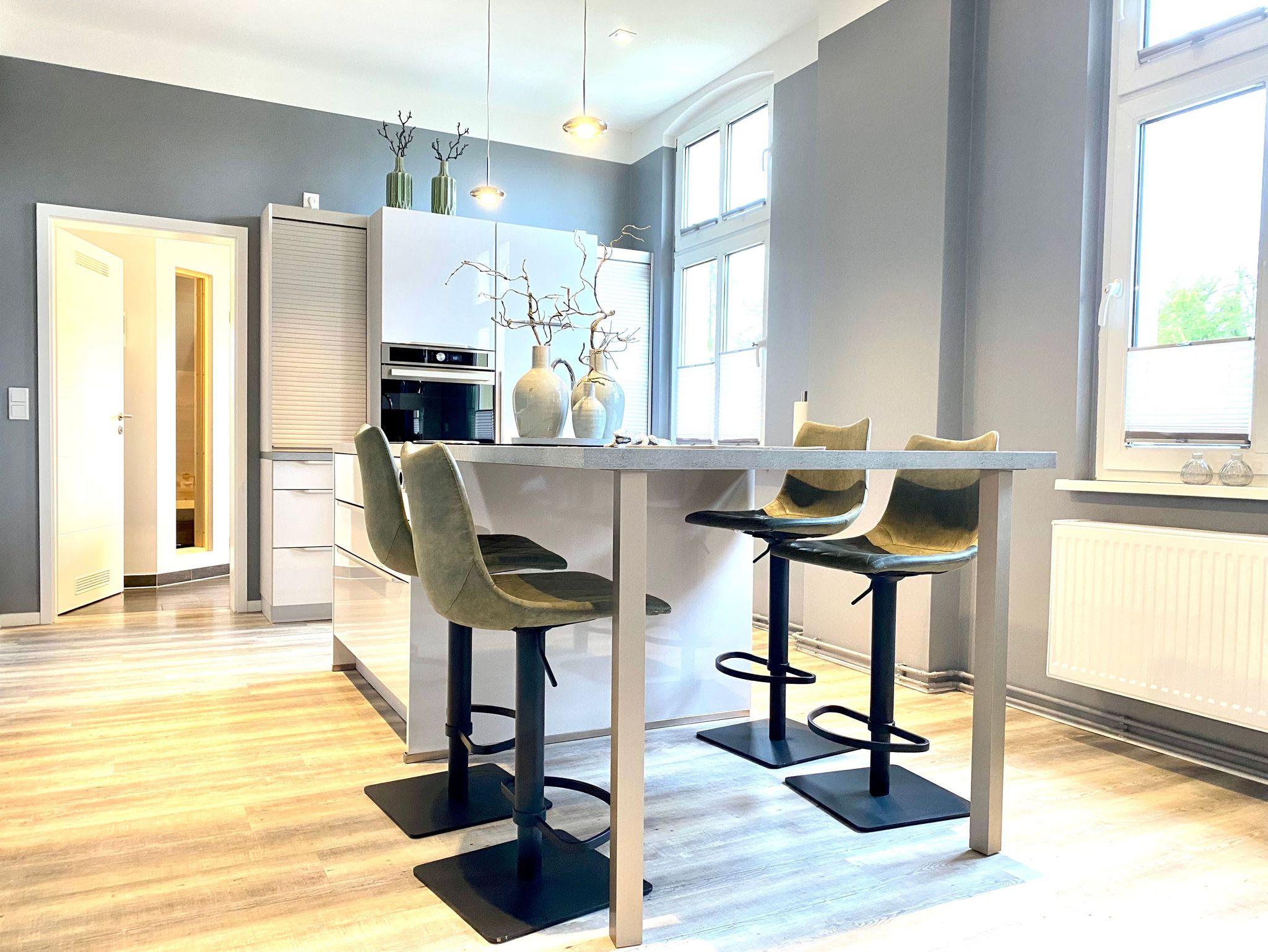 Auch der Anbau der Villa Anna wurde liebevoll saniert. Hier entstanden zwei schöne Ferienwohnungen, im Erdgeschoss die Kleine Anna, die ebenso modern und stilsicher eingerichtet wurde. Auf dem Grundstück gibt es pro Ferienwohnung einen Stellplatz und eine Aufladestation für E-Autos inklusive.