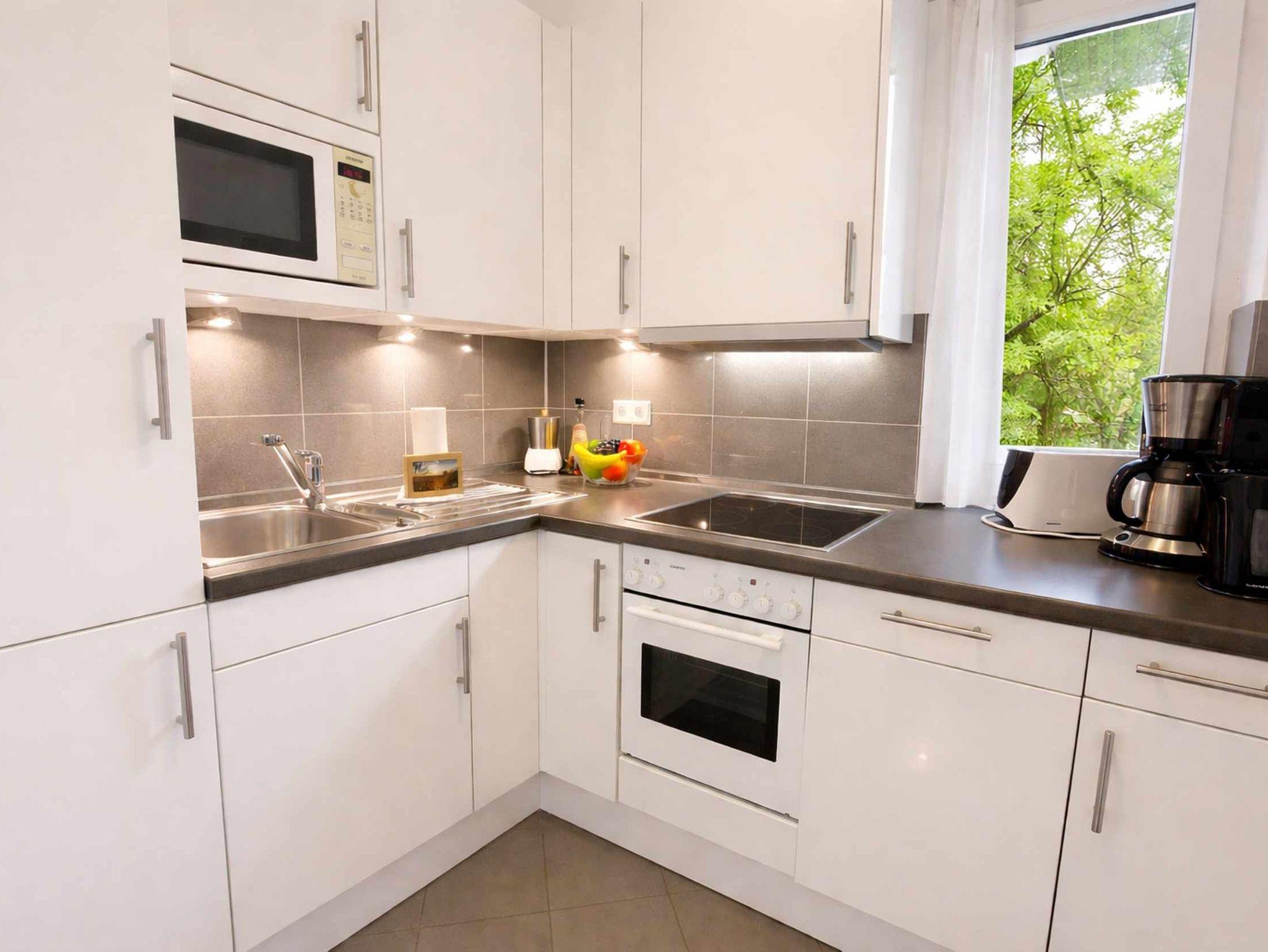 Der offene Wohn- und Essbereich lädt zum Verweilen ein. Hier befindet sich auch ein Schlafsofa (140 cm), das sich mit wenigen Handgriffen ausklappen lässt. Die kleine, aber voll ausgestattete Küche bietet alles, was du für die Zubereitung deiner Lieblingsgerichte brauchst.