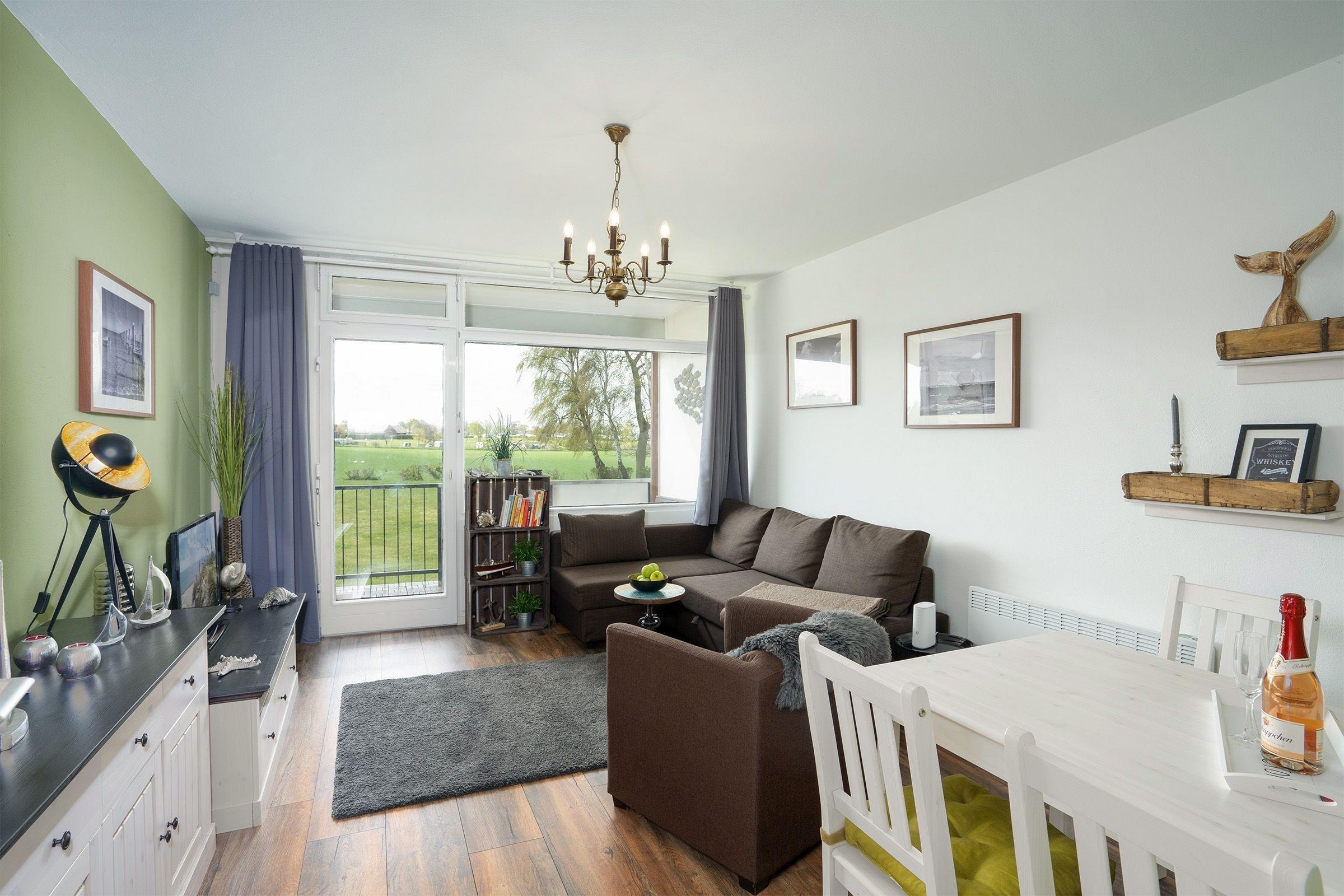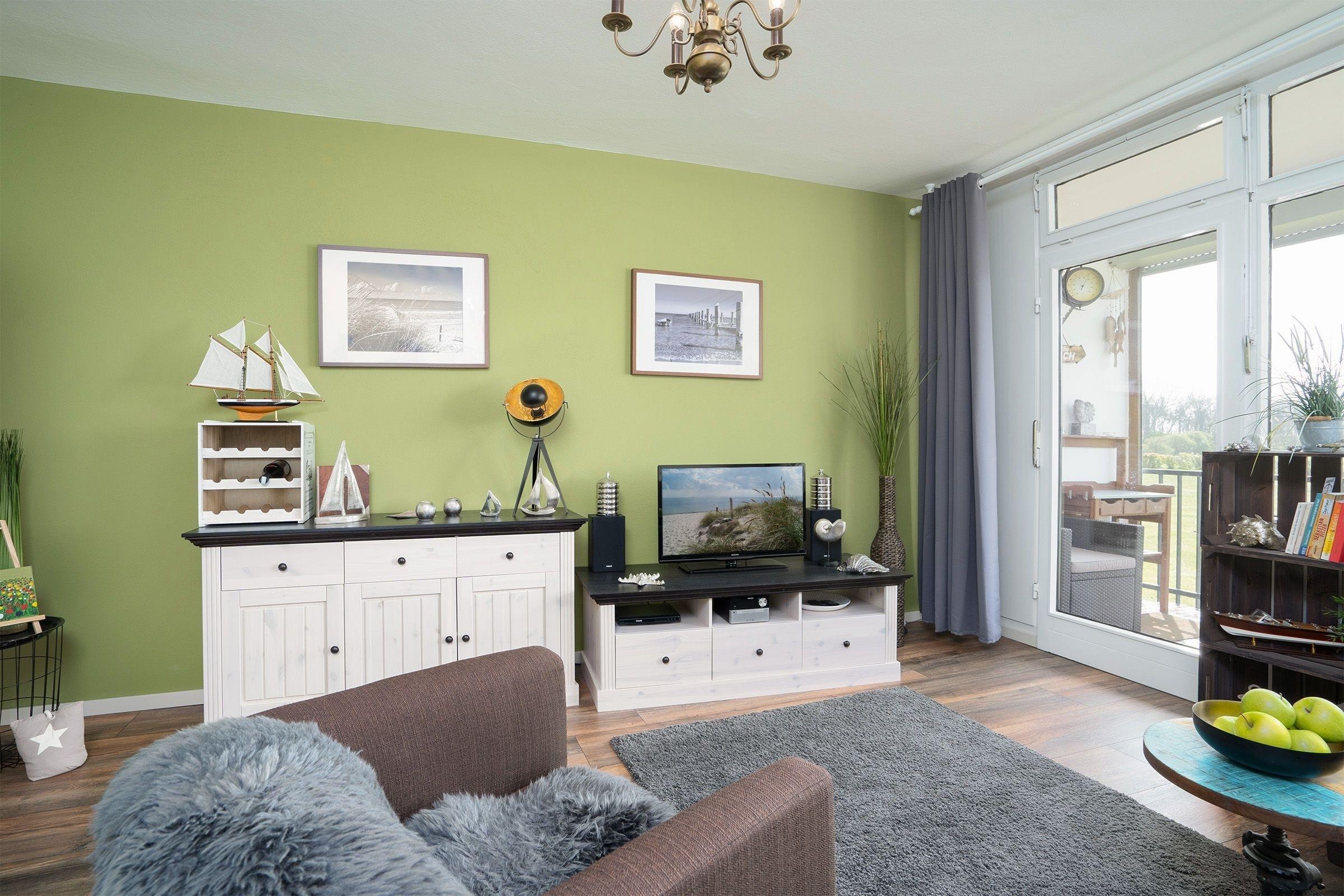 Die Wohnung verfügt über ein separates Schlafzimmer mit Doppel-Boxspringbett (140x200 cm). Im Wohnbereich befindet sich eine kleine Essecke. Genießen Sie auf dem Balkon Ihr Frühstück an der frischen Seeluft mit seitlichem Blick aufs Meer. Ein Elektro-Grill ist ebenfalls vorhanden.