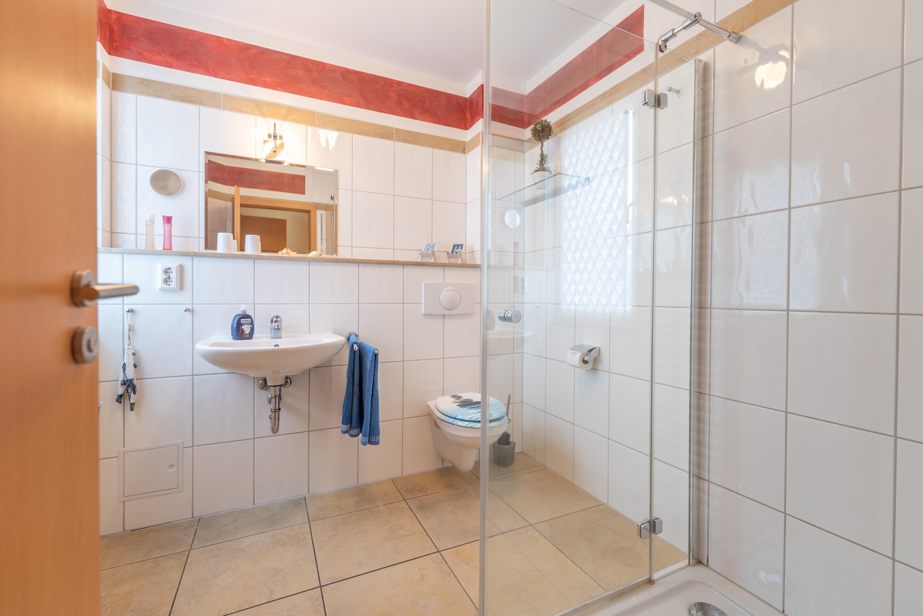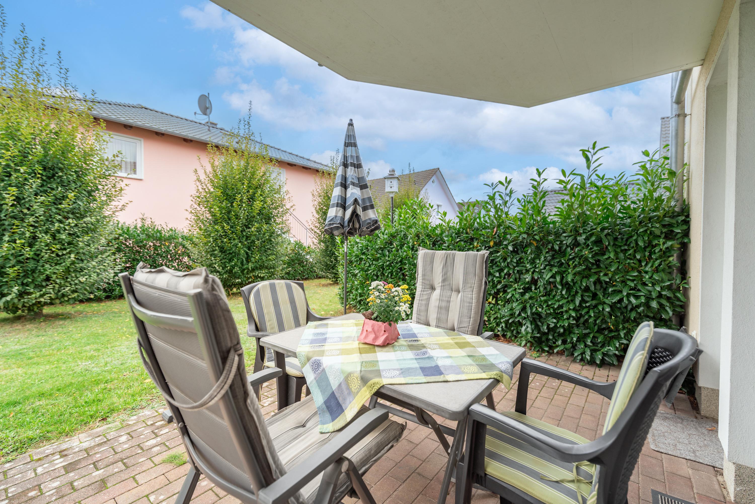 Auf der sonnigen Süd-Terrasse können Sie entspannte Stunden im Freien genießen und haben direkten Zugang zum weitläufigen Garten. Das zeitgemäß eingerichtete Bad überzeugt mit einer ebenerdigen Dusche, WC und Haartrockner.