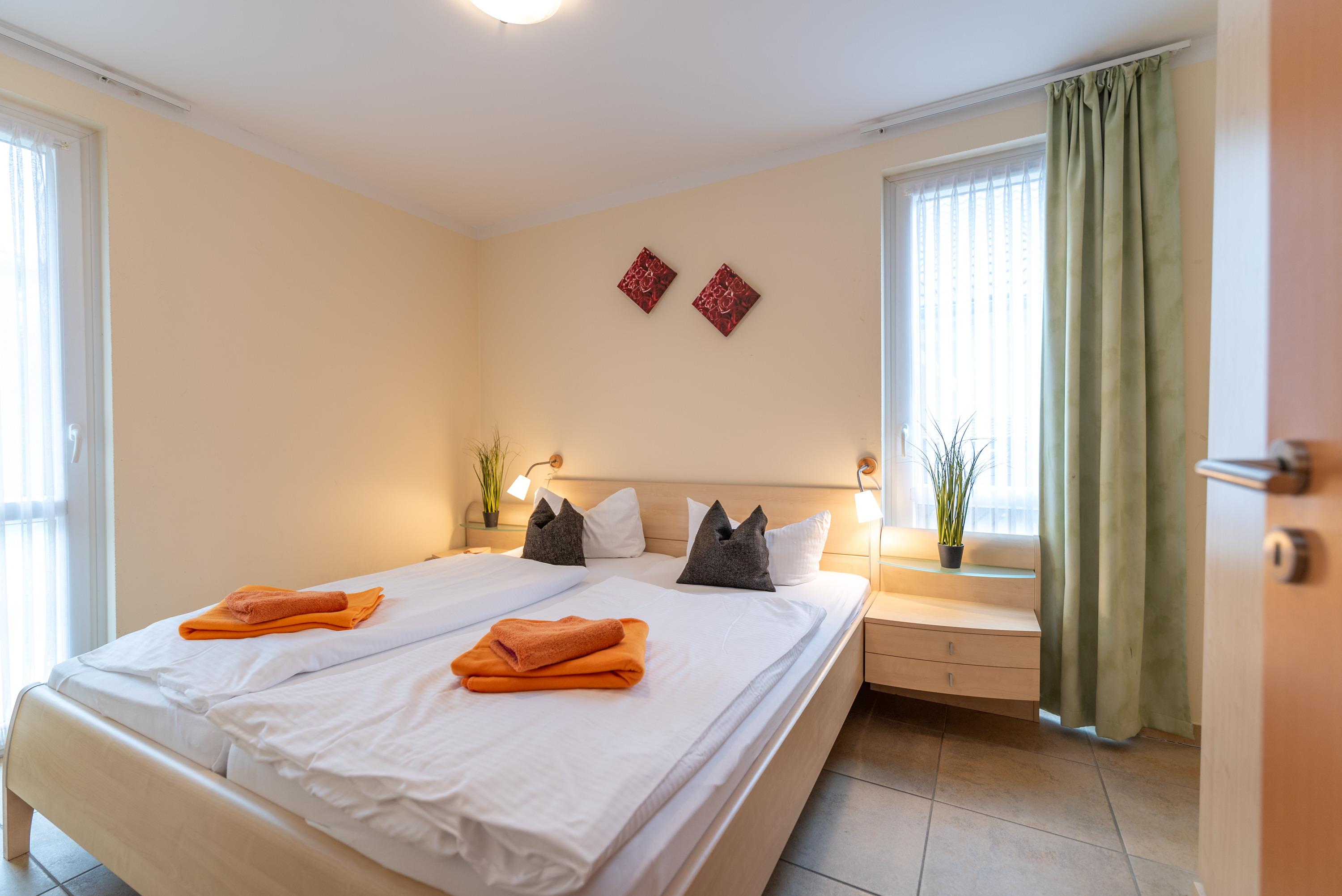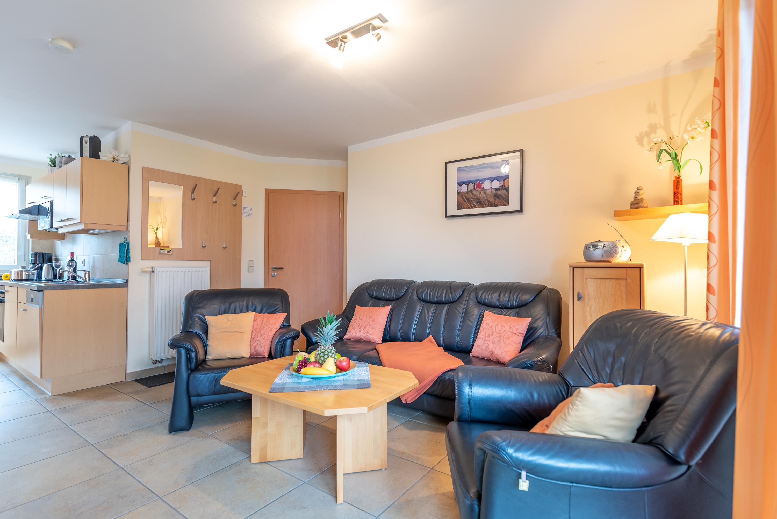 Das Schlafzimmer ist mit einem komfortablen Doppelbett eingerichtet, während der modern gestaltete Wohnbereich eine ausziehbare Ledercouch, einen Esstisch für vier Personen sowie einen Flachbild-SAT-TV und ein CD-Radio bereithält. Die offene Küchenzeile ist vollständig ausgestattet und erlaubt Ihnen, Mahlzeiten nach eigenen Vorstellungen zuzubereiten. Kostenfreies WLAN steht während Ihres Aufenthalts zur Verfügung.