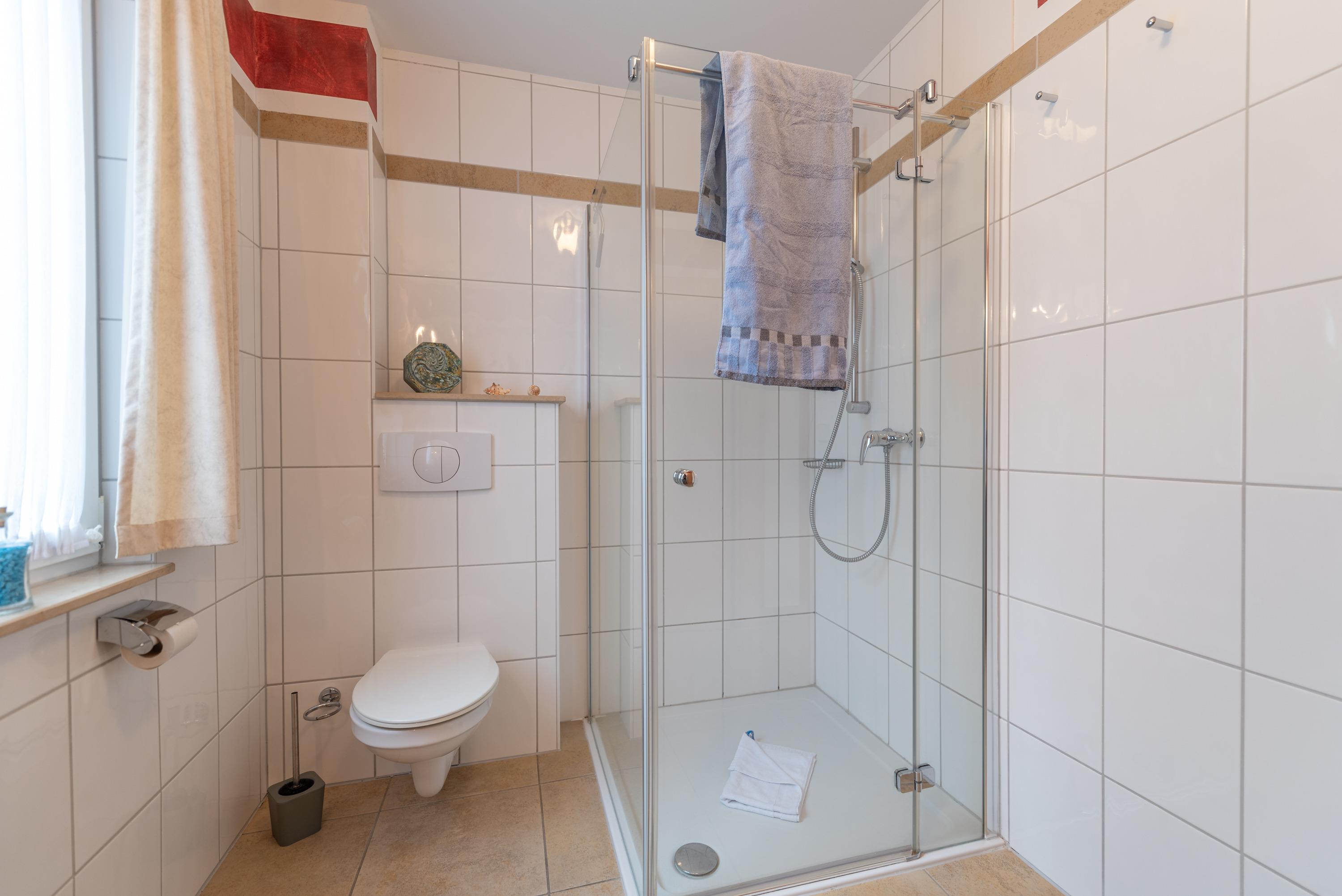 Auf der sonnigen Südterrasse mit Blick in den großzügigen Garten können Sie wunderbar entspannen. Das Bad überzeugt mit einer ebenerdigen Dusche, WC und Föhn.