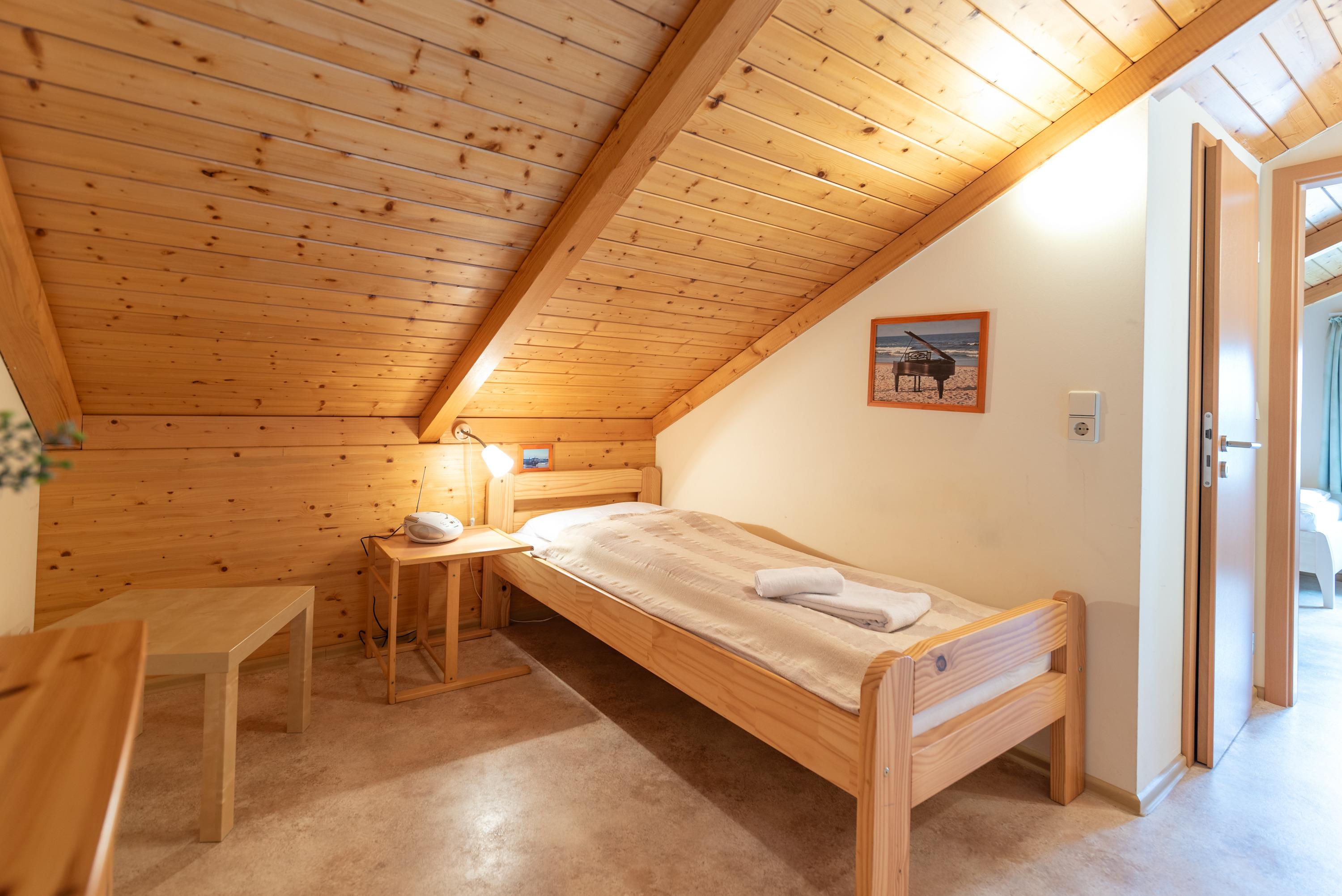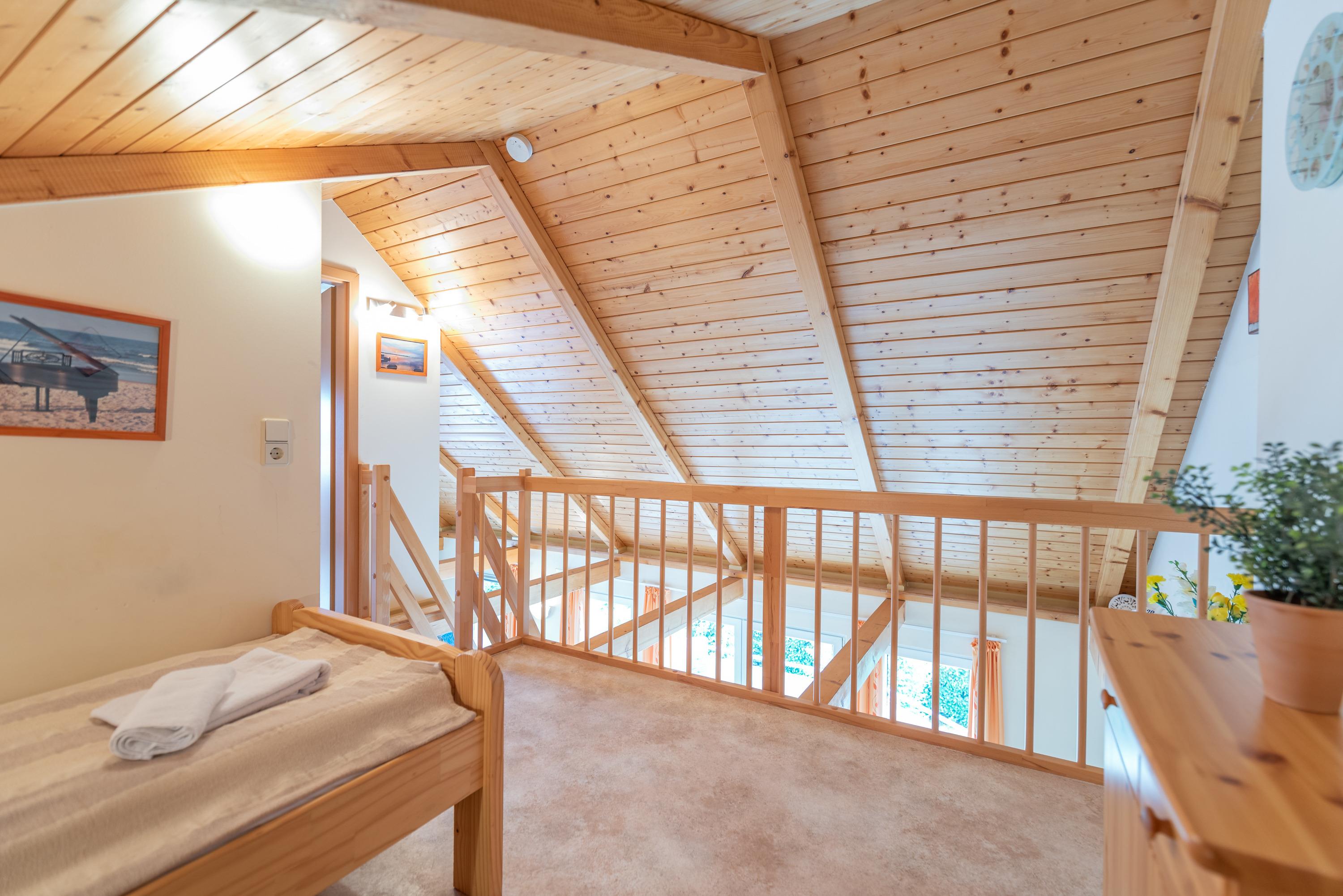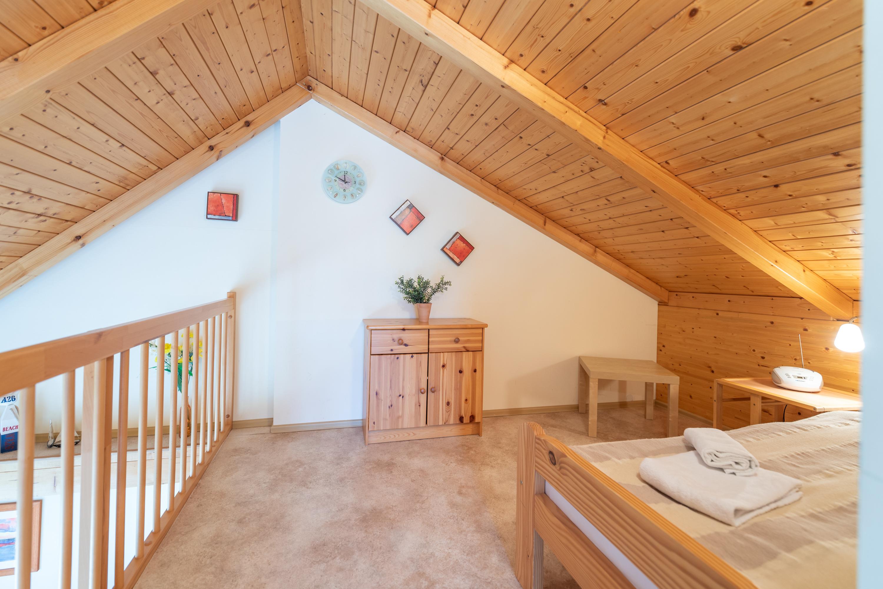 Im unteren Bereich erwartet Sie ein helles Schlafzimmer mit Doppelbett. Im ausgebauten Dachgeschoss befinden sich zwei weitere Schlafgelegenheiten in separaten Einzelbetten. Ein drittes Einzelbett ist im offenen Dachraum neben dem zweiten Schlafzimmer untergebracht und eignet sich perfekt für eine zusätzliche Person.
