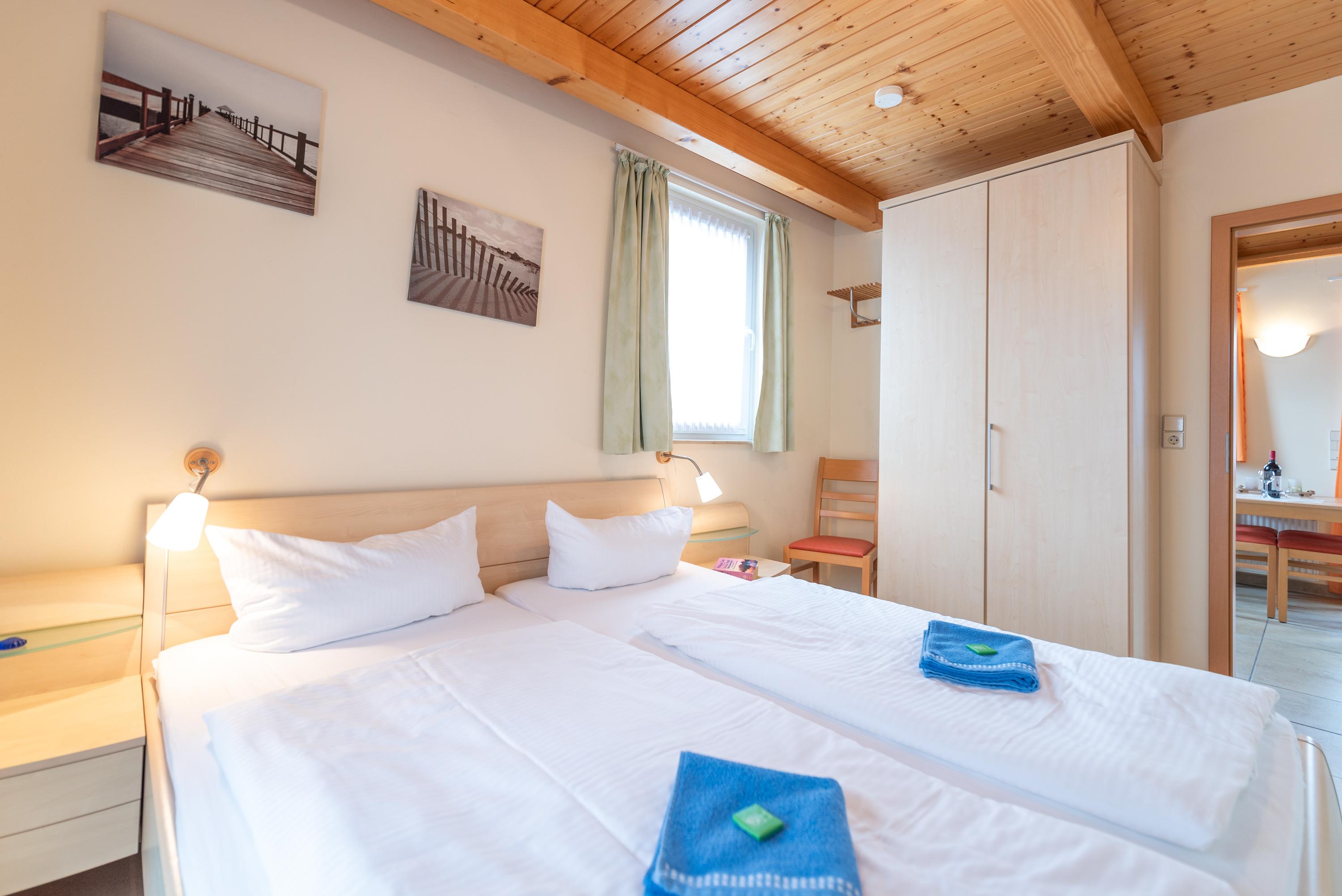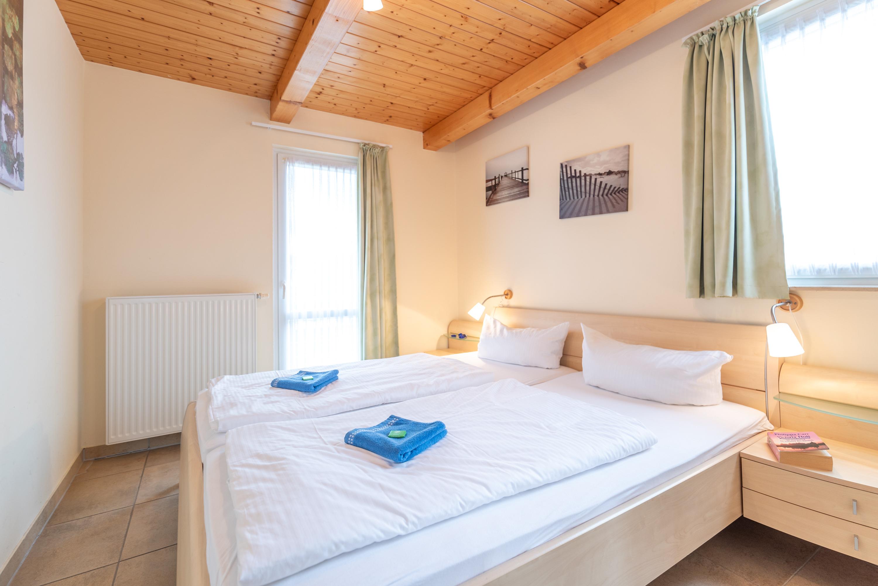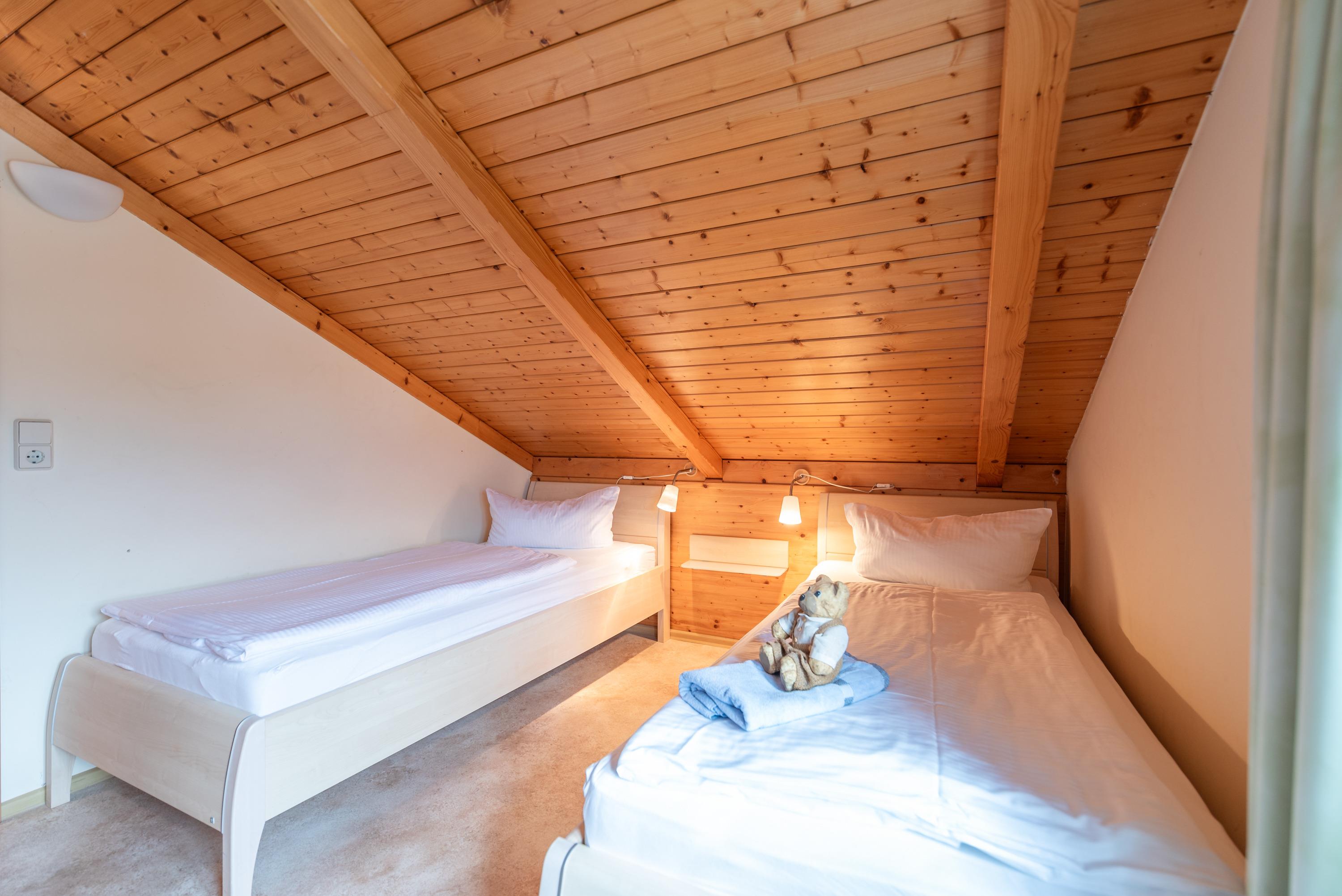 Im unteren Bereich erwartet Sie ein helles Schlafzimmer mit Doppelbett. Im ausgebauten Dachgeschoss befinden sich zwei weitere Schlafgelegenheiten in separaten Einzelbetten. Ein drittes Einzelbett ist im offenen Dachraum neben dem zweiten Schlafzimmer untergebracht und eignet sich perfekt für eine zusätzliche Person.