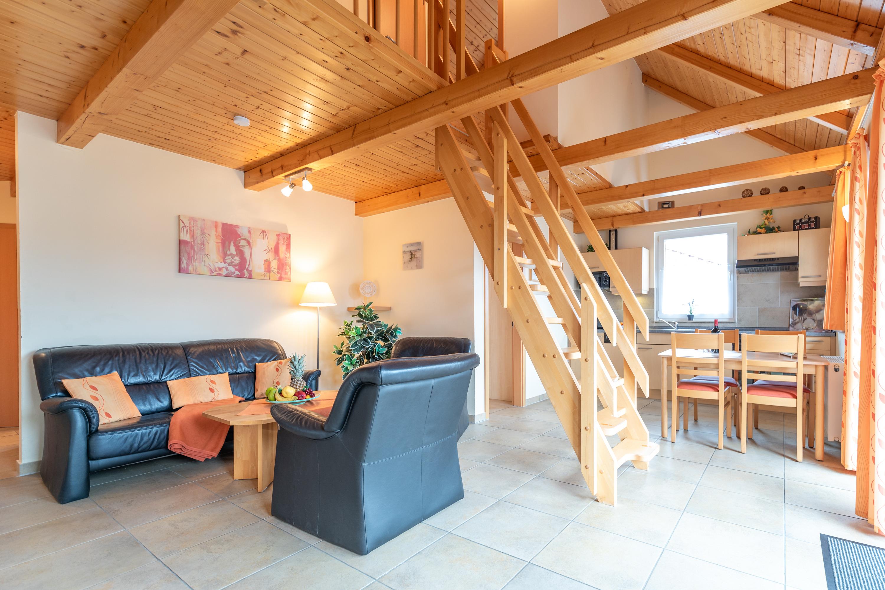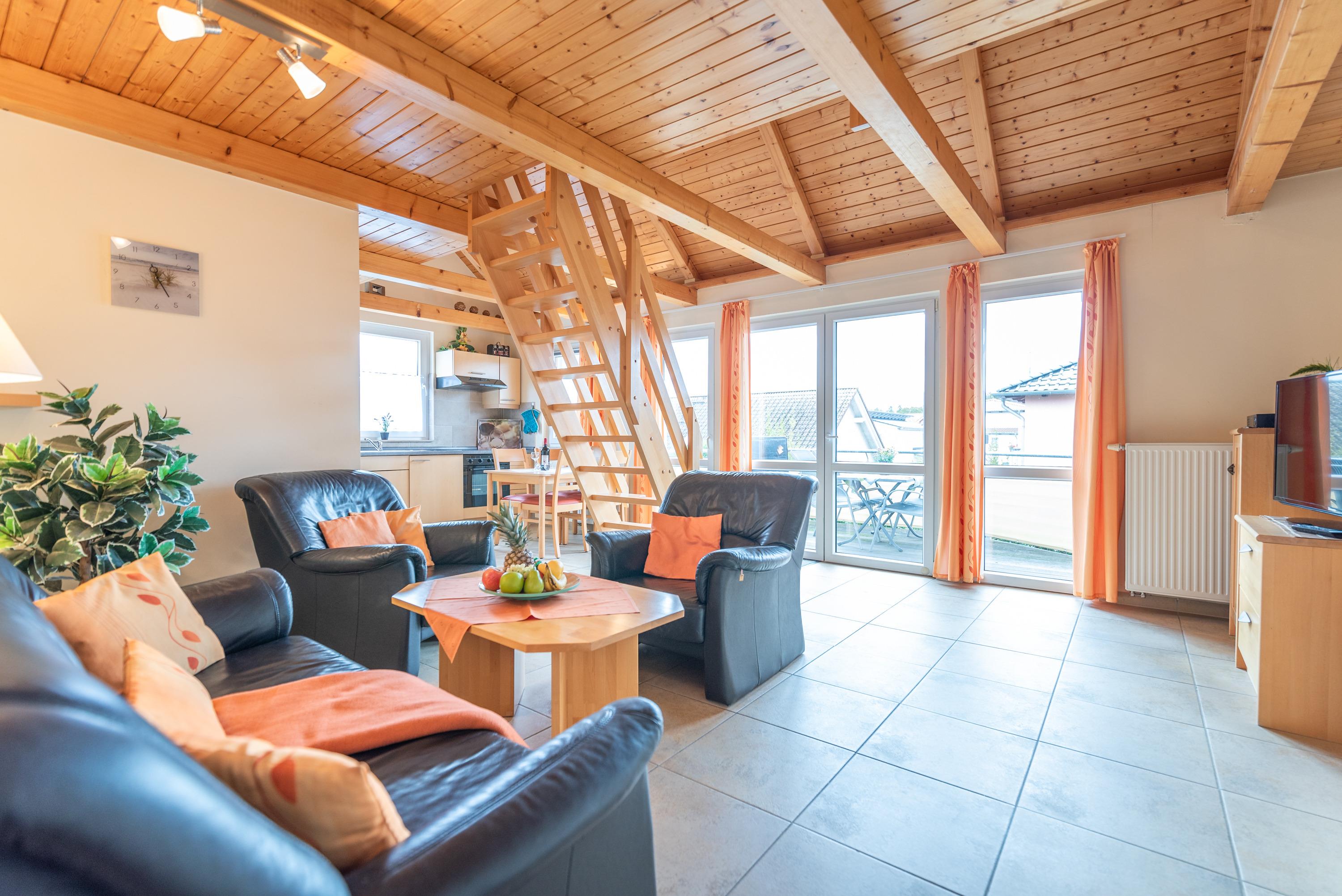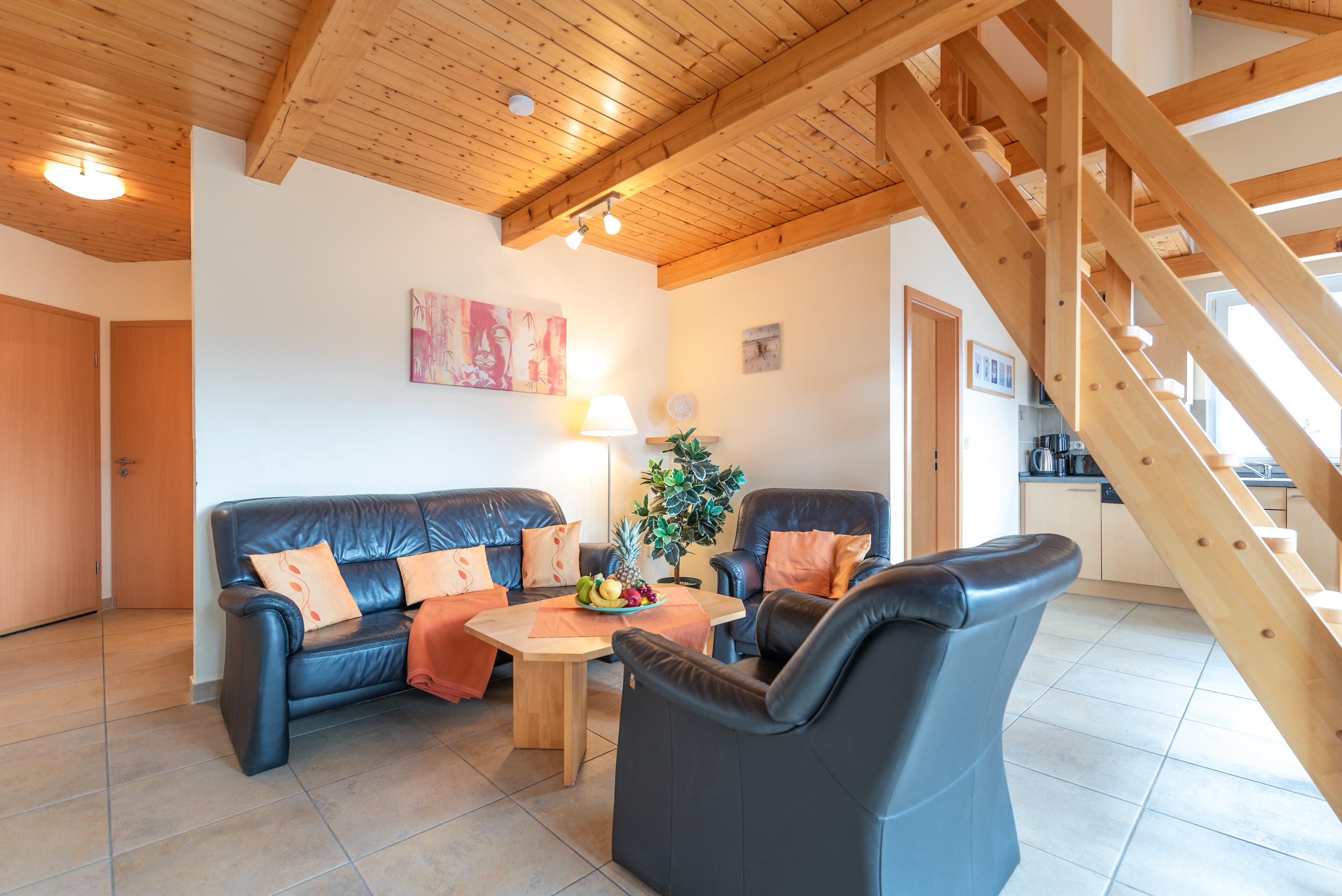 Zur Wohnung gehören ein modernes Bad mit Duschwanne, ein separates Gäste-WC im Dachgeschoss, sowie ein behaglicher Wohnbereich, der zum geselligen Beisammensein einlädt. Hier stehen eine gemütliche Ledercouch, ein Esstisch für fünf Personen, ein Flachbild-SAT-TV (Full HD/LED) und ein CD-Radio bereit. Die vollständig ausgestattete Küchenzeile ermöglicht eine unkomplizierte Selbstversorgung. Kostenloses WLAN ist selbstverständlich vorhanden.
