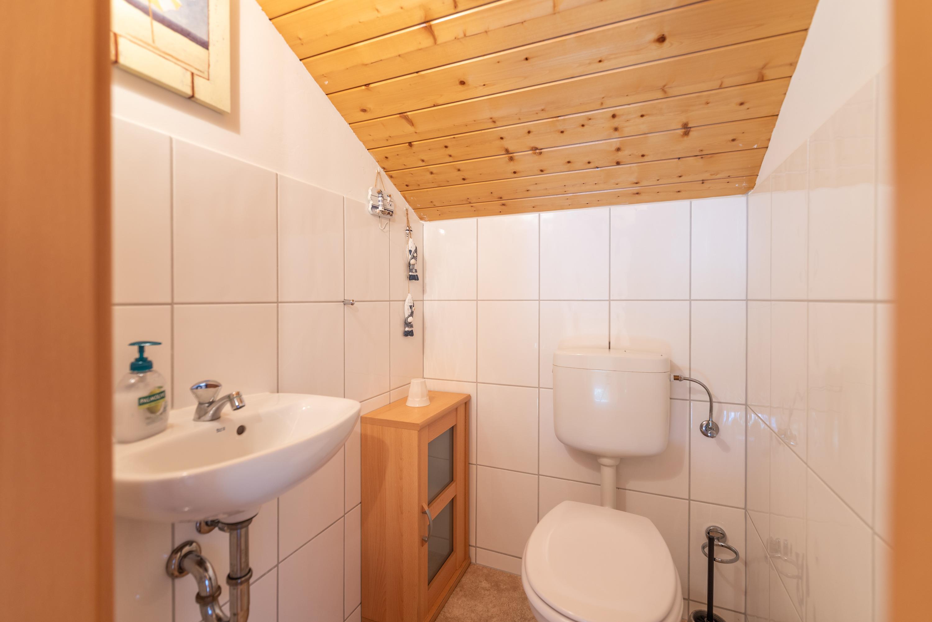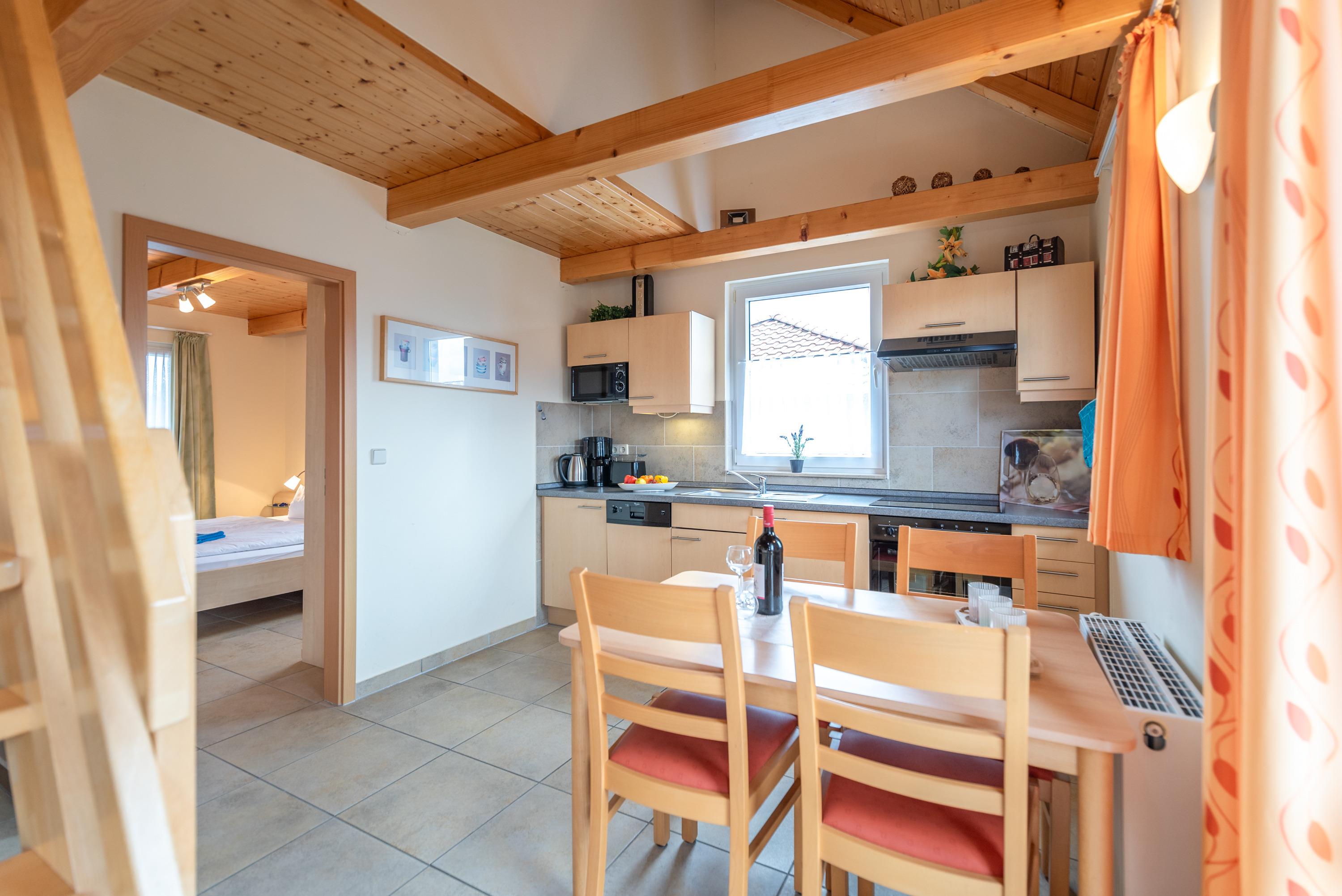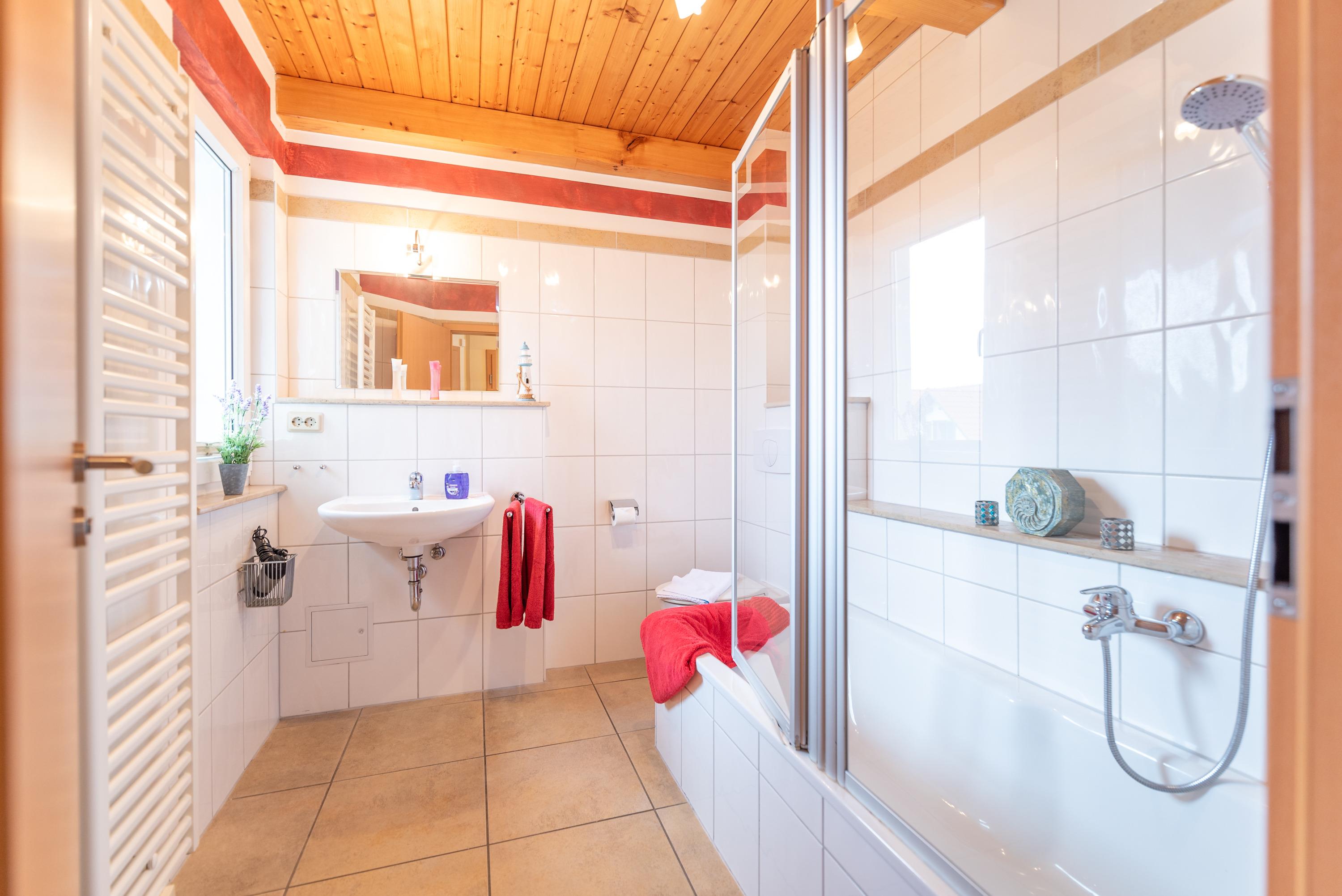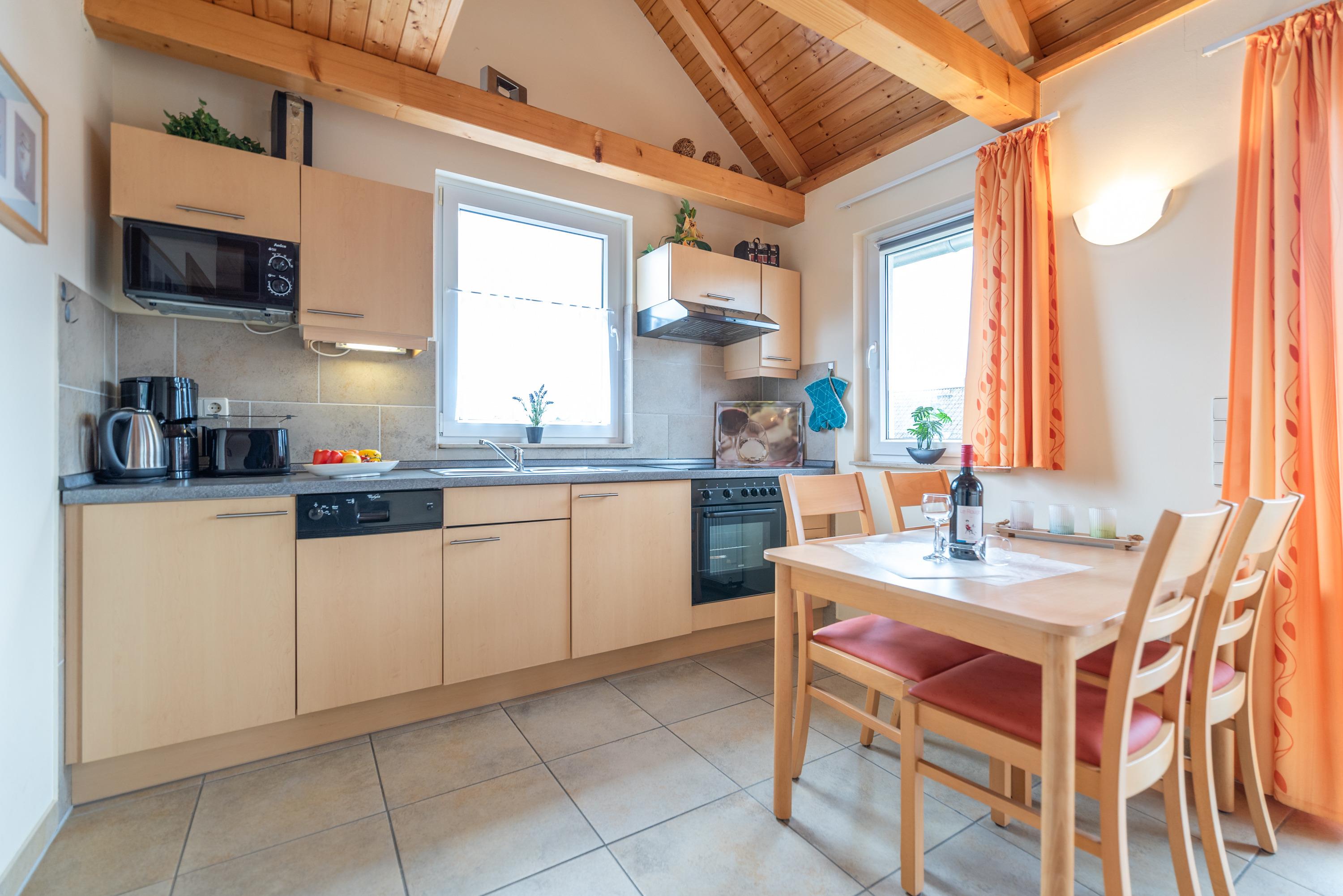 Zur Wohnung gehören ein modernes Bad mit Duschwanne, ein separates Gäste-WC im Dachgeschoss, sowie ein behaglicher Wohnbereich, der zum geselligen Beisammensein einlädt. Hier stehen eine gemütliche Ledercouch, ein Esstisch für fünf Personen, ein Flachbild-SAT-TV (Full HD/LED) und ein CD-Radio bereit. Die vollständig ausgestattete Küchenzeile ermöglicht eine unkomplizierte Selbstversorgung. Kostenloses WLAN ist selbstverständlich vorhanden.