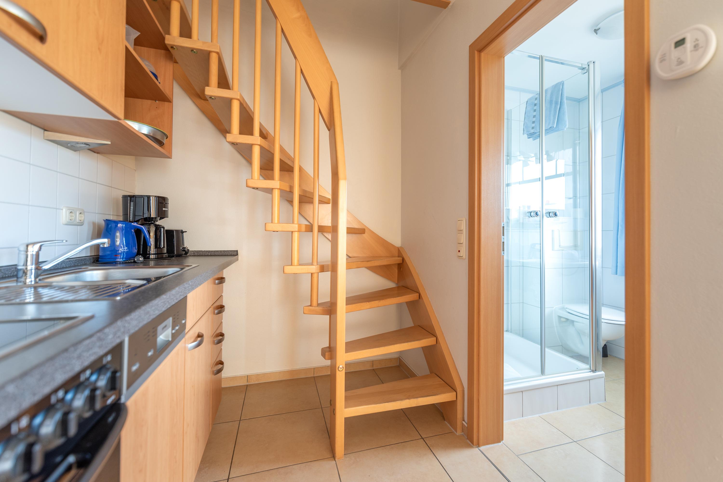 Im gefliesten Obergeschoss erwartet Sie ein freundlich gestalteter Wohnbereich mit einer vollständig ausgestatteten Küchenzeile, die alles bereithält, um unkompliziert eigene Mahlzeiten zuzubereiten. Ebenfalls auf dieser Ebene befindet sich das moderne Badezimmer mit Dusche und WC, das zusätzlichen Komfort bietet.