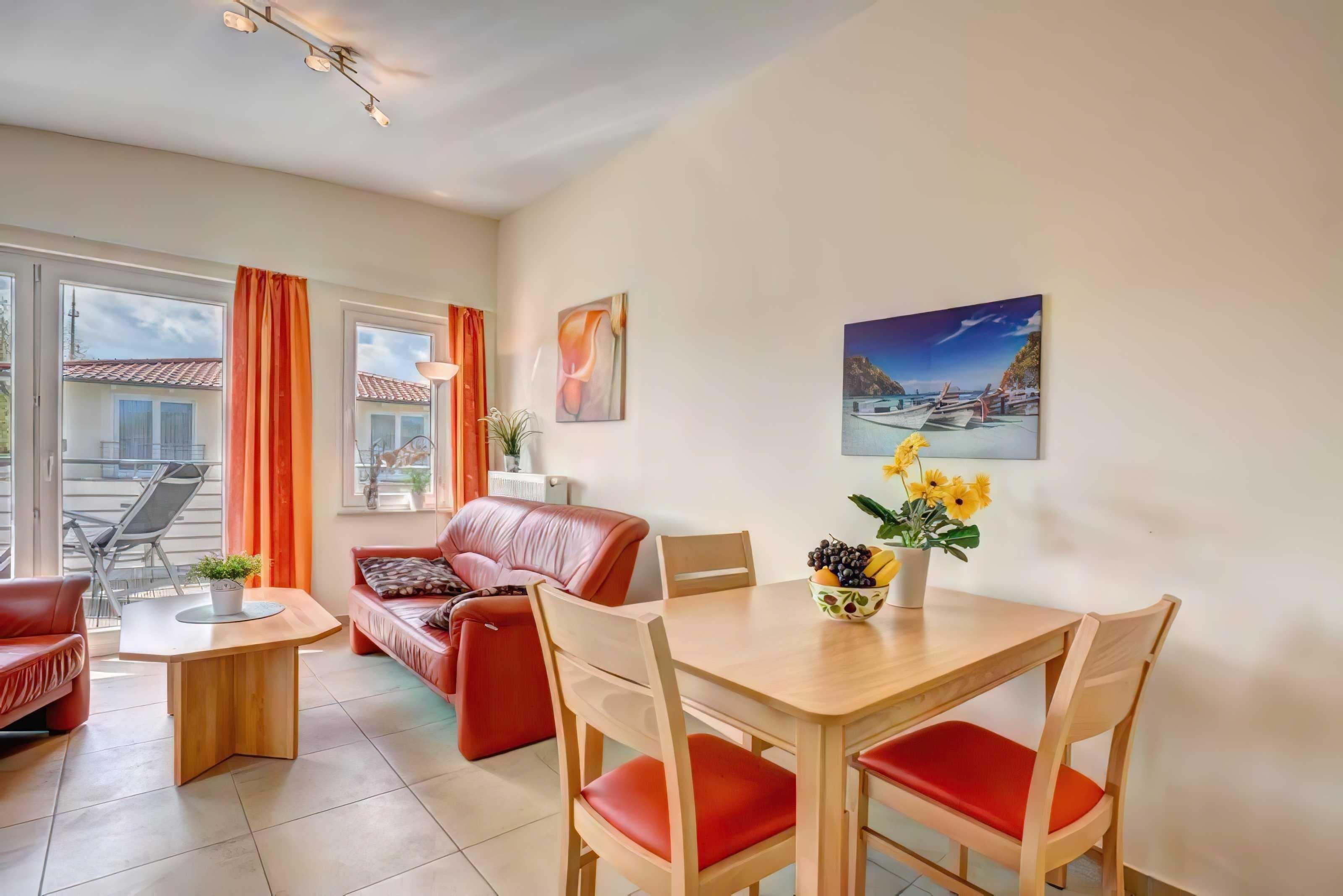 Die gemütlichen Dachgeschosswohnungen mit großem Balkon und einer Wohnfläche von 48 m² sind für bis zu 3 Personen geeignet. Die Nichtraucherwohnungen haben eine gehobene, komplett ausgestattete Küche, mit Mikrowelle, Backofen und Spülmaschine, SAT-TV.