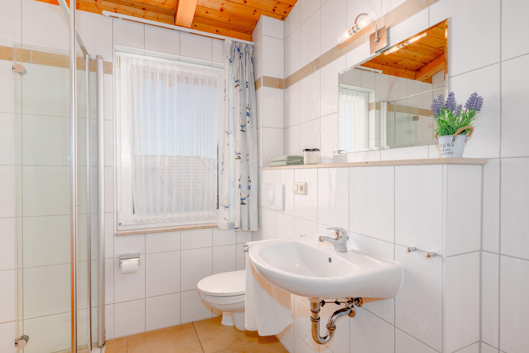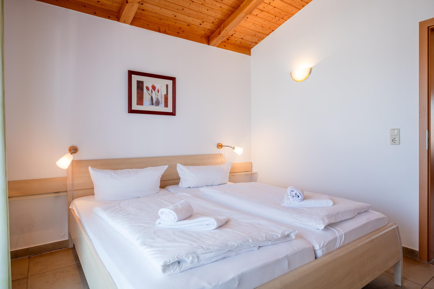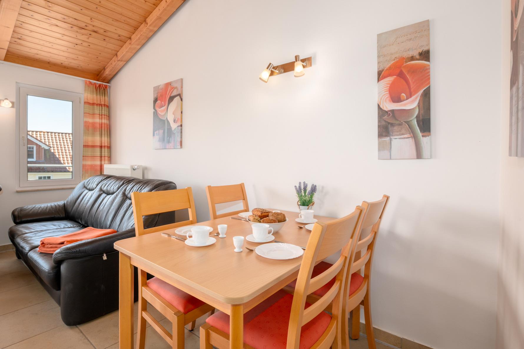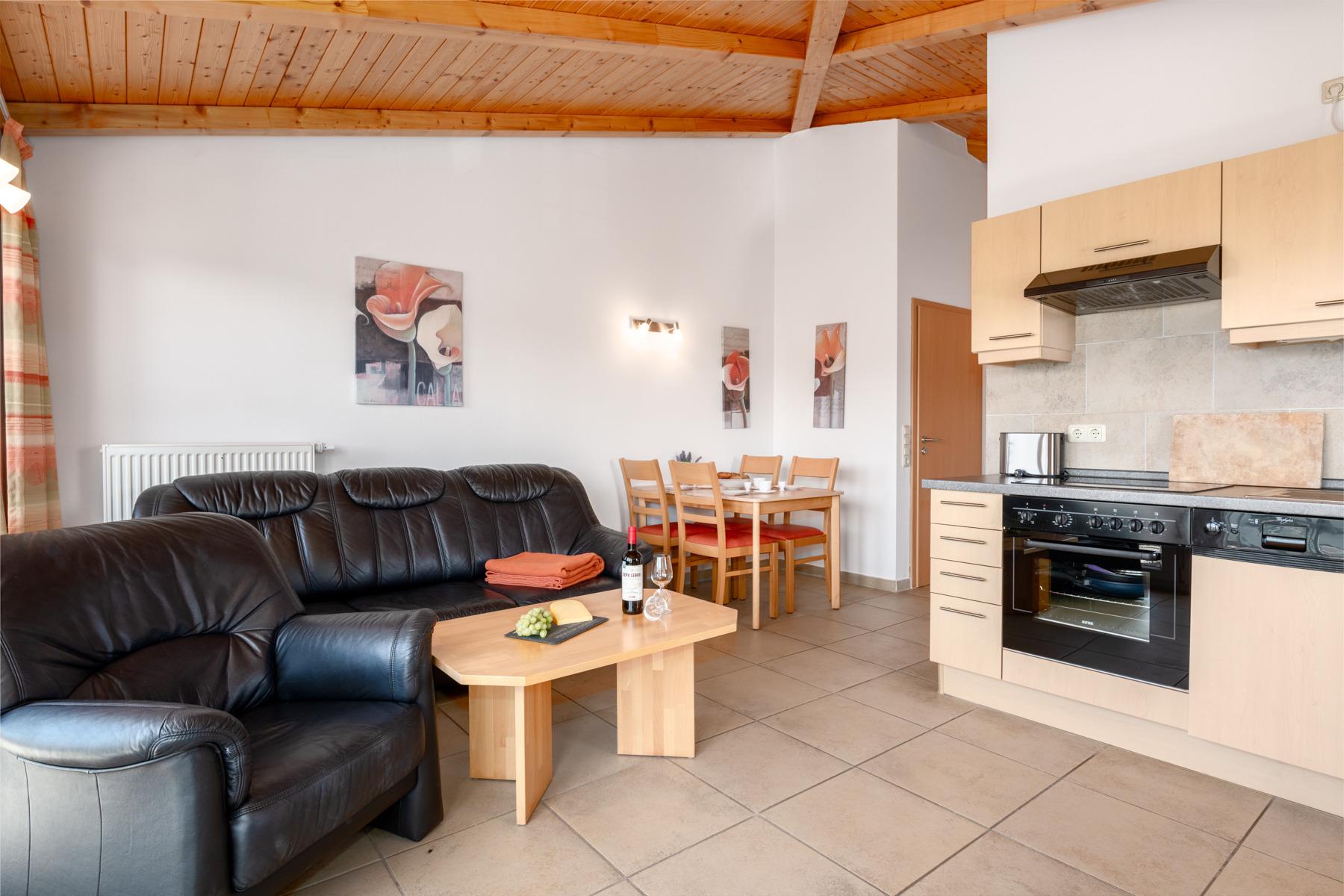 Die Dachgeschosswohnungen sind geeignet für bis zu 2 Personen und verfügen über einen großen Balkon sowie eine Wohnfläche von 48 m². Sie sind Nichtraucherwohnungen und bieten eine gehobene Ausstattung mit einer komplett ausgestatteten Küche, inklusive Mikrowelle, Backofen und Spülmaschine. Zudem gibt es SAT-TV in den Wohnungen. Das Badezimmer ist mit einer Dusche und einem WC ausgestattet. Ein Parkplatz ist im Preis inbegriffen.