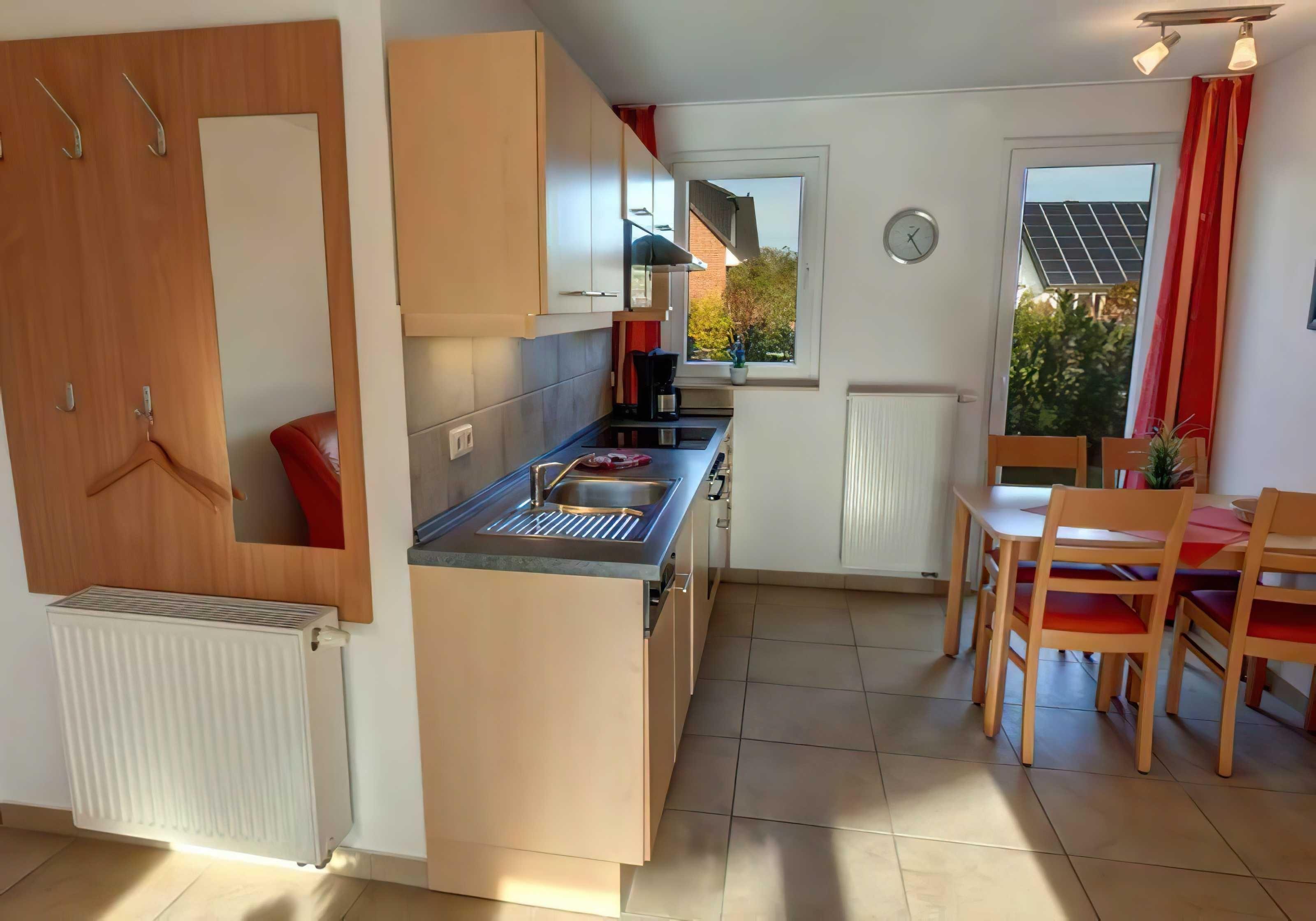 Die Ausstattung der Ferienwohnung lässt keine Wünsche offen. Zur Unterhaltung steht ein Flachbildfernseher zur Verfügung und für Ihre Fahrräder gibt es eine Abstellmöglichkeit. Ein eigener Parkplatz sorgt für bequemes Parken während Ihres Aufenthalts. Dank WLAN / Internet bleiben Sie auch im Urlaub problemlos online. In der offenen Wohnküche können Sie sich selbst verpflegen und finden dafür eine Mikrowelle sowie einen Geschirrspüler vor. Besonders schön ist die Terrasse, auf der Sie bei gutem Wetter die Sonne genießen können. Auch Ihr vierbeiniger Freund ist in der Ferienwohnung herzlich willkommen.