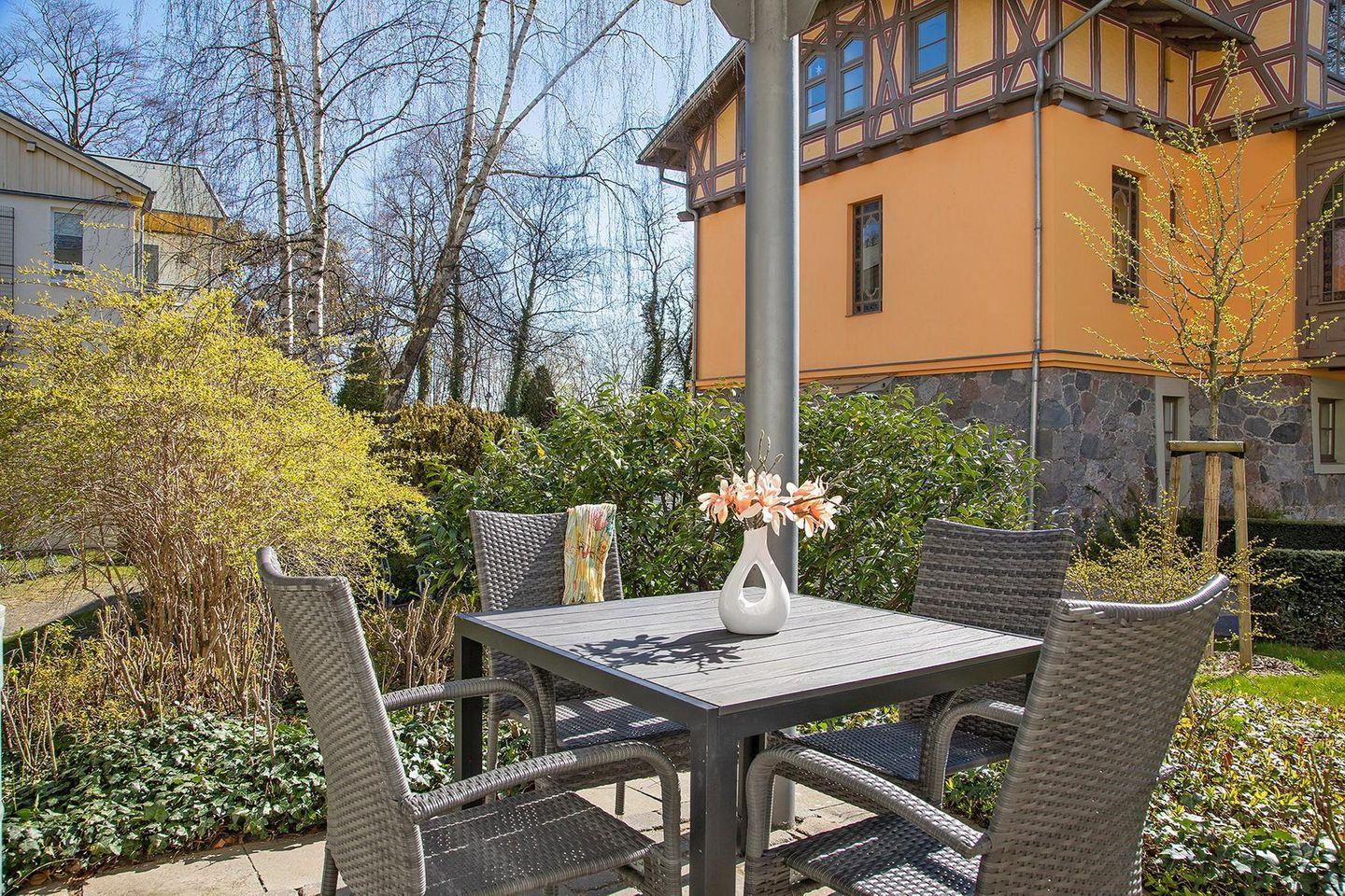 Die 44 m² große 2-Zimmer Ferienwohnung ist für bis zu 3 Personen geeignet. Hervorzuheben ist die überdachte Terrasse in Nord-Ost-Lage; hier blickt ihr auf die historische Villa und könnt die Morgensonne genießen.