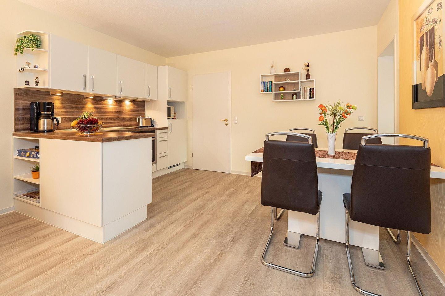 Die 57 m² große 3-Zimmer Ferienwohnung ist für bis zu 4 Personen geeignet. Besonders hervorzuheben ist die überdachte Terrasse in südwestlicher Lage mit Zugang zum parkähnlichen Garten.