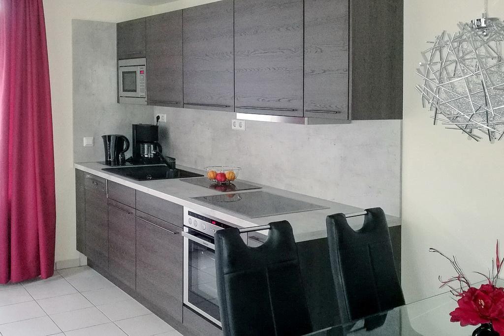 Zur Ferienwohnung gehört eine voll ausgestattete offene Küche mit Wasserkocher, Kaffeemaschine, Toaster, Herd mit Backofen, Geschirrspüler, Mikrowelle sowie Kühlschrank mit Gefrierfach.