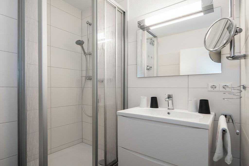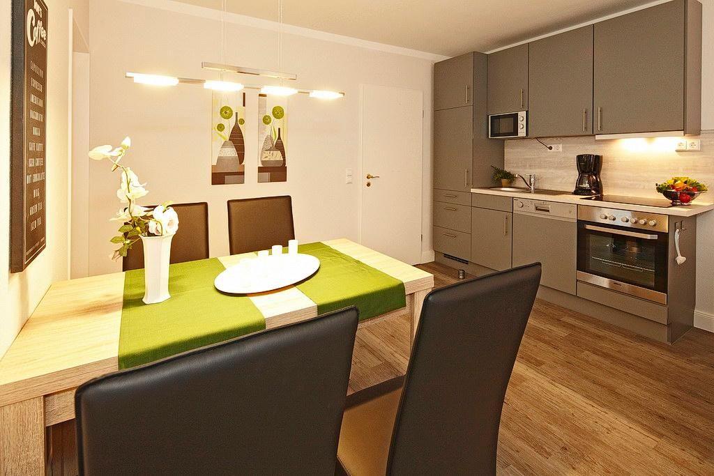 Das moderne Apartment bietet euch eine voll ausgestattete offene Küche mit Wasserkocher, Kaffeemaschine, Toaster, Ceranherd mit Backofen, Geschirrspüler, Mikrowelle und Kühlschrank mit Tiefkühlfach.