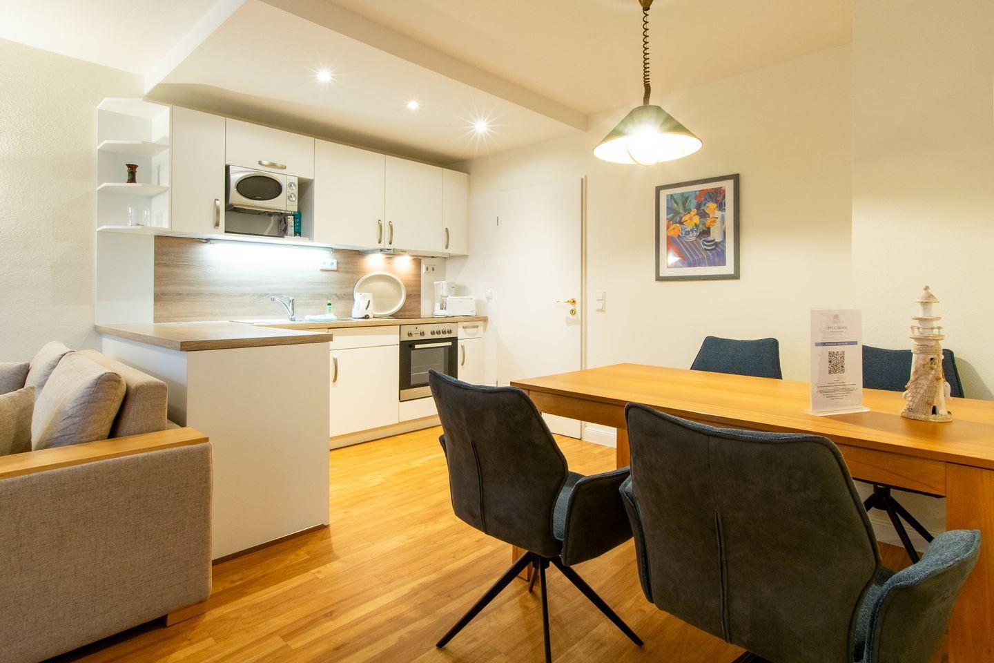 Das Apartment bietet euch eine voll ausgestattete offene Küche mit Wasserkocher, Kaffeemaschine, Toaster, Ceranherd mit Backofen, Geschirrspüler, Mikrowelle und Kühlschrank mit Tiefkühlfach.