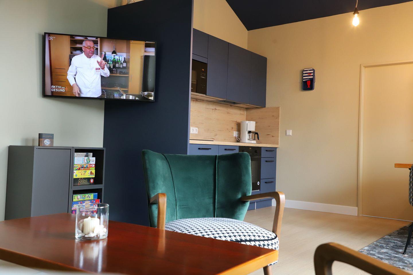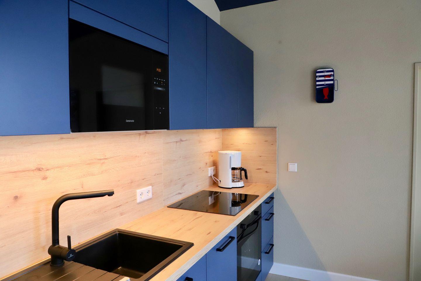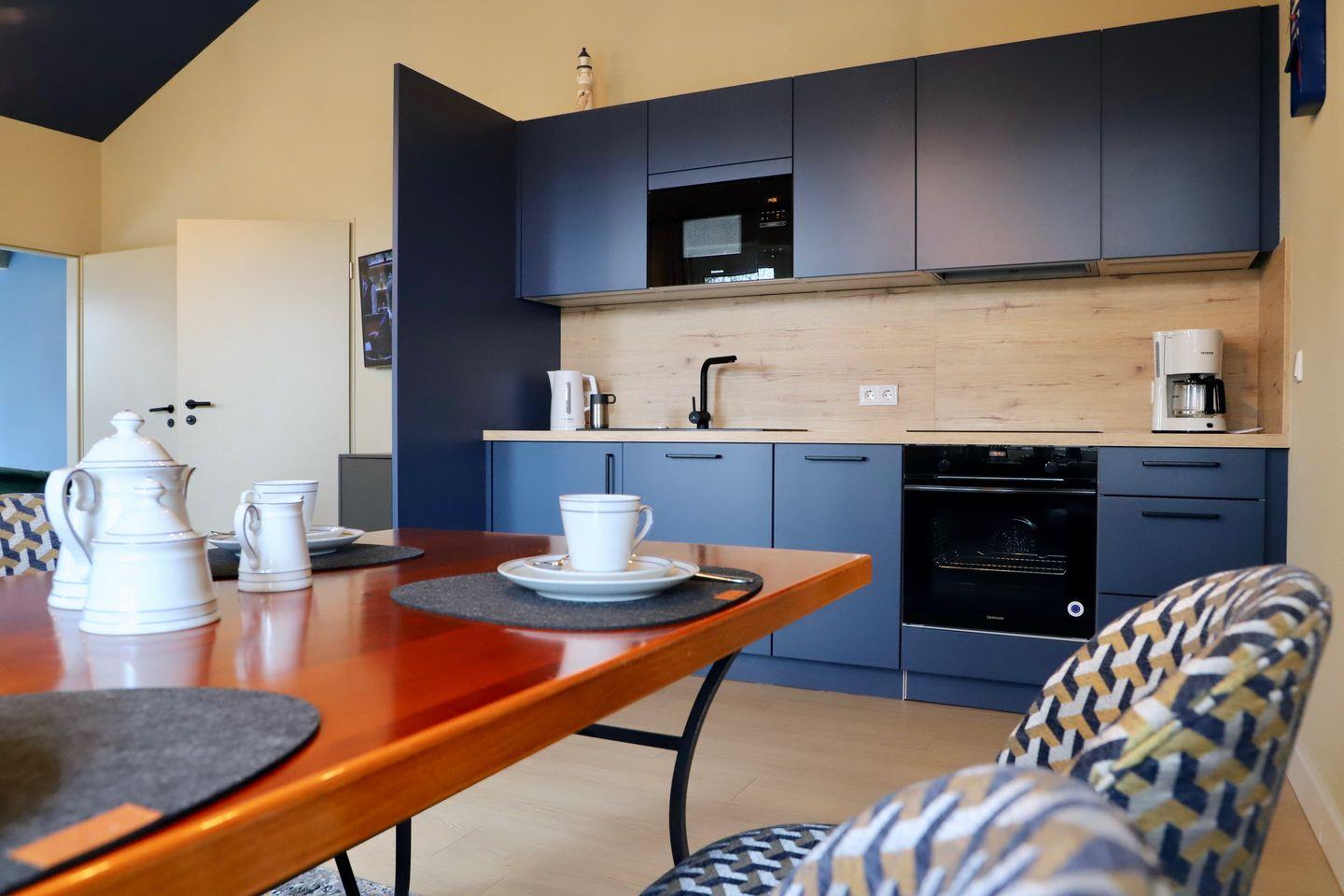 Das Apartment beinhaltet eine voll ausgestattete offene Küche mit Wasserkocher, Kaffeemaschine, Toaster, Herd mit Backofen, Geschirrspüler, Mikrowelle und einem Kühlschrank mit Gefrierfach.