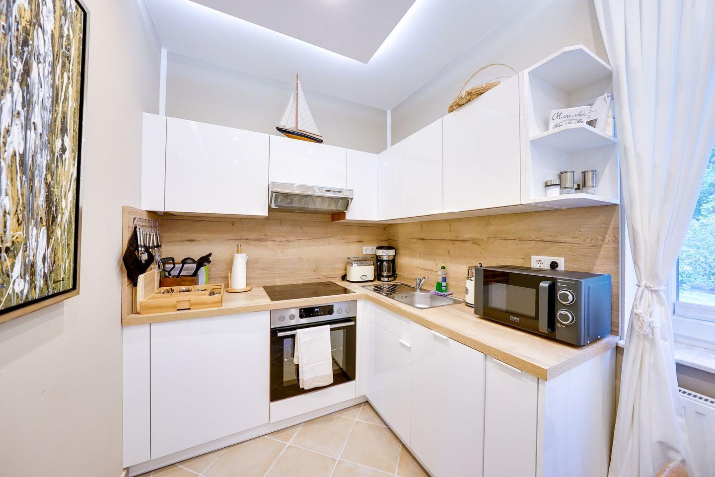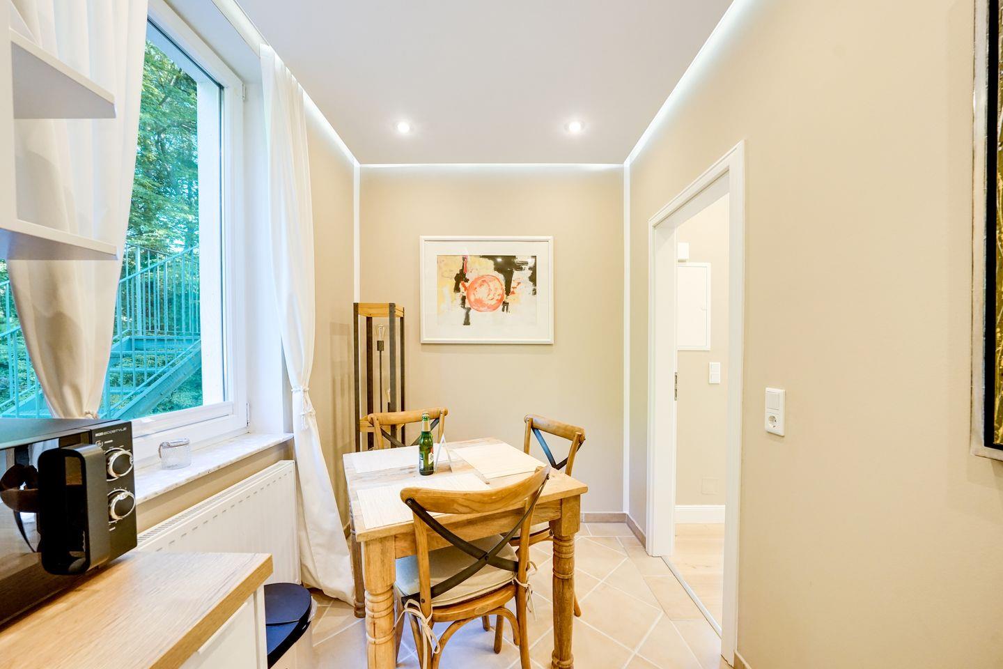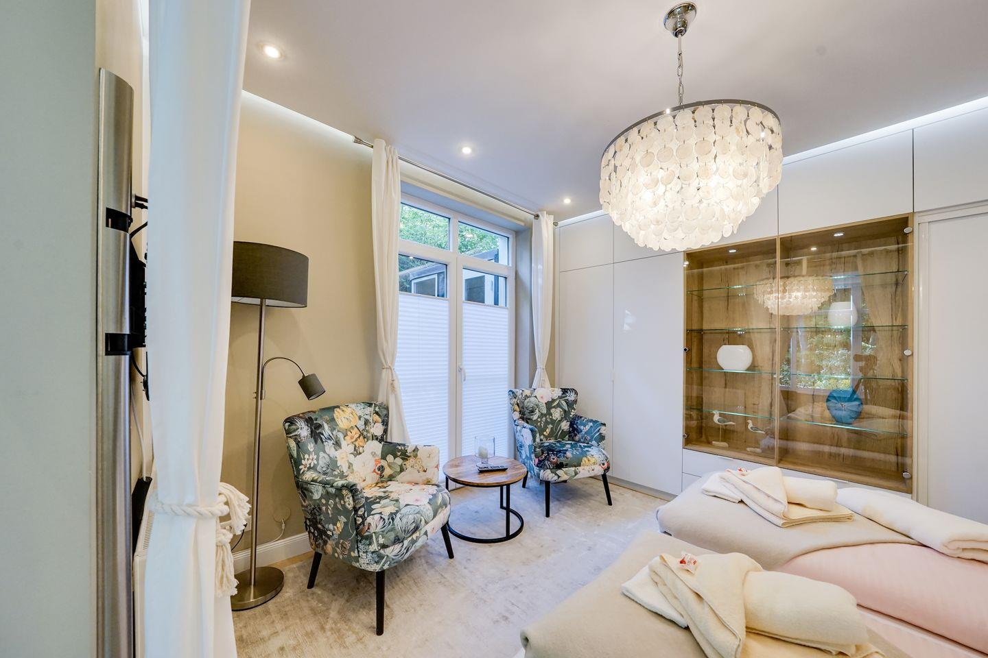 Die hochwertig ausgestattete Wohnung verfügt über ein geräumiges Wohnzimmer, das in das Schlafzimmer mit großem Bett übergeht. Zudem hat die Wohnung eine gut ausgestattete Wohnküche.