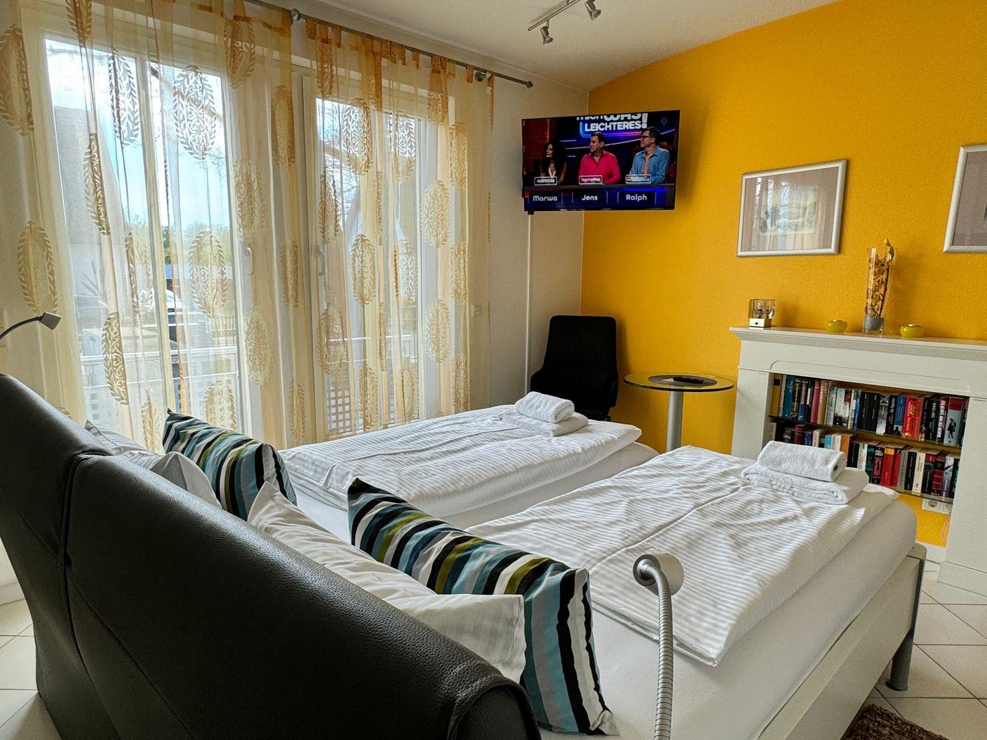 - im Schlafzimmer erwartet Sie ein hochwertiges Bett mit erhöhter Liegefläche, bei dem Kopf-, Rücken- und Fußteile elektrisch verstellbar sind sowie ein 2.TV