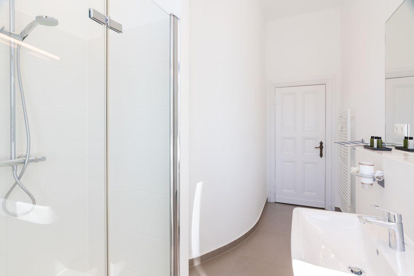Auch auf dieser Etage sorgen die hohen, lichtdurchfluteten Räume für eine Wohnatmosphäre der ganz besonderen Art. In der Villa Marie wurde der Charakter des alten Hauses geschmackvoll kombiniert mit den modernen Ansprüchen von heute. Im großzügigen Wohnzimmer gibt es neben einer gemütlichen Sitzecke einen modernen Smart-TV, der ein vielfältiges Unterhaltungsprogramm garantiert. Eine Schlafcouch bietet Platz für einen dritten Übernachtungsgast. Die moderne Einbauküche ist mit hochwertigen Markengeräten ausgestattet und lässt kaum einen Wunsch offen. Ein schöner Essplatz befindet sich in unmittelbarer Reichweite.