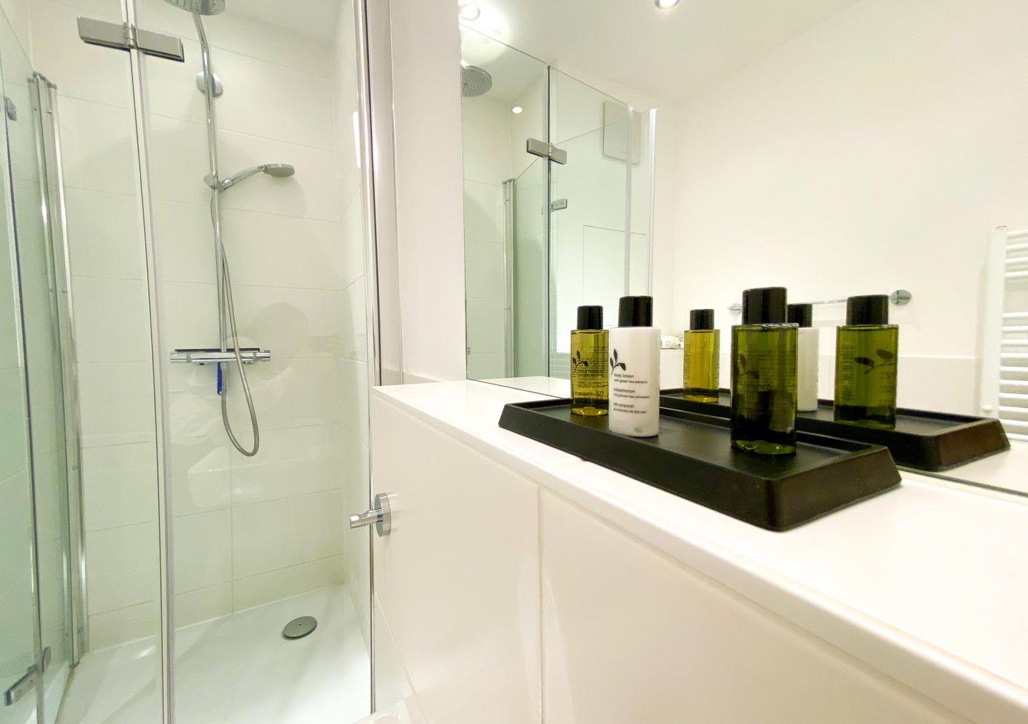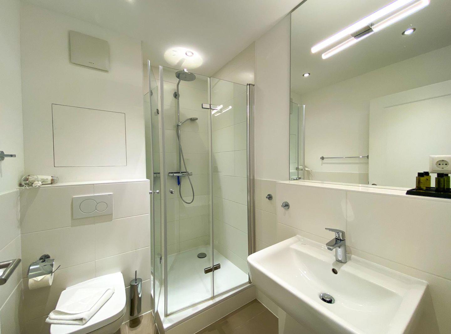Das Badezimmer wurde mit einer schönen Dusche, einem Waschbecken und WC ausgestattet. Ein Heizkörper-Handtuchhalter sowie die Fußbodenerwärmung runden das Angebot ab. Neben Handtüchern liegen auch Pflegeprodukte bereit.