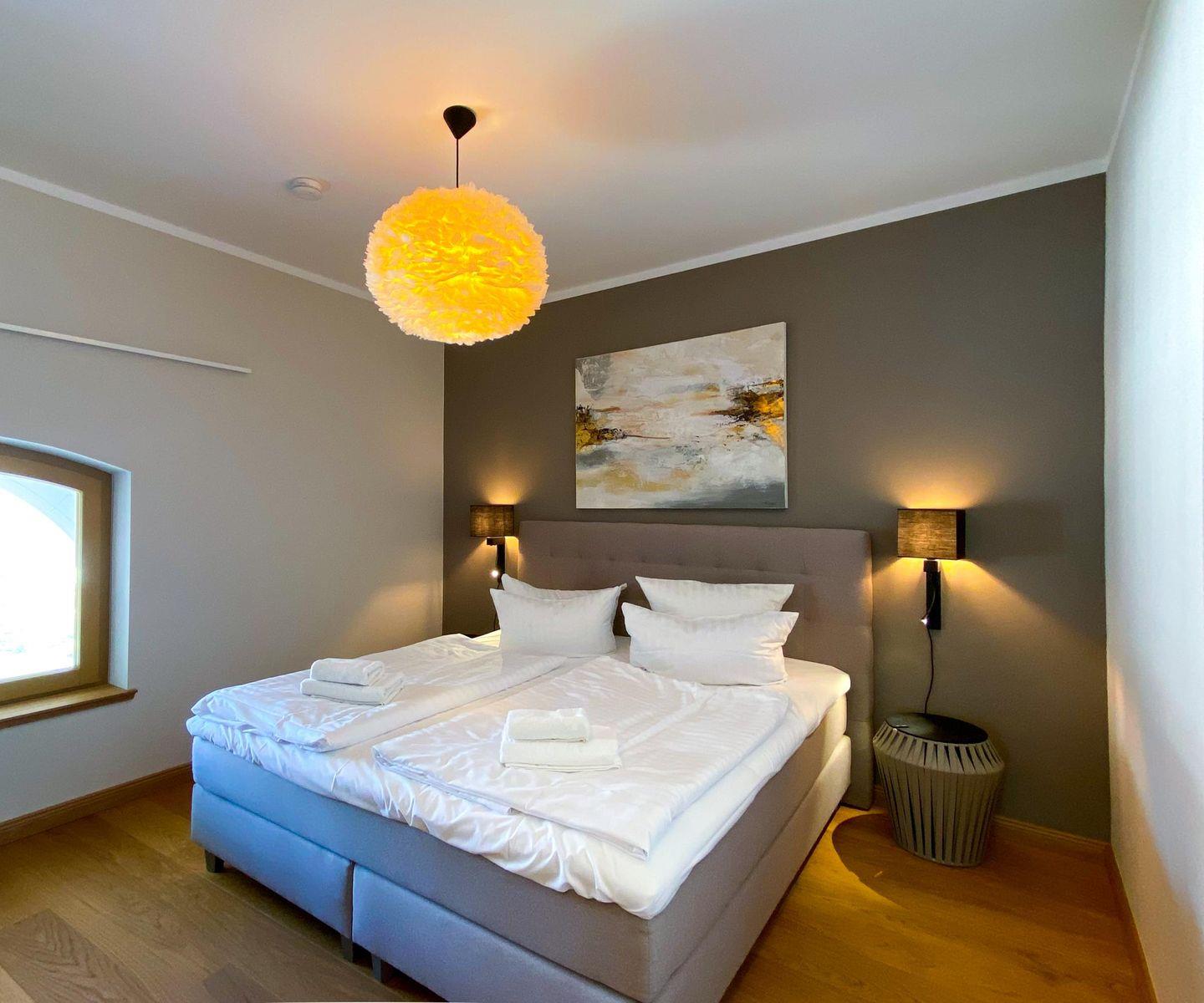 Auch hier gehört ein Smart-TV neben einem hochwertigen Box-Springbett und einem geräumigen Wandschrank zur Ausstattung.